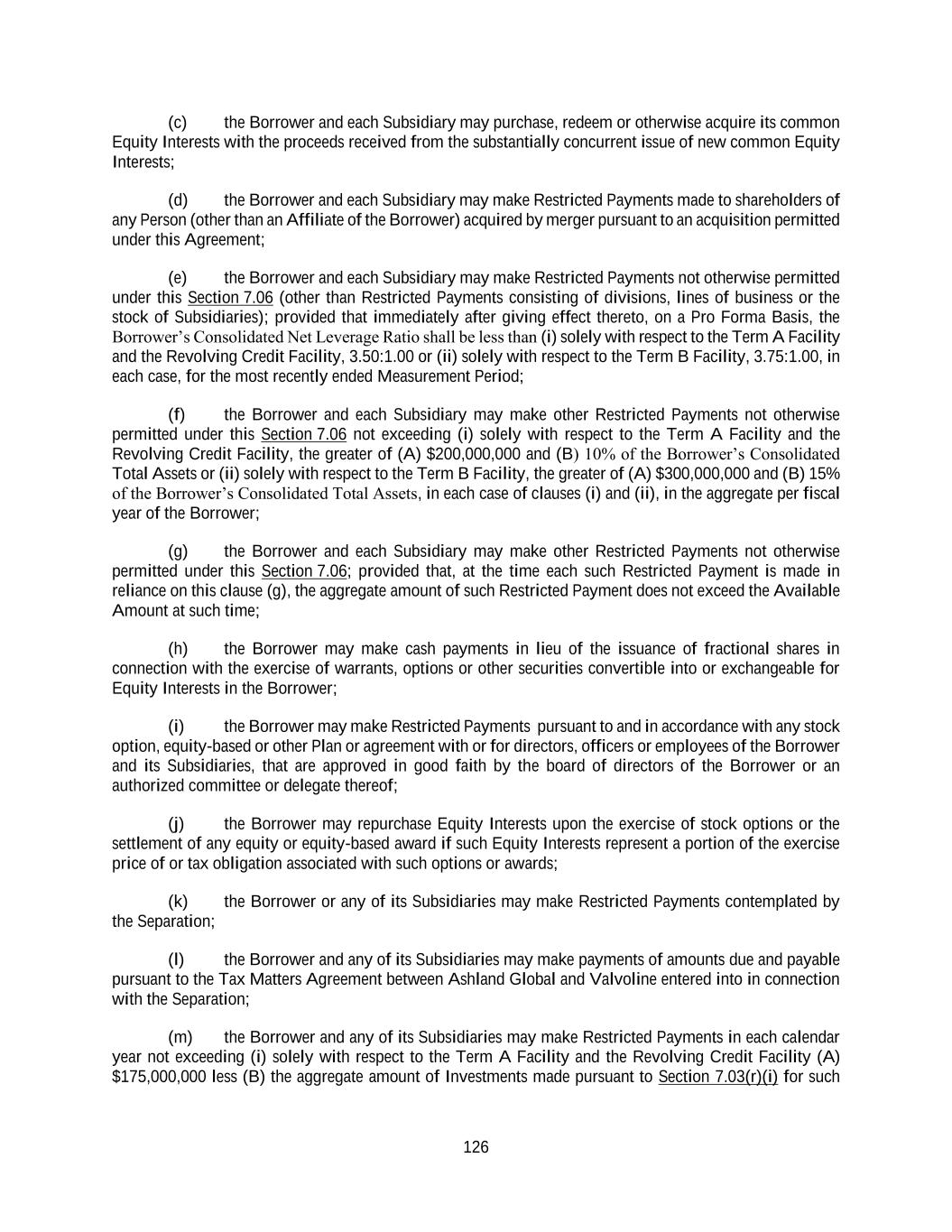 126(c)借款人及各附属公司可使用实质上同时发行的新普通股权益所获得的收益购买、赎回或以其他方式收购其普通股权益;(d)借款人及各附属公司可向根据本协议允许的收购通过合并获得的任何人(借款人的关联公司除外)的股东作出限制性付款;(e)借款人及各附属公司可作出本条第7.06条不允许的限制性付款(由分部组成的限制性付款除外,业务线或子公司的存量);但在紧接其生效后,在备考基础上,借款人的综合净杠杆比率应低于(i)仅就期限A融资和循环信贷融资而言,3.50:1.00或(ii)仅就期限B融资而言,3.75:1.00,在每种情况下,对于最近结束的计量期;(f)借款人和各附属公司可作出本条第7.06条不允许的其他限制性付款,但不得超过(i)仅就期限A融资和循环信贷融资,(a)200,000,000美元和(b)借款人合并总资产的10%或(ii)仅就期限B融资,以(a)300,000,000美元和(b)借款人合并总资产的15%中的较高者为准,在第(i)和(ii)条的每种情况下,按借款人每个财政年度的总额计算;(g)借款人及各附属公司可作出本条第7.06条不允许的其他限制性付款;但在依据本条(g)款作出每笔此类限制性付款时,此类限制性付款的总额不超过当时的可用金额;(h)借款人可作出现金付款,以代替与行使认股权证有关的零碎股份的发行,可转换为或可交换为借款人股权的期权或其他证券;(i)借款人可根据或根据与借款人及其子公司的董事、高级职员或雇员的任何股票期权、股权或其他计划或协议进行限制性付款,经借款人的董事会或其授权委员会或委讬善意批准;(j)借款人可在行使股票期权或结算任何股权或基于股权的奖励时回购股权如该等股权代表该等期权或奖励的部分行使价或与其相关的税务义务;(k)借款人或其任何子公司可进行分立所设想的限制性付款;(l)借款人及其任何子公司可根据亚什兰与Valvoline就分立所订立的税务事项协议支付到期应付的款项;(m)借款人及其任何子公司可在每个自然年度仅就期限A融资进行不超过(i)的限制性付款和循环信贷融资(a)175000000美元减(b)根据第7.03(r)(i)节为此种融资进行的投资总额