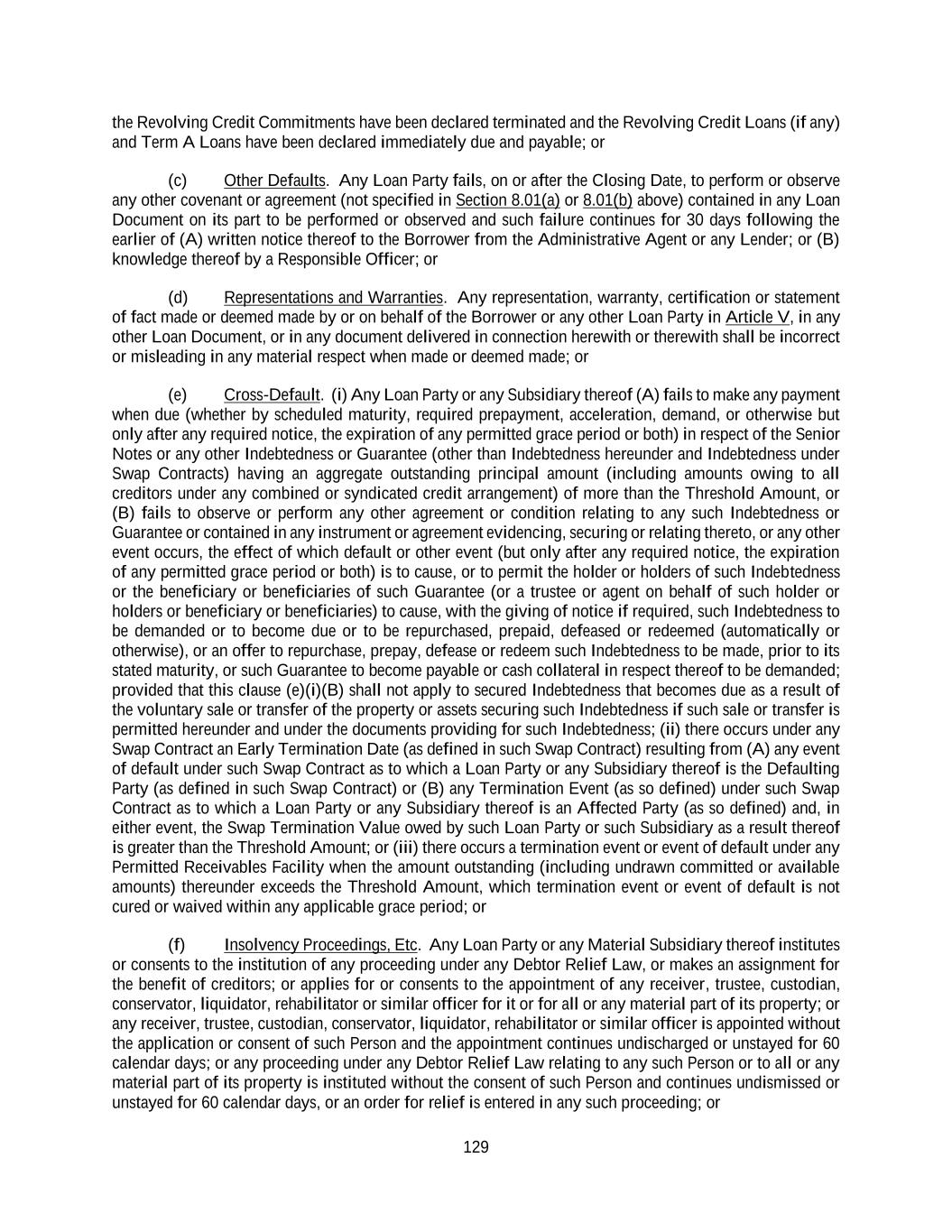 129循环信贷承诺已宣布终止,循环信贷贷款(如有)和A期贷款已宣布立即到期应付;或(c)其他违约。任何贷款方在截止日期当日或之后,没有履行或遵守任何贷款文件所载的任何其他契诺或协议(未在上文第8.01(a)或8.01(b)条中指明),而该等不履行在(a)行政代理人或任何贷款人向借款人发出的书面通知中较早者之后的30天内持续;或(b)由负责人员知悉;或(d)陈述和保证。由借款人或任何其他贷款方或其代表在第五条、任何其他贷款文件中作出或视为作出的任何陈述、保证、证明或事实陈述,在作出或视为作出时,应在任何重大方面不正确或具有误导性;或(e)交叉违约。(i)任何贷款方或其任何附属公司(a)未能就未偿本金总额(包括根据任何合并或银团信贷安排欠所有债权人的金额)超过阈值金额的优先票据或任何其他债务或担保(本协议项下的债务和掉期合同项下的债务除外)在到期时(无论是通过预定到期日、要求提前还款、加速还款、要求还款或其他方式但仅在任何必要通知、任何允许的宽限期到期后或两者兼而有之)支付任何款项,(b)没有遵守或履行与任何该等债务或担保有关的任何其他协议或条件,或载于任何证明、担保或有关的文书或协议,或发生任何其他事件,而该等违约或其他事件(但仅限于在任何规定的通知、任何允许的宽限期届满或两者皆有后)将导致,或允许该等债务的持有人或持有人或该等担保的受益人或受益人(或代表该等持有人或受益人或受益人的受托人或代理人)导致,如有需要,发出通知,要求或将到期或将回购、预付、解除或赎回(自动或以其他方式)该等债务,或在规定的到期前作出回购、预付、解除或赎回该等债务的要约,或该等担保成为应付款项或就该等担保被要求作现金抵押;但本(e)(i)(b)条不适用于因自愿出售或转让为该等债务作担保的财产或资产而到期的有担保债务(ii)在任何掉期合约下发生因(a)贷款方或其任何附属公司为违约方(定义见该掉期合约)的任何违约事件而导致的提前终止日期(定义见该掉期合约)或(b)贷款方或其任何附属公司为受影响方(定义见该掉期合约)的任何掉期合约下的任何终止事件(定义见该终止日期),且在任一情况下,该贷款方或该附属公司因此而欠下的掉期终止价值高于阈值金额;或(iii)当任何许可应收款融资项下的未偿金额(包括未提取的承诺或可用金额)超过阈值金额时,发生任何许可应收款融资项下的终止事件或违约事件,该终止事件或违约事件未在任何适用的宽限期内得到纠正或豁免;或(f)破产程序等。任何贷款方或其任何重要附属机构根据任何债务人救济法提起或同意提起任何程序,或为债权人的利益作出转让;或为其或其财产的全部或任何重要部分申请或同意指定任何接管人、受托人、保管人、保管人、清盘人、恢复者或类似人员,未经该人的申请或同意而委任康复者或类似人员,且该委任持续60个日历日而未获解除或未予中止;或根据任何债务人救济法提起的任何有关该人或其全部或任何重要部分财产的法律程序,未经该人同意而继续未获解除或未予中止60个日历日,或在任何该等法律程序中订立救济令;或