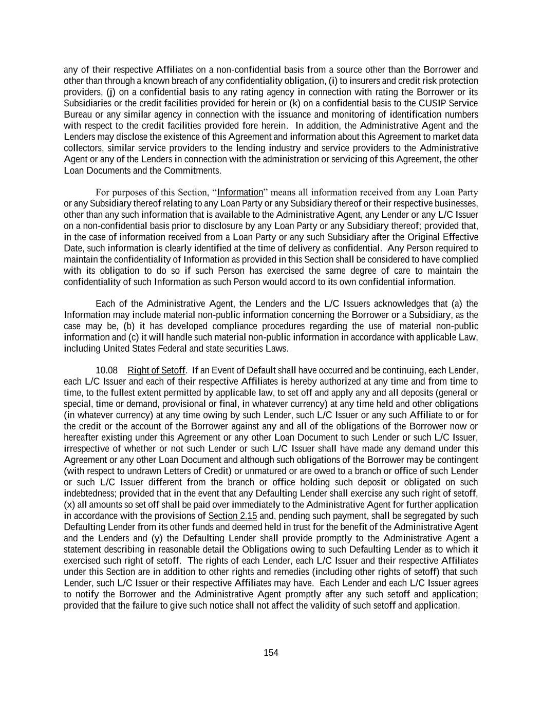 154除已知违反任何保密义务外,(i)向保险人和信用风险保护提供者,(j)在与借款人或其子公司评级或此处提供的信贷便利有关的保密基础上向任何评级机构,或(k)在与此处提供的信贷便利有关的与签发和监测识别号有关的与此处提供的信贷便利有关的保密基础上向CUSIP服务局或任何类似机构保密的任何关联机构。此外,行政代理人和贷款人可就本协议、其他贷款文件和承诺的管理或服务,向市场数据收集者、贷款行业的类似服务提供商和服务提供商向行政代理人或任何贷款人披露本协议的存在和有关本协议的信息。就本节而言,“信息”是指从任何贷款方或其任何附属公司收到的与任何贷款方或其任何附属公司或其各自业务有关的所有信息,但在任何贷款方或其任何附属公司披露之前,行政代理人、任何贷款人或任何信用证发行人在非保密基础上可获得的任何此类信息除外;但前提是,如果是在原始生效日期之后从贷款方或任何此类附属公司收到的信息,则此类信息在交付时被明确标识为机密信息。任何须按本条规定保持资料保密的人,如已行使与该人对其本身的机密资料所给予的同等程度的谨慎以保持该等资料的保密性,即视为已遵守其这样做的义务。行政代理人、贷款人和信用证发行人各自承认,(a)信息可能包括有关借款人或子公司(视情况而定)的重大非公开信息,(b)其已制定有关使用重大非公开信息的合规程序,以及(c)其将根据适用法律(包括美国联邦和州证券法)处理此类重大非公开信息。10.08抵销权。如违约事件已发生并仍在继续,兹授权各贷款人、各信用证发行人及其各自的关联公司在适用法律允许的最大范围内,随时并不时抵销和适用该贷款人在任何时间持有的任何和所有存款(一般或特殊、时间或活期、临时或最终、以任何货币计)以及在任何时间所欠的其他债务(以任何货币计),该等信用证发行人或借款人的任何附属机构或为借款人的信贷或账户针对借款人现在或以后根据本协议或任何其他贷款文件向该贷款人或该信用证发行人所存在的任何和所有义务,无论该贷款人或该信用证发行人是否已根据本协议或任何其他贷款文件提出任何要求,尽管借款人的该等义务可能是或有的(就未提取的信用证而言)或未到期,或欠该贷款人或该信用证发行人的分支机构或办事处,与持有该存款的分支机构或办事处不同,或对该债务承担义务;但在任何违约贷款人应行使任何该等抵销权的情况下,(x)如此抵销的所有款项须立即付予行政代理人,以便按照第2.15条的规定进一步申请,且在该等付款前,须由该违约贷款人与其其他资金分开,并视为为行政代理人及贷款人的利益而以信托形式持有,及(y)违约贷款人须迅速向该行政代理人提供一份报表,合理详细地说明其行使该抵销权所欠该违约贷款人的义务。每个贷款人、每个信用证发行人及其各自的关联公司在本节项下的权利是该贷款人、该信用证发行人或其各自的关联公司可能拥有的其他权利和补救措施(包括其他抵销权)的补充。各贷款人和各信用证开证人同意在发生该等抵销和申请后,及时通知借款人和行政代理人;但未发出该通知的,不影响该抵销和申请的有效性。