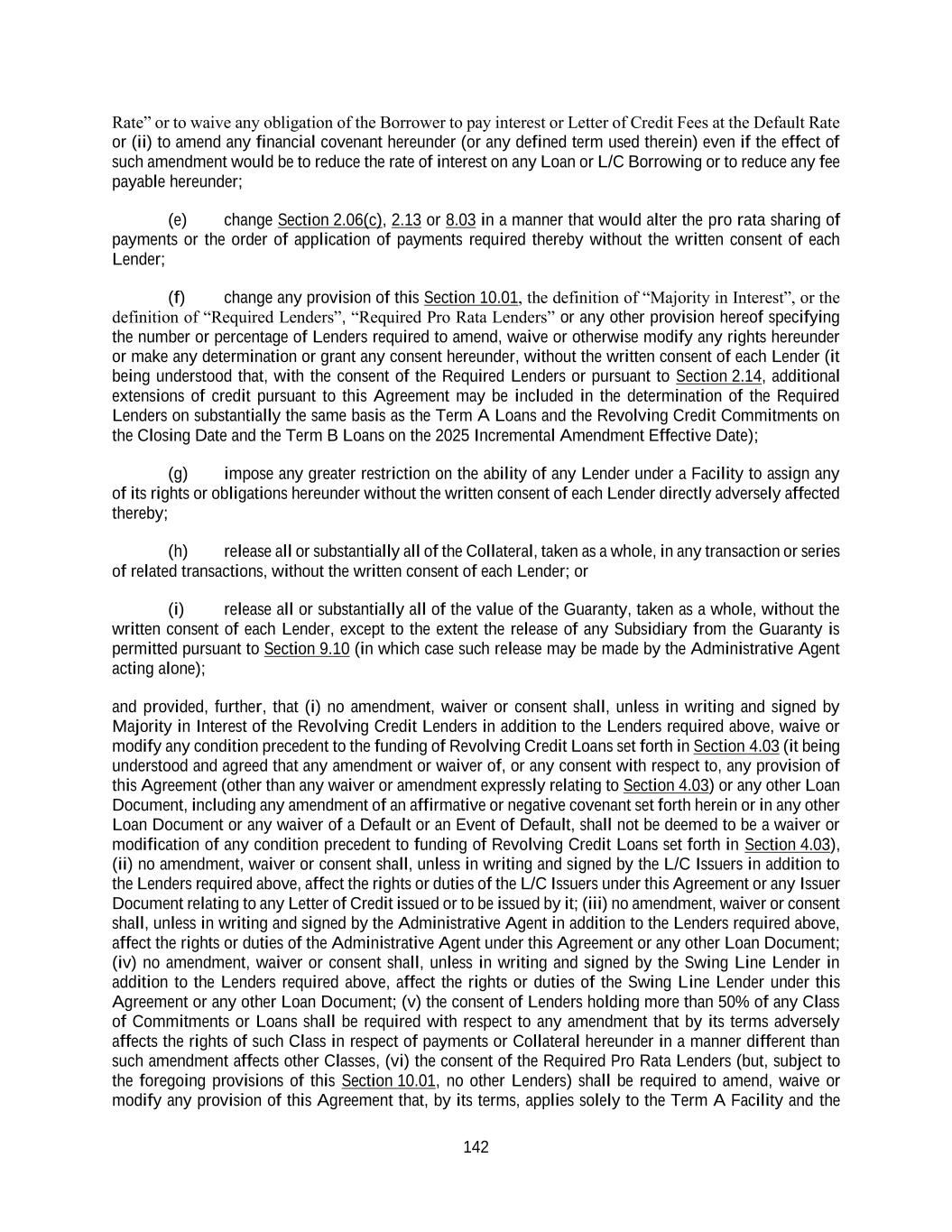 142利率”或免除借款人按违约率支付利息或信用证费用的任何义务或(ii)修订本协议项下的任何财务契约(或其中使用的任何定义术语),即使该修订的效果将是降低任何贷款或信用证借款的利率或减少本协议项下应支付的任何费用;(e)更改第2.06(c)节,2.13或8.03的方式将改变按比例分摊的付款或因此而需要的付款的应用顺序,而无需每个贷款人的书面同意;(f)更改本条第10.01款的任何规定、“多数利益”的定义,或“规定贷款人”、“规定按比例贷款人”或本协议任何其他规定,指明需要修改、放弃或以其他方式修改本协议项下任何权利或作出任何确定或授予本协议项下任何同意的贷款人的数量或百分比,而无需每个贷款人的书面同意(据了解,经所需贷款人同意或根据第2.14条,根据本协议额外延长信贷可包括在所需贷款人的确定中,其基础与截止日的A期贷款和循环信贷承诺以及2025年增量修正生效日的B期贷款基本相同);(g)对融资项下的任何贷款人在没有受到直接不利影响的每个贷款人的书面同意的情况下转让其在本协议下的任何权利或义务的能力施加任何更大的限制;(h)解除全部或基本上全部抵押品,作为一个整体,在任何交易或一系列相关交易中,未经每一贷款人的书面同意;或(i)未经每一贷款人的书面同意,将担保的全部或基本上全部价值作为一个整体解除,但根据第9.10条允许任何子公司解除担保的情况除外(在这种情况下,此种解除可由单独行事的行政代理人作出);并进一步规定,(i)任何修改、放弃或同意不得,除非以书面形式并经除上述所要求的贷款人之外的循环信贷贷款人的多数利益签署,否则放弃或修改第4.03节中规定的为循环信贷贷款提供资金的任何先决条件(据了解并同意,对本协议的任何条款(但与第4.03节明确有关的任何放弃或修订除外)或任何其他贷款文件的任何修订或放弃,或任何同意,包括对本文或任何其他贷款文件中所述的肯定或否定契约的任何修订或对违约或违约事件的任何放弃,不得被视为对第4.03条所述循环信用贷款融资的任何先决条件的放弃或修改),(ii)任何修订、放弃或同意,除非以书面形式并由除上述要求的贷款人之外的信用证发行人签署,影响信用证发行人在本协议或与其签发或将签发的任何信用证有关的任何签发人文件项下的权利或义务;(iii)任何修订、放弃或同意,除非以书面形式且除上述要求的出借人外由行政代理人签署,否则不得影响行政代理人在本协议或任何其他贷款文件项下的权利或义务;(iv)任何修订、放弃或同意,除非以书面形式且除上述要求的出借人外由周转额度出借人签署,影响周转线贷款人在本协议或任何其他贷款文件下的权利或义务;(v)就任何修订而言,其条款以不同于该修订影响其他类别的方式对该类别在本协议下的付款或抵押品方面的权利产生不利影响的任何修订,须获得持有任何类别承诺或贷款50%以上的贷款人的同意,(vi)所需按比例贷款人的同意(但在符合本条第10.01条前述规定的情况下,无需其他贷款人)作出修订,放弃或修改本协议的任何条款,根据其条款,仅适用于期限A融资和