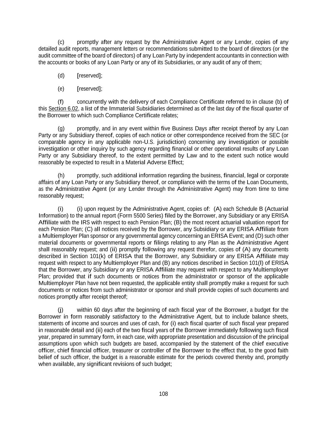 108(c)在行政代理人或任何贷款人提出任何要求后,立即提供独立会计师就任何贷款方或其任何附属公司的账目或账簿向任何贷款方的董事会(或董事会审计委员会)提交的任何详细审计报告、管理信函或建议的副本,或对其中任何一方的审计;(d)[保留];(e)[保留];(f)在交付本条第6.02条(b)款所指的每份合规证书的同时,截至此类合规证书所涉及的借款人财政季度最后一天确定的非实质性子公司名单;(g)迅速且无论如何在任何贷款方或其任何子公司收到通知后的五个工作日内,从SEC(或任何适用的非美国司法管辖区的类似机构)收到的关于该机构就任何贷款方或其任何子公司的财务或其他运营结果进行的任何调查或可能的调查或其他询问的每一份通知或其他信函的副本,在法律许可的范围内,并在合理预期此种通知会导致重大不利影响的范围内;(h)迅速提供行政代理人(或任何贷款人通过行政代理人)不时合理要求的有关任何贷款方或其任何附属公司的业务、财务、法律或公司事务,或遵守贷款文件条款的额外信息;(i)(i)应行政代理人要求,提供:(a)借款人提交的年度报告(表格5500系列)的每个附表B(精算信息)的副本,与IRS就每个养老金计划相关的任何子公司或任何ERISA关联公司;(b)每个养老金计划的最新精算估值报告;(c)借款人、任何子公司或任何ERISA关联公司从多雇主计划发起人或任何政府机构收到的关于ERISA事件的所有通知;(d)行政代理人应合理要求的与任何计划有关的其他重要文件或政府报告或文件;(ii)在提出任何要求后立即提供(a)借款人在ERISA第101(k)节中描述的任何文件的副本,任何附属公司或任何ERISA附属公司可就任何多雇主计划和(b)ERISA第101(l)节所述的任何通知提出要求,借款人、任何附属公司或任何ERISA附属公司可就任何多雇主计划提出要求;但如未要求适用的多雇主计划的管理人或发起人提供此类文件或通知,适用实体应迅速向该管理人或保荐人提出索取此类文件或通知的请求,并应在收到此类文件和通知后迅速提供副本;(j)在借款人每个会计年度开始后的60天内,以行政代理人合理满意的形式为借款人编制预算,但应包括资产负债表、收益表以及现金来源和用途,对于(i)以合理详细方式编制的该财政年度的每个财政季度和(ii)紧随该财政年度之后的借款人的两个财政年度中的每个财政年度,在每种情况下均以摘要形式编制,并适当列报和讨论此类预算所依据的主要假设,并附有借款人的首席执行官、首席财务官、司库或控制人的声明,大意是,根据该官员的善意信念,预算是对所涵盖期间的合理估计,并在可获得时迅速作出,此类预算的任何重大修订;
