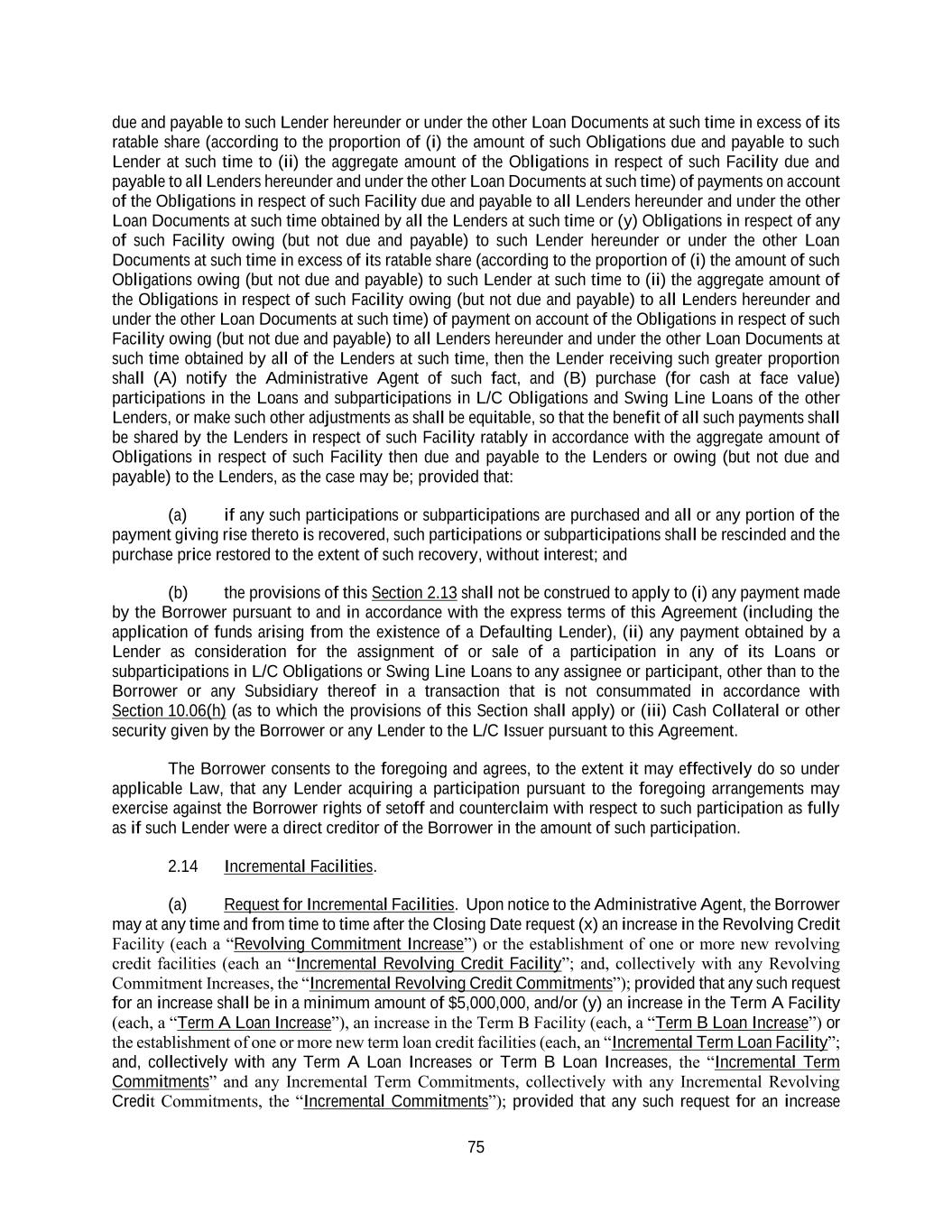 75根据本协议或根据其他贷款文件在该时间到期应付该等贷款人的款项超过其应课税份额(按(i)在该时间到期应付该等贷款人的该等债务的金额与(ii)在该时间根据本协议和根据其他贷款文件到期应付该等贷款的所有贷款人的该等融资的债务总额的比例)及根据所有贷款人在该时间取得的其他贷款文件或(y)根据本协议或根据该时间其他贷款文件就任何该等融资所欠(但并非到期及应付)该等贷款人的债务超过其应课税份额(按(i)在该时间对该等贷款人所欠(但并非到期及应付)该等债务的金额与(ii)根据本协议对所有贷款人所欠(但并非到期及应付)该等融资的债务总额的比例及根据当时的其他贷款文件)就该融资所欠(但并非到期应付)所有贷款人的债务而支付的款项及根据当时所有贷款人取得的其他贷款文件所欠(但并非到期应付)的款项,则收取该较大比例的贷款人须(a)将该事实通知行政代理人,及(b)购买(按面值现金)参与其他贷款人的贷款及次级参与信用证债务及周转额度贷款,或作出公平的其他调整,以便所有该等付款的利益应由贷款人按照该融资的债务总额按当时到期应付给贷款人或欠(但不是到期应付)给贷款人(视情况而定)按比例分享;但条件是:(a)如果购买了任何该等参与或分参与,并且收回了由此产生的全部或任何部分付款,则应撤销该等参与或分参与,并将购买价格恢复到该收回的范围内,(b)本条第2.13款的规定不应被解释为适用于(i)借款人依据和按照本协议的明示条款支付的任何款项(包括适用因存在违约贷款人而产生的资金),(ii)贷款人作为转让或出售参与其任何贷款或信用证债务的次级参与或周转额度贷款给任何受让人或参与人的对价而获得的任何款项,在未根据第10.06(h)节(本条规定适用)完成的交易中的借款人或其任何附属公司除外,或(iii)由借款人或任何贷款人根据本协议向信用证发行人提供的现金抵押或其他担保。借款人同意上述规定,并同意,在其根据适用法律可能有效这样做的范围内,任何根据上述安排获得参与的贷款人可就此类参与充分行使对借款人的抵销和反求偿权,如同该贷款人是借款人在此类参与金额上的直接债权人一样。2.14增量设施。(a)要求提供增量设施。经通知行政代理人,借款人可在截止日期后的任何时间和不时请求(x)增加循环信贷融资(每项为“循环承诺增加”)或设立一个或多个新的循环信贷融资(每项为“增量循环信贷融资”;与任何循环承诺增加合称为“增量循环信贷承诺”);但任何此类增加请求的最低金额应为5,000,000美元,和/或(y)增加期限A融资(每项为“期限A贷款增加”),增加B期贷款(每项均称为“B期贷款增加”)或设立一项或多项新的定期贷款信贷便利(每项均称为“增量定期贷款便利”;以及与任何A期贷款增加或B期贷款增加合称“增量定期承诺”和任何增量定期承诺,与任何增量循环信贷承诺合称“增量承诺”);但前提是任何此类增加请求