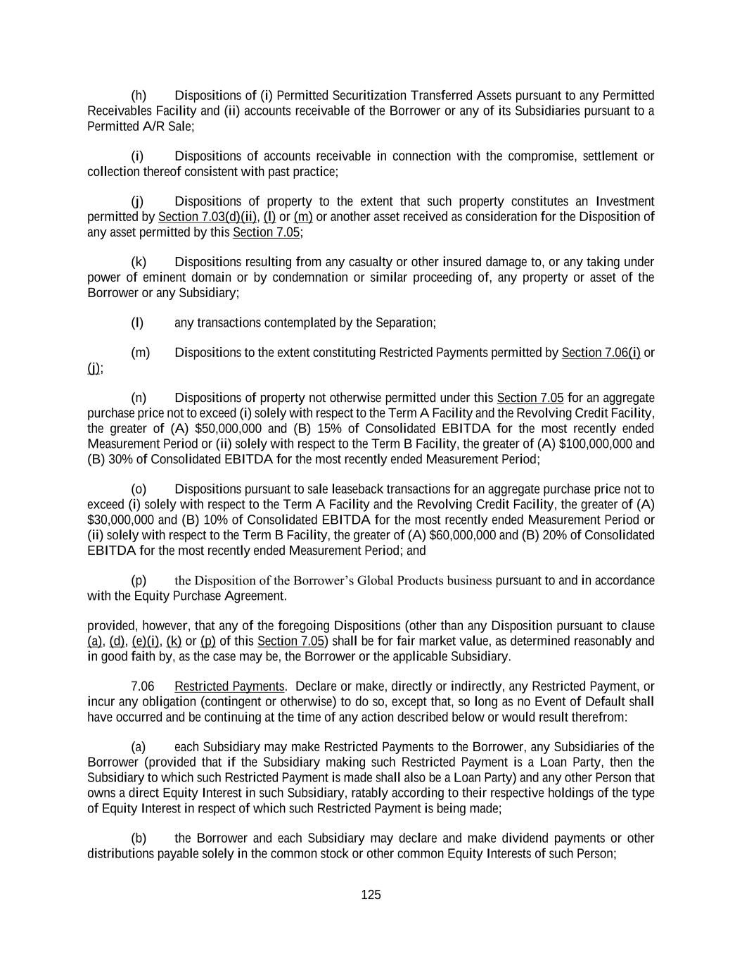 125(h)(i)根据任何许可的应收账款融资许可的证券化转让资产和(ii)借款人或其任何子公司根据许可的应收账款出售的应收账款的处置;(i)按照以往惯例处置与折衷、结算或收款有关的应收账款;(j)在此类财产构成第7.03(d)(ii)、(l)或(m)条允许的投资或作为本第7.05条允许的处置任何资产的对价而收到的另一项资产的范围内处置财产;(k)因任何伤亡或其他保险损害而产生的处置,或根据征用权或通过谴责或类似程序取得借款人或任何附属公司的任何财产或资产;(l)分立所设想的任何交易;(m)在构成第7.06(i)或(j)条允许的限制性付款范围内的处分;(n)仅就期限A融资和循环信贷融资以不超过(i)的总购买价格处置根据本条不允许的财产,(a)50,000,000美元和(b)最近结束的计量期合并EBITDA的15%或(ii)仅就B期融资而言的较高者,(a)100,000,000美元和(b)最近结束的计量期合并EBITDA的30%中的较高者;(o)根据售后回租交易进行的处置,总购买价格不超过(i)仅就A期融资和循环信贷融资而言,(a)30,000,000美元和(b)最近结束的计量期合并EBITDA的10%或(ii)仅就B期融资而言的较高者,(a)60,000,000美元和(b)最近结束的计量期合并EBITDA的20%中的较高者;以及(p)根据和根据股权购买协议处置借款人的全球产品业务。但前提是,上述任何处置(根据本条第7.05条(a)、(d)、(e)(i)、(k)或(p)项的任何处置除外)应为公平市场价值,由借款人或适用的附属公司(视属何情况而定)合理及善意厘定。7.06受限制的付款。直接或间接宣布或作出任何受限制的付款,或承担这样做的任何义务(或有的或其他),但只要在下述任何行动发生时未发生违约事件并仍在继续或将由此导致:(a)各附属公司可向借款人作出受限制的付款,借款人的任何附属公司(但如作出该等受限制付款的附属公司为贷款方,则作出该等受限制付款的附属公司亦须为贷款方)及拥有该附属公司直接股权的任何其他人,按其各自持有该等受限制付款所涉及的股权类型,按比例分配;(b)借款人及各附属公司可宣布并作出股息支付或仅以该人的普通股或其他普通股权益应付的其他分派;