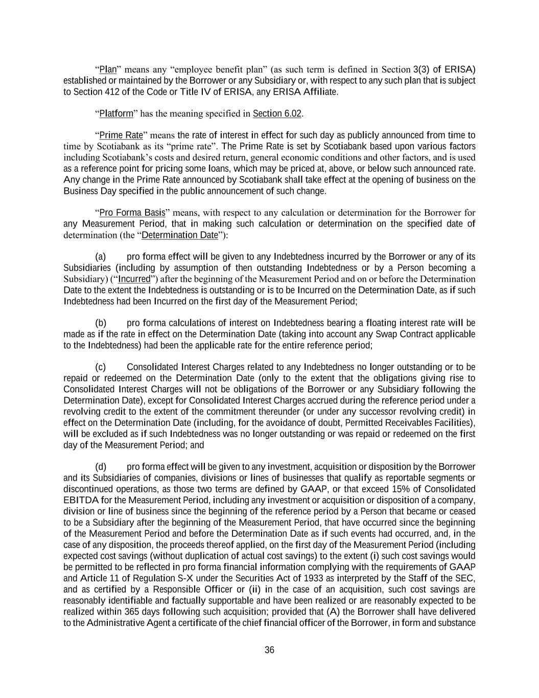 36“计划”是指由借款人或任何子公司设立或维持的任何“员工福利计划”(该术语在ERISA第3(3)节中定义),或就受ERISA守则第412条或标题IV约束的任何此类计划而言,任何ERISA关联公司。“平台”具有第6.02节规定的含义。“最优惠利率”是指加拿大丰业银行不时作为其“最优惠利率”公开宣布的当日有效利率。最优惠利率由加拿大丰业银行根据包括加拿大丰业银行成本和期望回报、一般经济状况和其他因素在内的各种因素制定,并作为一些贷款定价的参考点,这些贷款的定价可能会达到、高于或低于该公布的利率。加拿大丰业银行宣布的最优惠利率的任何变化应在该变化的公告中指定的营业日开业时生效。“备考基准”是指,就借款人在任何计量期的任何计算或确定而言,在指定的确定日期(“确定日期”)作出该等计算或确定时:(a)将对借款人或其任何子公司(包括通过承担当时未偿债务或由成为子公司的人承担)(“已发生”)在计量期开始后和在确定日期或之前发生的任何债务给予备考效力,但以该债务未偿还或将在确定日期发生为限,犹如该等负债已于计量期的第一天产生;(b)按浮动利率计息的负债利息的备考计算将按如果在确定日有效的利率(考虑到适用于债务的任何掉期合同)一直是整个参考期的适用利率;(c)与在确定日不再未偿还或将被偿还或赎回的任何债务相关的合并利息费用(仅限于产生合并利息费用的义务将不是借款人或任何子公司在确定日之后的义务),除非循环信贷项下在参考期内累积的合并利息费用在确定日期生效的循环信贷项下承诺(或任何后续循环信贷项下)的范围内(为免生疑问,包括许可的应收款项便利),将被排除在外,犹如该等债务已不再未偿还或在计量期的第一天已偿还或赎回;及(d)借款人及其附属公司的任何投资、收购或处置将具有形式上的效力,符合可报告分部或终止经营资格的部门或业务线,因为这两个术语由GAAP定义,或超过计量期合并EBITDA的15%,包括自计量期开始后成为或不再是子公司的人对公司、分部或业务线的任何投资或收购或处置,自计量期开始以来和确定日期之前发生的如同已发生此类事件一样,并且,在任何处置的情况下,其收益在计量期的第一天适用(包括预期的成本节约(不重复实际成本节约),但前提是(i)此类成本节约将被允许反映在符合美国证券交易委员会工作人员解释的《1933年证券法》规定的GAAP和S-X条例第11条要求的备考财务信息中,并经负责官员证明,或(ii)在收购的情况下,此类成本节约是可以合理识别和事实支持的,并且已经实现或合理预期将在此类购置后的365天内实现;但(a)借款人应已向行政代理人交付借款人首席财务官的证明,其形式和实质
