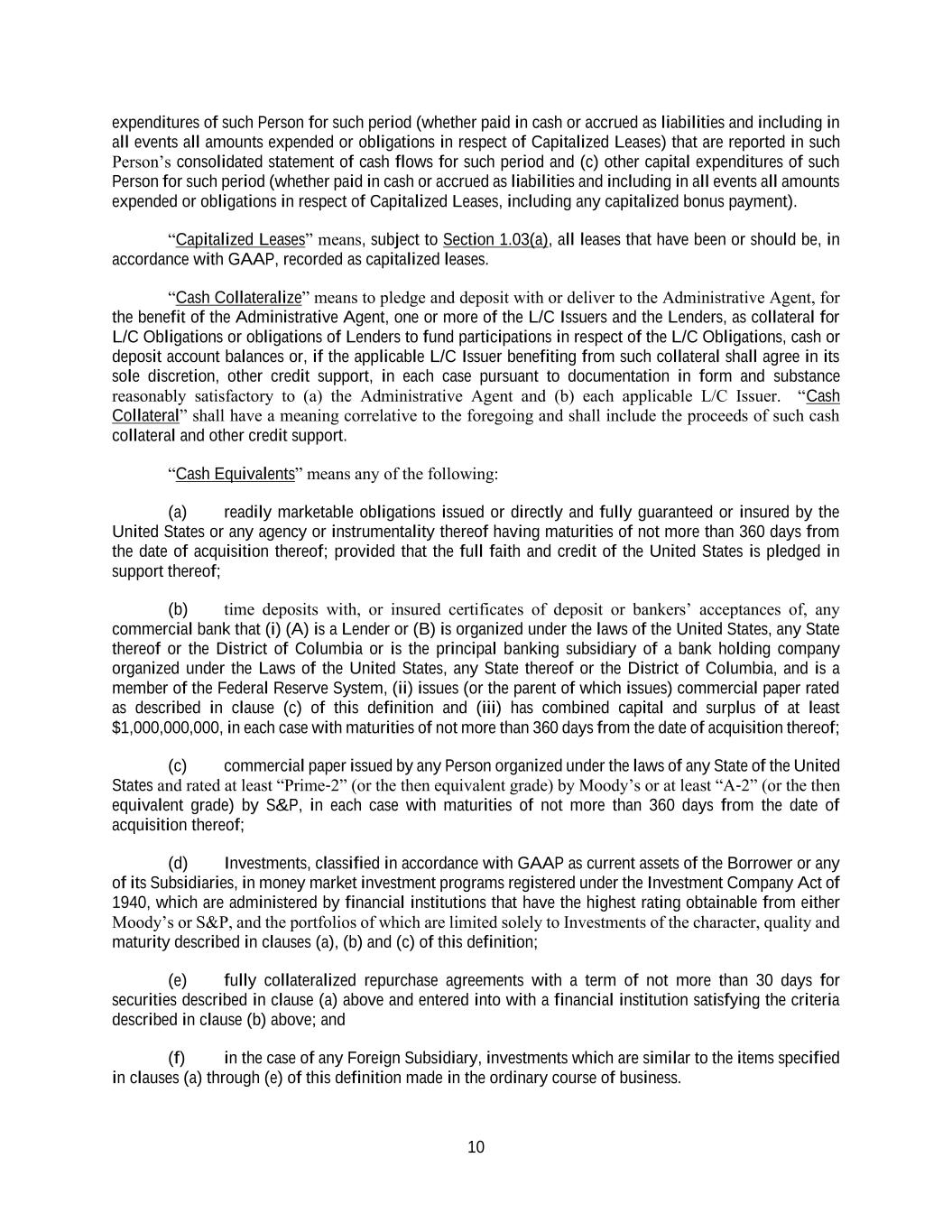 该人在该期间的10项支出(无论是以现金支付还是作为负债应计,并在所有情况下包括在该人该期间的综合现金流量表中报告的与资本化租赁有关的所有支出金额或债务)和(c)该人在该期间的其他资本支出(无论是以现金支付还是作为负债应计,并在所有情况下包括与资本化租赁有关的所有支出金额或债务,包括任何资本化奖金支付)。“资本化租赁”是指,根据第1.03(a)节,根据公认会计原则,已经或应该被记录为资本化租赁的所有租赁。“现金抵押”是指为行政代理人、一名或多名信用证发行人和出借人的利益,向行政代理人质押和存入或交付,作为信用证义务的抵押品或出借人就信用证义务、现金或存款账户余额、或(如受益于此类抵押品的适用信用证发行人应全权酌情同意其他信贷支持的义务,在每种情况下均根据(a)行政代理人和(b)各适用信用证发行人合理满意的形式和实质文件。“现金担保物”具有与前述相关的含义,应包括该现金担保物的收益和其他信用支持。“现金等价物”是指下列任何一种:(a)由美国或其任何机构或工具发行或直接全额担保或投保的、期限自取得之日起不超过360天的易于销售的债务;前提是美国的充分信用和信用被质押以支持该债务;(b)向(i)(a)为贷款人或(b)根据美国法律组织的任何商业银行的定期存款或保险存单或银行承兑汇票,美国的任何州或哥伦比亚特区,或是根据美国法律组建的银行控股公司的主要银行子公司,美国的任何州或哥伦比亚特区,并且是联邦储备系统的成员,(ii)发行(或其母公司发行)本定义(c)条所述评级的商业票据,以及(iii)资本和盈余合计至少为1,000,000,000美元,在每种情况下,到期日均不超过自购买之日起360天;(c)根据美国任何州的法律组织起来的任何人发行的商业票据,并被穆迪评为至少“Prime-2”(或当时的同等等级)或被标普评为至少“A-2”(或当时的同等等级),在每种情况下,到期日均不超过自购买之日起360天;(d)根据公认会计原则分类为借款人或其任何子公司流动资产的投资,在根据1940年《投资公司法》注册的货币市场投资计划中,这些计划由拥有可从穆迪或标普获得的最高评级的金融机构管理,其投资组合仅限于(a)条所述性质、质量和期限的投资,(b)和(c)本定义;(e)就上文(a)条所述的证券与满足上文(b)条所述标准的金融机构订立的期限不超过30天的完全抵押回购协议;(f)就任何外国子公司而言,在正常业务过程中作出的与本定义(a)至(e)条所述项目类似的投资。