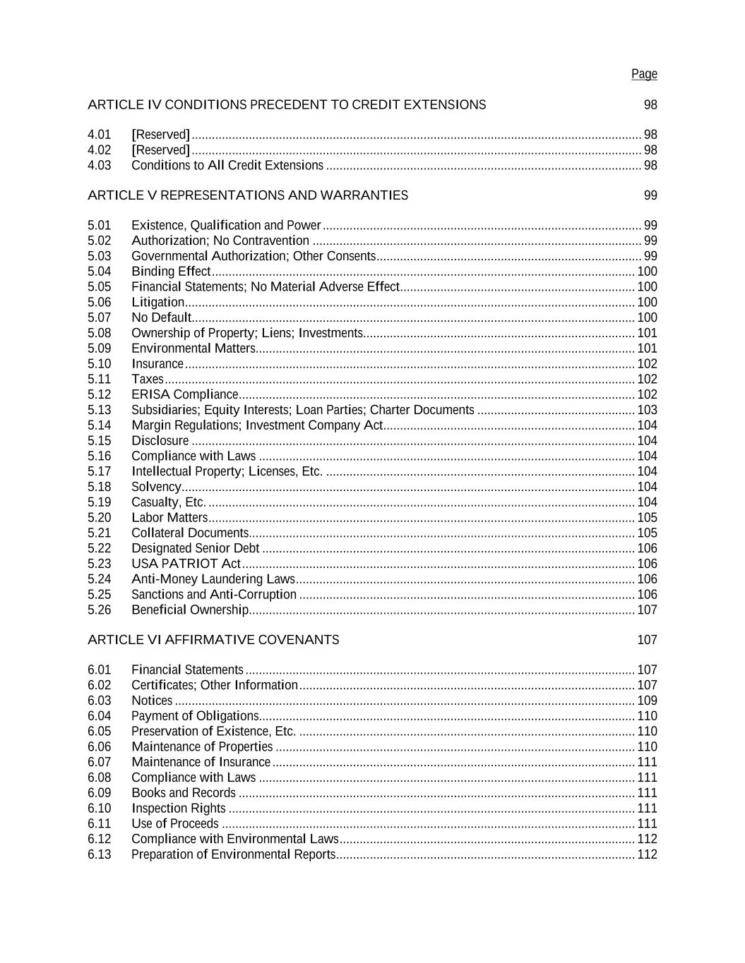 第IV条信贷展期的先例条件984.01 [保留]......................................................................................................................98 4.02 [保留]......................................................................................................................98 4.03所有信贷展期的条件......................................................................................98第五条代表和保证995.01的存在,资格和权力......................................................................................995.02授权;不得违反......................................................................................995.03政府授权;其他同意......................................................................................995.04约束效力......................................................................................1005.05财务报表;无重大不利影响......................................................................1005.06诉讼......................................................................................................................................1005.07无违约情况......................................................................................................1005.08财产所有权;留置权;投资......................................................................................... 1015.09环境事项......................................................................................... 1015.10保险......................................................................................................................10 25.11税项......................................................................................................................................10 25.12 ERISA合规......................................................................................................................................10 25.13子公司;股权;.................................................................................................... 1045.16遵纪守法.................................................................................... 1045.17知识产权;许可,等.................................................................................... 1045.18偿债能力.................................................................................................... 1045.19伤亡等.................................................................................................................... 1045.20劳动事项.................................................................................................... 1055.21附担保文件.................................................................................................... 1055.22指定优先债务.................................................................... 1065.23美国爱国者法.................................................................... 1065.24反洗钱法.................................................................... 1065.25制裁和反腐败.................................................................... 1065.26实益所有权.................................................................................... 107第六条确权公约1076.01财务报表.................................................................................................................... 1076.02证书;其他信息..................................1 106.05保存存在, 等.................................................................................... 1106.06财产的维修.................................................................................... 1106.07保险的维修.................................................................................................... 1116.08遵守法律.................................................................................................................... 1116.09账簿和记录.................................................................................................................... 1116.10查验权.................................................................................................... 1116.11所得款项的使用.................................................................................... 1116.12遵守环境法....................................................................1 126.13编制环境报告................................................................................1 12