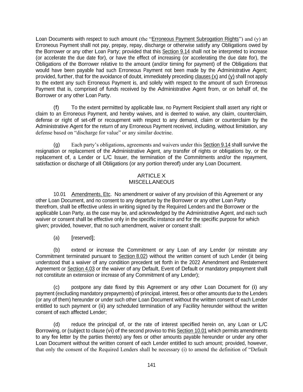 141有关该等金额的贷款文件(“错误付款代位权”)和(y)错误付款不得支付、预付、偿还、解除或以其他方式清偿借款人或任何其他贷款方所欠的任何义务;但本条第9.14款不得解释为增加(或加速到期日),或具有增加(或加速到期日)的效果,借款人相对于如果不是由行政代理人支付此类错误付款本应支付的债务的金额(和/或支付时间)的义务;此外,但为免生疑问,为避免疑问,紧接在前面的(x)和(y)条不适用于任何此类错误付款的范围,并且仅适用于由行政代理人从借款人或任何其他贷款方收到或代表借款人或任何其他贷款方收到的资金组成的此类错误付款的金额。(f)在适用法律允许的范围内,任何付款接受者不得主张对错误付款的任何权利或主张,并在此放弃并被视为放弃就行政代理人要求返还所收到的任何错误付款的任何要求、主张或反主张而提出的任何主张、反主张、抗辩或抵销或补偿的权利,包括但不限于基于“价值解除”或任何类似原则的任何抗辩。(g)每一方当事人根据本条第9.14款承担的义务、协议和放弃,在行政代理人辞职或更换、贷款人或信用证发行人转让权利或义务或更换其权利或义务、终止承诺和/或偿还、清偿或解除任何贷款文件项下的所有义务(或其任何部分)之后,均应继续有效。第十条杂项10.01修正案等。对本协议任何条款或任何其他贷款文件的任何修改或放弃,以及对借款人或任何其他贷款方的任何离开的任何同意,均不具有效力,除非经所需贷款人和借款人或适用的贷款方(视情况而定)签署并经行政代理人承认的书面形式,且每一项该等放弃或同意仅在特定情况下和为其所给予的特定目的而具有效力;但前提是,没有此种修改,弃权或同意应:(a)[保留];(b)延长或增加任何贷款人的承诺或任何贷款(或恢复根据第8.02条终止的任何承诺),而无需该贷款人的书面同意(据了解,放弃2022年修订和重述协议或第4.03条规定的任何先决条件或放弃任何违约,违约或强制提前还款的事件不应构成任何贷款人的任何承诺的延长或增加);(c)推迟本协议或任何其他贷款文件所确定的任何日期,以便(i)未经有权获得此类付款的每个贷款人的书面同意而根据本协议或根据此类其他贷款文件向贷款人(或其中任何一方)支付本金、利息、费用或其他款项(不包括强制提前还款),或(ii)未经每个受影响的贷款人的书面同意而按计划终止本协议下的任何融资;(d)减少本金,任何贷款或信用证借款,或(根据本条第10.01条第二个但书的第(vi)款,该款允许各方修改任何费用信函)根据本协议或根据任何其他贷款文件应支付的任何费用或其他金额,而无需获得有权获得该金额的每个贷款人的书面同意;但前提是,只有获得所需贷款人的同意才有必要(i)修改“违约”的定义