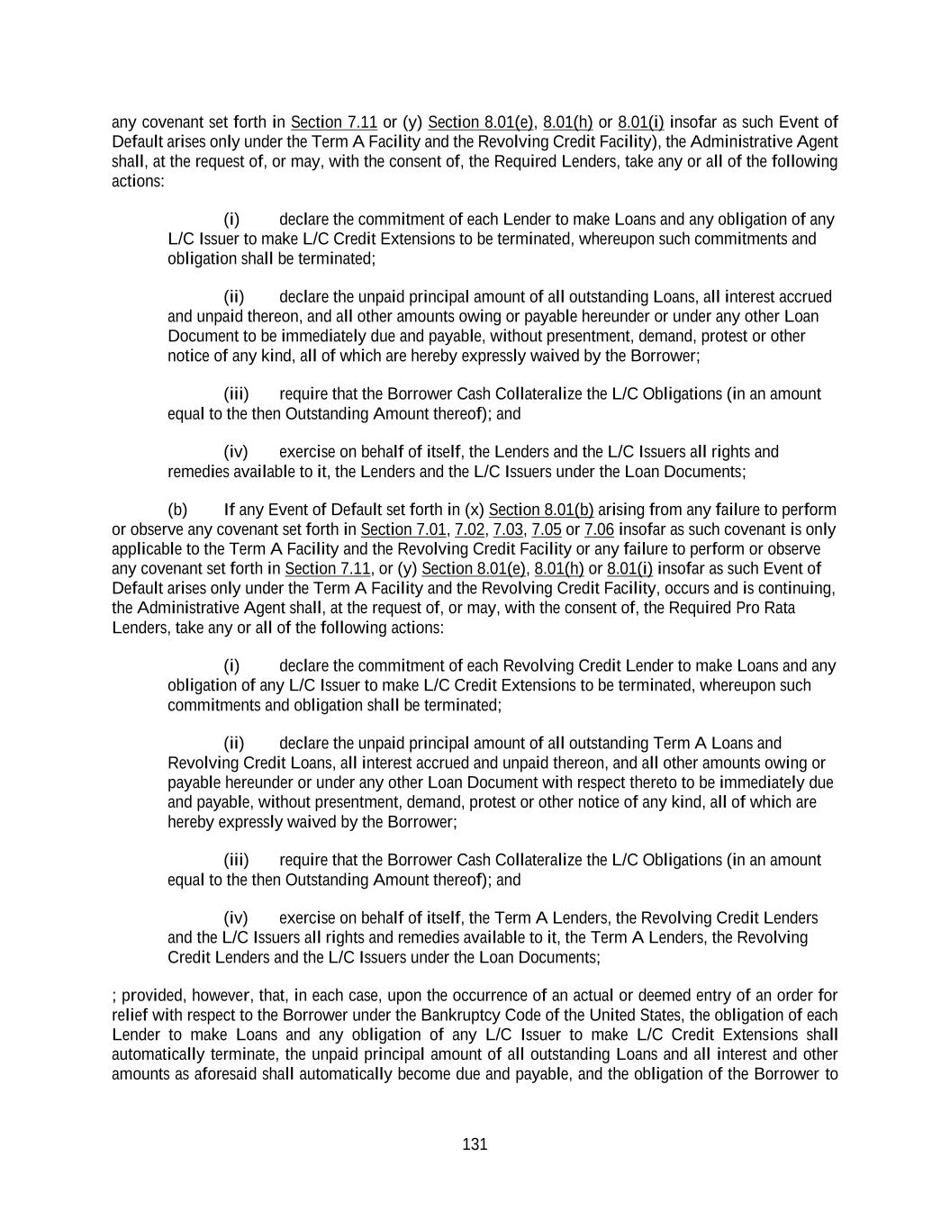 131第7.11条或(y)第8.01(e)、8.01(h)或8.01(i)条所列的任何契诺,只要该违约事件仅在期限A融资和循环信贷融资下产生),行政代理人应要求贷款人的请求或经要求贷款人同意后可采取以下任何或所有行动:(i)宣布每个贷款人作出贷款的承诺和任何信用证发行人作出信用证信贷展期的任何义务终止,据此,该等承诺和义务应予终止;(ii)宣布所有未偿还贷款的未付本金、所有应计及未付利息,以及根据本协议或根据任何其他贷款文件所欠或应付的所有其他款项立即到期应付,而无须出示、要求、抗议或任何形式的其他通知,所有这些均由借款人特此明确放弃;(iii)要求借款人以现金抵押信用证债务(金额等于当时未偿还的金额);(iv)代其行使,贷款人及信用证发行人根据贷款文件可予其、贷款人及信用证发行人的所有权利及补救措施;(b)如因未能履行或遵守第7.01、7.02、7.03、7.05或7.06条所载的任何契诺而导致(x)第8.01(b)条所述的任何违约事件,只要该契诺仅适用于期限A融资及循环信贷融资,或任何未能履行或遵守第7.11条或(y)第8.01(e)条所述的任何契诺,8.01(h)或8.01(i)只要违约事件仅在期限A融资和循环信贷融资下产生、发生并仍在继续,行政代理人应应要求的按比例贷款人的请求或经其同意后可采取以下任何或所有行动:(i)宣布终止每一循环信贷贷款人作出贷款的承诺和任何信用证发行人作出信用证信贷展期的任何义务,据此,此类承诺和义务应予终止;(ii)宣布所有未偿还的A期贷款和循环信用贷款的未支付本金、所有应计和未支付的利息,以及根据本协议或任何其他贷款文件所欠或应付的所有其他款项立即到期和应付,而无需出示、要求、抗议或其他任何形式的通知,所有这些均特此由借款人明确放弃;(iii)要求借款人以现金抵押信用证债务(金额等于当时未偿金额);(iv)代表其本身、A期贷款人、循环信贷贷款人和信用证发行人行使其在贷款文件下、A期贷款人、循环信贷贷款人和信用证发行人可获得的所有权利和补救措施;但前提是,在每种情况下,一旦发生根据美国《破产法》就借款人作出的实际或被视为输入的救济令,每个贷款人提供贷款的义务和任何信用证发行人作出信用证信贷展期的任何义务应自动终止,所有未偿还贷款的未付本金金额以及上述所有利息和其他金额应自动到期应付,借款人的义务应