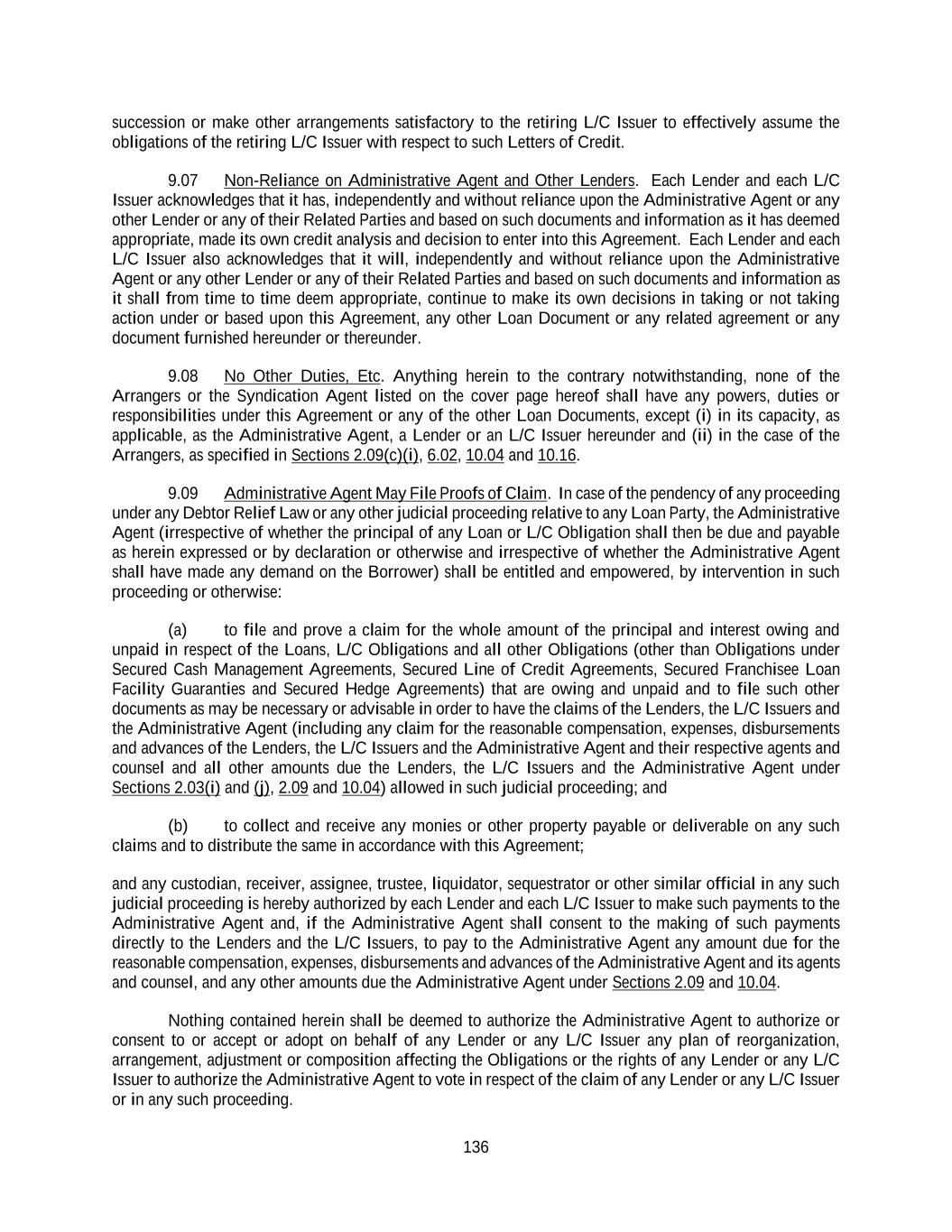 136承继或作出退约信用证发行人满意的其他安排,以有效承担退约信用证发行人与该等信用证有关的义务。9.07不依赖行政代理人和其他贷款人。各贷款人及各信用证发行人确认,其已独立且不依赖行政代理人或任何其他贷款人或其任何关联方,并基于其认为适当的文件和信息,自行作出信用分析并决定订立本协议。各贷款人及各信用证发行人亦承认,其将独立及不依赖行政代理人或任何其他贷款人或其任何关联方,并根据其不时认为适当的文件和资料,继续自行决定根据或基于本协议、任何其他贷款文件或任何相关协议或根据本协议或根据本协议提供的任何文件采取或不采取行动。9.08无其他职责等。尽管有任何与本协议相反的情况,本协议封面所列的任何安排人或银团代理人均不具有本协议或任何其他贷款文件项下的任何权力、义务或责任,但(i)如适用,作为本协议项下的行政代理人、贷款人或信用证发行人的身份,以及(ii)就该等安排而言,如第2.09(c)(i)、6.02、10.04及10.16条所指明。9.09行政代理人可提出索赔证明。在任何债务人救济法下的任何程序或与任何贷款方有关的任何其他司法程序未决的情况下,行政代理人(无论任何贷款或信用证债务的本金随后是否应按本协议明示或通过声明或其他方式到期应付,也无论该行政代理人是否已向借款人提出任何要求)均有权获得授权,通过干预此类程序或其他方式:(a)就贷款、信用证债务和所有其他债务(担保现金管理协议、担保信贷额度协议、担保特许经营人贷款融资担保和担保对冲协议项下的债务除外)所欠和未付的本金和利息的全部金额提出和证明索赔,并提交可能必要或可取的其他文件,以便获得贷款人、信用证发行人和行政代理人的索赔(包括任何合理赔偿的索赔,贷款人、信用证发行人和行政代理人及其各自的代理人和律师的开支、付款和垫款以及该司法程序中允许的根据第2.03(i)和(j)、2.09和10.04条应付贷款人、信用证发行人和行政代理人的所有其他款项;(b)收取任何此类债权应付或可交付的任何款项或其他财产,并根据本协议进行分配;以及任何托管人、接管人、受让人、受托人、清算人,在任何该等司法程序中,每名贷款人及每名信用证发行人特此授权扣押人或其他类似官员向行政代理人支付该等款项,如行政代理人同意直接向贷款人及信用证发行人支付该等款项,则向行政代理人支付行政代理人及其代理人及大律师的合理补偿、开支、付款及垫款的任何应付款项,以及根据第2.09及10.04条应付行政代理人的任何其他款项。本协议所载的任何内容均不得视为授权行政代理人授权或同意或代表任何贷款人或任何信用证发行人接受或采纳影响任何贷款人或任何信用证发行人的义务或权利的任何重组、安排、调整或组合计划,以授权行政代理人就任何贷款人或任何信用证发行人的债权或在任何该等程序中投票。