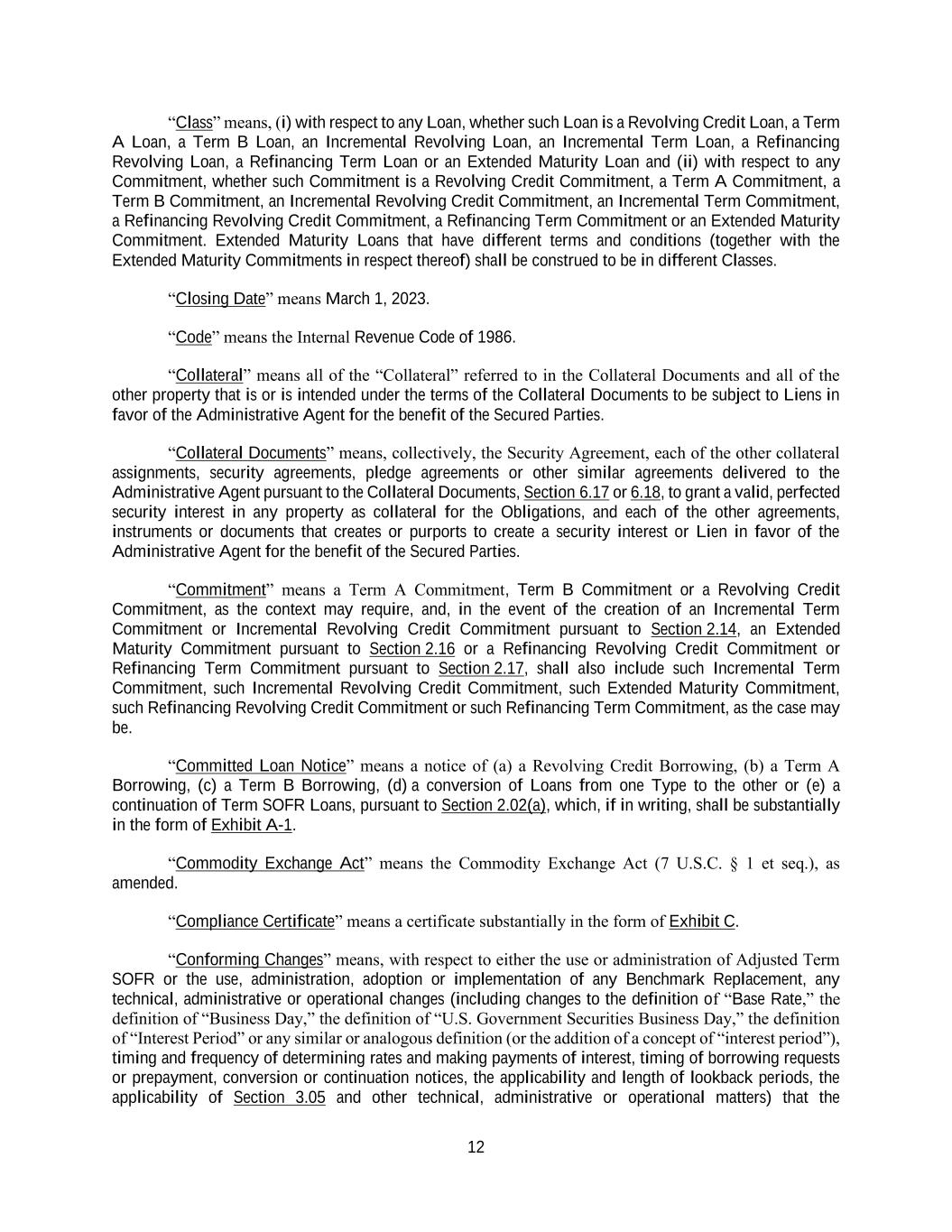 12“类”指,(i)就任何贷款而言,该贷款是否为循环信用贷款、A期贷款、B期贷款、增量循环贷款、增量定期贷款、再融资循环贷款、再融资定期贷款或延长到期贷款,以及(ii)就任何承诺而言,该承诺是否为循环信用承诺、A期承诺、B期承诺、增量循环信用承诺、增量期限承诺、再融资循环信用承诺、再融资期限承诺或延长到期承诺。具有不同条款和条件的延长期限贷款(连同与之相关的延长期限承诺)应被解释为不同类别。“截止日期”是指2023年3月1日。“法典”是指1986年的《国内税收法典》。“担保物”是指担保单证中提及的所有“担保物”以及根据担保单证条款正在或打算为担保当事人的利益而受制于行政代理人的留置权的所有其他财产。“担保单证”统称为担保协议、根据担保单证第6.17或6.18节交付给行政代理人的每一项其他担保物转让、担保协议、质押协议或其他类似协议,以授予任何财产的有效、完善的担保权益作为债务的担保物,以及为有担保当事人的利益而设定或意图设定有利于行政代理人的担保权益或留置权的每一项其他协议、文书或单证。“承诺”是指A期限承诺、B期限承诺或循环信贷承诺(视上下文可能需要而定),并且,如果根据第2.14节创建了增量期限承诺或增量循环信贷承诺,则根据第2.16节的延长到期承诺或根据第2.17节的再融资循环信贷承诺或再融资期限承诺,还应包括该等增量期限承诺、该等增量循环信贷承诺、该等延长到期承诺、该等再融资循环信贷承诺或该等再融资期限承诺(视情况而定)。“承诺贷款通知”是指根据第2.02(a)节,关于(a)循环信贷借款、(b)A期借款、(c)B期借款、(d)将贷款从一种类型转换为另一种类型或(e)定期SOFR贷款的延续的通知,如果是书面形式,则该通知应基本上采用附件 A-1的形式。“商品交易法”是指经修订的《商品交易法》(7 U.S.C. § 1 et seq.)。“合规证书”是指基本上以附件 C.形式存在的证书。“符合变更”是指,就调整后期限SOFR的使用或管理或任何基准替换的使用、管理、采用或实施而言,任何技术、行政或操作变更(包括“基准利率”定义的变更、“营业日”定义的变更、“美国政府证券营业日”定义的变更、“利息期”的定义或任何类似或类似的定义(或增加“利息期”的概念)、确定利率和支付利息的时间和频率、借款请求或提前还款、转换或延续通知的时间、回溯期的适用性和长度、第3.05节的适用性和其他技术、行政或操作事项)认为
