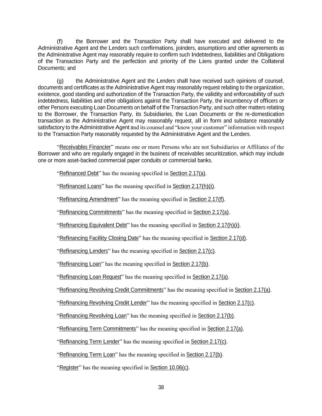 38(f)借款人和交易方应已签署并向行政代理人和出借人交付行政代理人可能合理要求的确认、合并、假设和其他协议,以确认交易方的债务、责任和义务以及根据担保单证授予的留置权的完善和优先权;(g)行政代理人和出借人应已收到行政代理人可能合理要求的与交易方的组织、存在、良好信誉和授权有关的律师意见、文件和证明,针对交易方的此类债务、责任和其他义务、代表交易方执行贷款文件的高级职员或其他人员的在职情况,以及行政代理人可能合理要求的与借款人、交易方及其子公司、贷款文件或再归化交易有关的其他事项的有效性和可执行性,所有这些在形式和实质上均令行政代理人及其律师合理满意,并在行政代理人和贷款人合理要求的与交易方有关的“了解您的客户”信息。“应收款项融资人”是指一名或多名非借款人的子公司或关联机构且经常从事应收款证券化业务的人员,可能包括一名或多名资产支持商业票据渠道或商业银行。“再融资债务”具有第2.17(a)节规定的含义。“再融资贷款”具有第2.17(h)(i)节规定的含义。“再融资修正案”具有第2.17(f)节规定的含义。“再融资承诺”具有第2.17(a)节规定的含义。“再融资等价债”具有第2.17(h)(i)节规定的含义。“再融资工具关闭日期”具有第2.17(d)节规定的含义。“再融资放款人”具有第2.17(c)节规定的含义。“再融资贷款”具有第2.17(b)节规定的含义。“再融资贷款请求”具有第2.17(a)节规定的含义。“再融资循环信贷承诺”具有第2.17(a)节规定的含义。“再融资循环信贷贷款人”具有第2.17(c)节规定的含义。“再融资循环贷款”具有第2.17(b)节规定的含义。“再融资期限承诺”具有第2.17(a)节规定的含义。“再融资定期贷款人”具有第2.17(c)节规定的含义。“再融资定期贷款”具有第2.17(b)节规定的含义。“注册”具有第10.06(c)节规定的含义。