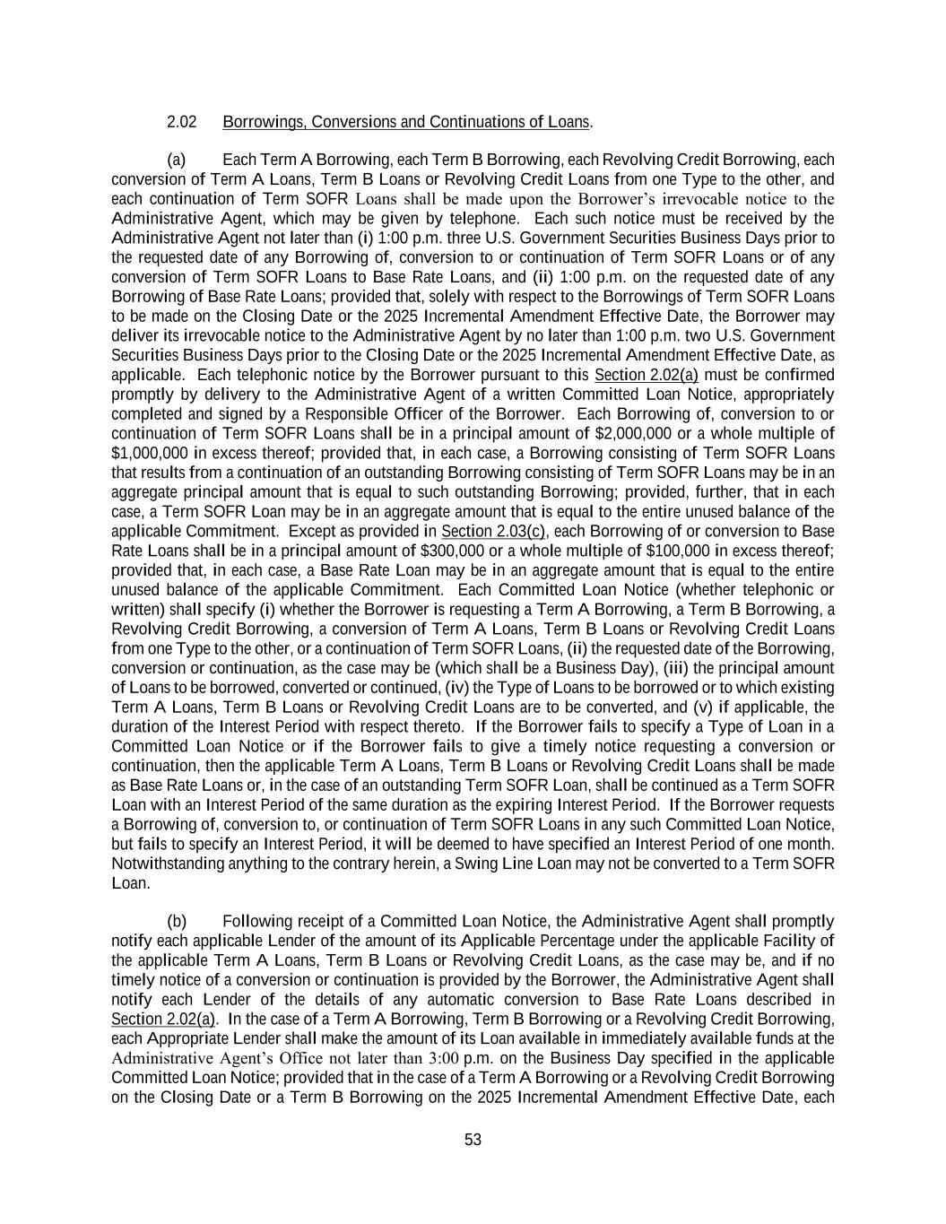 53 2.02借款、转换和续贷。(a)每笔A期借款、每笔B期借款、每笔循环信用借款、每笔A期贷款、B期贷款或循环信用贷款从一种类型转换为另一种类型,以及每笔SOFR定期贷款的延续,应在借款人向行政代理人发出不可撤销的通知后作出,该通知可以电话方式发出。行政代理人必须在不迟于(i)要求的任何借入、转换为或延续定期SOFR贷款或将任何定期SOFR贷款转换为基本利率贷款的日期前三个美国政府证券营业日下午1:00之前收到每份此类通知,以及(ii)要求的任何借入基本利率贷款的日期下午1:00之前收到每份通知;条件是,仅就将在截止日期或2025年增量修正生效日期进行的定期SOFR贷款的借款而言,借款人可在不迟于截止日期或适用的2025年增量修正生效日期前两个美国政府证券营业日下午1:00之前将其不可撤销的通知送达行政代理人。借款人根据本条第2.02(a)款发出的每份电话通知,必须通过向行政代理人交付书面承诺贷款通知迅速予以确认,并由借款人的一名负责官员适当填写和签署。定期SOFR贷款的每笔借款、转换为或延续的本金数额应为2000000美元或超过其数额1000000美元的整倍;但在每种情况下,由定期SOFR贷款组成的借款,如果是由定期SOFR贷款组成的未偿还借款的延续所产生的,其本金总额可能等于此种未偿还借款;此外,条件是,在每种情况下,定期SOFR贷款的总额可能等于适用承诺的全部未使用余额。除第2.03(c)节规定的情况外,每笔借款或转换为基本利率贷款的本金金额应为300,000美元或超过100,000美元的整数倍;但在每种情况下,基本利率贷款的总额可能等于适用承付款的全部未使用余额。每份承诺贷款通知(不论是电话还是书面)均应具体说明(i)借款人是否请求A期借款、B期借款、循环信用借款、A期贷款、B期贷款或循环信用贷款从一种类型转换为另一种类型,或定期SOFR贷款的延续,(ii)请求的借款、转换或延续日期(视情况而定)(应为营业日),(iii)拟借款、转换或延续的贷款本金金额,(iv)拟借入的贷款类别或现有A期贷款、B期贷款或循环信贷贷款将予转换的贷款类别,及(v)如适用,有关的利息期的期限。如果借款人未能在承诺贷款通知中指明贷款类型,或者如果借款人未能及时发出要求转换或延续的通知,则适用的A期贷款、B期贷款或循环信用贷款应作为基准利率贷款发放,或者,在未偿还的定期SOFR贷款的情况下,应作为与到期利息期相同的利息期的定期SOFR贷款继续发放。如果借款人在任何此类承诺贷款通知中要求借入、转换为或延续定期SOFR贷款,但未指定利息期,则将被视为指定了一个月的利息期。尽管有任何与此相反的情况,周转线贷款可能不会转换为定期SOFR贷款。(b)在收到承诺贷款通知后,行政代理人应迅速将其在适用的A期贷款、B期贷款或循环信用贷款(视情况而定)的适用融资下的适用百分比的金额通知每个适用的贷款人。如果借款人没有及时提供转换或延续的通知,行政代理人应将第2.02(a)节所述的任何自动转换为基准利率贷款的详细情况通知每个贷款人。A期借款、B期借款或循环信用借款的,各适当贷款人应不迟于适用的承诺贷款通知规定的营业日下午3:00在行政代理办公室以即时可用资金提供其贷款金额;但如A期借款或在结账日的循环信用借款或在2025年增量修正生效日的B期借款,则各