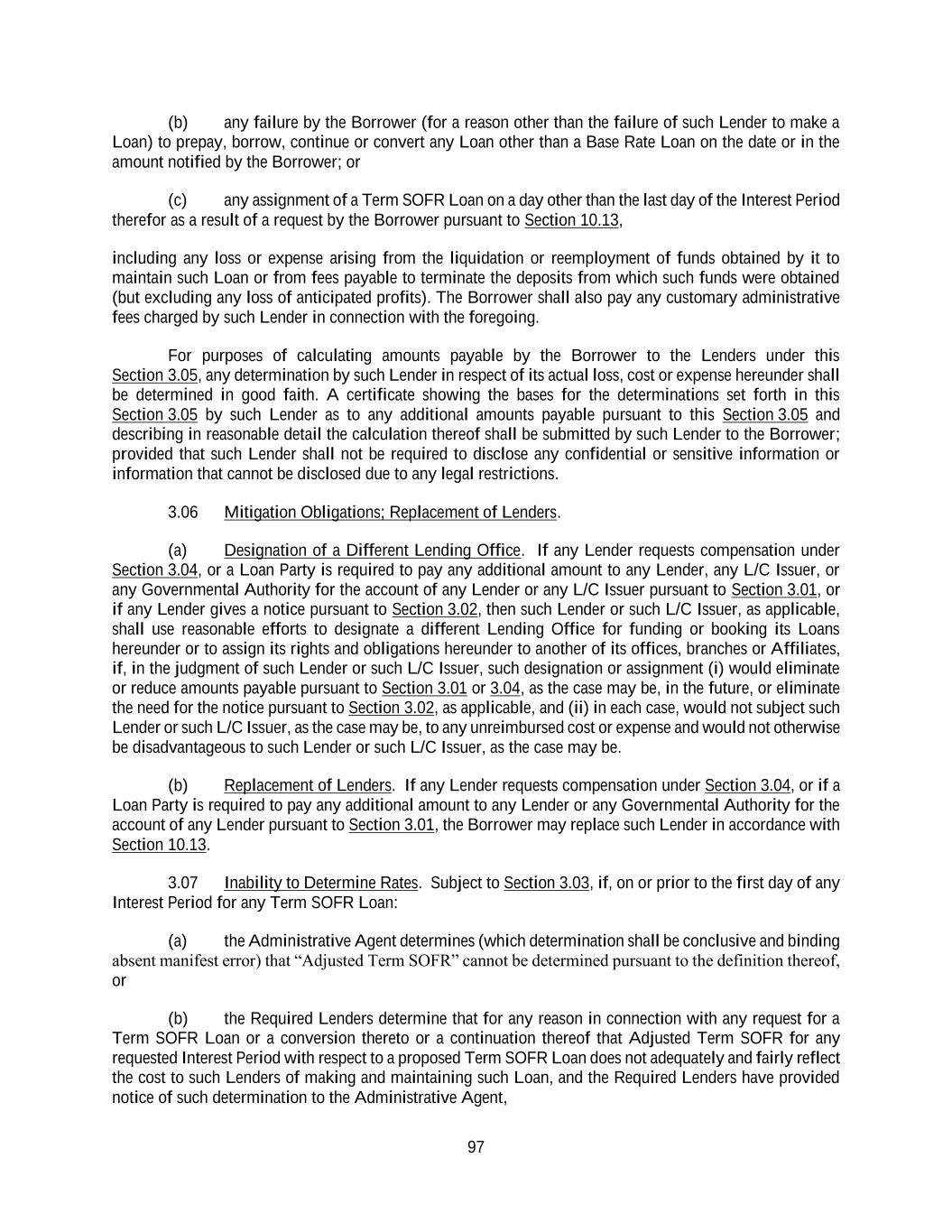 97(b)借款人未在借款人通知的日期或金额上预付、借入、延续或转换除基准利率贷款以外的任何贷款(由于该贷款人未能提供贷款的原因除外);或(c)因借款人依据第10.13条提出要求而在该利息期最后一天以外的某一天转让定期SOFR贷款,包括因清算或重新使用其为维持此类贷款而获得的资金或为终止获得此类资金的存款而应支付的费用而产生的任何损失或费用(但不包括任何预期利润损失)。借款人还应支付该贷款人因前述事项而收取的任何惯常行政费用。为计算借款人根据本条第3.05款应向贷款人支付的金额,该贷款人就其在本协议项下的实际损失、成本或费用作出的任何确定,应本着诚意予以确定。该贷款人应向借款人提交一份证明,其中应显示该贷款人根据本条3.05就任何额外应付款项所作决定的依据,并合理详细地说明其计算情况;但不得要求该贷款人披露因任何法律限制而无法披露的任何机密或敏感信息或信息。3.06缓解义务;更换出借人。(a)指定不同的贷款办公室。如果任何贷款人根据第3.04条要求赔偿,或要求贷款方根据第3.01条为任何贷款人或任何信用证发行人的账户向任何贷款人、任何信用证发行人或任何政府当局支付任何额外金额,或者如果任何贷款人根据第3.02条发出通知,则该贷款人或该信用证发行人(如适用)应尽合理努力指定不同的贷款办公室为其在本协议下的贷款提供资金或预订,或将其在本协议下的权利和义务转让给其另一办事处、分支机构或附属公司,如果,根据该等贷款人或该等信用证发行人的判断,该等指定或转让(i)将在未来消除或减少根据第3.01或3.04条(视情况而定)应付的金额,或消除根据第3.02条(视情况而定)发出通知的必要性,以及(ii)在每种情况下,将不会使该贷款人或该信用证发行人(视情况而定)承担任何未偿还的成本或费用,否则不会对该贷款人或该信用证发行人(视情况而定)不利。(b)更换贷款人。如任何贷款人根据第3.04条要求赔偿,或如贷款方须根据第3.01条为任何贷款人的帐户向任何贷款人或任何政府当局支付任何额外款项,借款人可根据第10.13条取代该贷款人。3.07无法确定费率。除第3.03条另有规定外,如果在任何定期SOFR贷款的任何利息期的第一天或之前:(a)行政代理人确定(该确定应是决定性的和具有约束力的,没有明显错误)不能根据其定义确定“调整后的定期SOFR”,或(b)规定贷款人确定,由于与任何定期SOFR贷款请求或转换为该贷款或其延续有关的任何理由,就拟议定期SOFR贷款的任何要求的利息期调整的定期SOFR没有充分和公平地反映该等贷款人作出和维持该等贷款的成本,而规定贷款人已向行政代理人提供该等确定的通知,