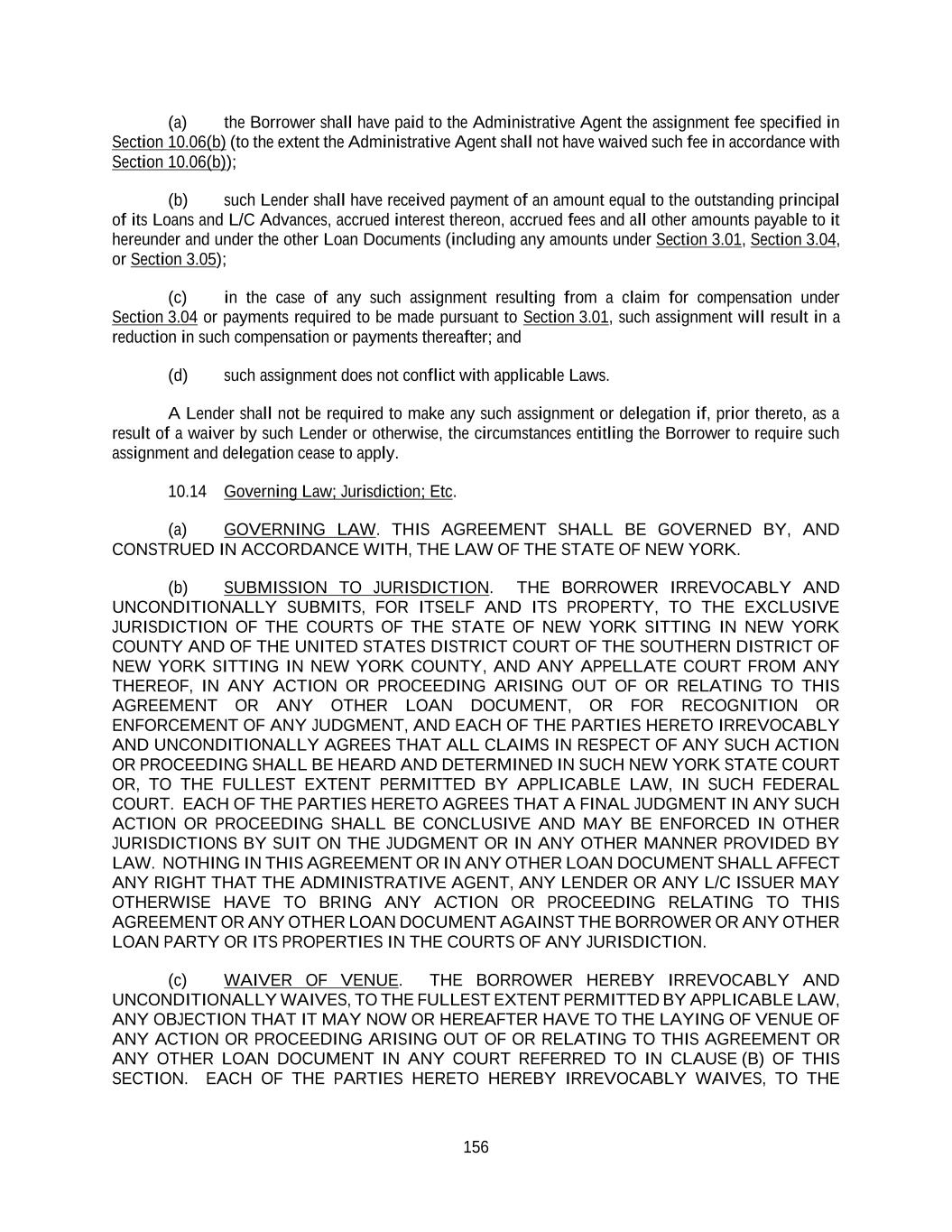156(a)借款人应已向行政代理人支付第10.06(b)条规定的转让费(以行政代理人不得根据第10.06(b)条免除该费用为限);(b)该贷款人应已收到相当于其贷款和信用证预付款的未偿本金、应计利息、应计费用以及根据本协议和其他贷款文件应支付给它的所有其他款项(包括根据第3.01条、第3.04条支付的任何款项,或第3.05条);(c)就根据第3.04条提出的赔偿要求或根据第3.01条要求支付的款项而产生的任何此种转让而言,此种转让将导致此后此种赔偿或付款的减少;(d)此种转让不与适用法律相冲突。如果在此之前,由于该贷款人的放弃或其他原因,使借款人有权要求该转让和转授的情况不再适用,则不得要求该贷款人作出任何该等转让或转授。10.14管辖法律;管辖权;等(a)管辖法律。本协议应受纽约州法律管辖,并根据纽约州法律进行构建。(b)提交管辖权。借款人在因本协议或任何其他贷款文件而产生或与之有关的任何诉讼或程序中,为其本身及其财产,不可撤销地和无条件地向位于纽约州的纽约州法院和位于纽约州的纽约州南部地区的美国地区法院的专属管辖权提交,或向来自其中任何一方的任何上诉法院提交,或并且此处的每一方当事人都不可撤销和无条件地同意,与任何此类行动或程序有关的所有索赔应在该纽约州法院审理和裁定,或在适用法律允许的最大限度内,在该联邦法院审理和裁定。此处的每一方都同意,任何此类行动或程序中的最终判决应是结论性的,并可在其他法域根据判决以诉讼或以法律规定的任何其他方式强制执行。本协议或任何其他贷款文件中的任何内容均不影响行政代理人、任何出借人或任何信用证发行人可能必须以其他方式在任何司法管辖区的法院对借款人或任何其他贷款当事人或其财产提起与本协议或任何其他贷款文件有关的任何诉讼或程序的任何权利。(c)放弃地点。借款人在此不可撤销和无条件地在适用法律允许的最大限度内放弃其现在或以后可能对本协议或本条(b)款所述任何法院产生的或与本协议或任何其他贷款文件有关的任何诉讼或程序的地点设定的任何异议。此处的每一方在此不可撤销地放弃,对