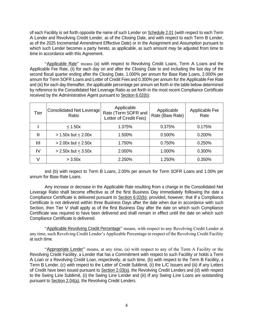 每项融资的4在附表2.01(就每一期限A贷款人和循环信贷贷款人而言,截至截止日期,就每一期限B贷款人而言,截至2025年增量修正生效日期)或在该贷款人成为本协议当事人所依据的转让和假设(如适用)中与该贷款人的名称相对的地方列出,因为该数额可能会根据本协议不时调整。“适用利率”是指(a)就循环信用贷款、A期贷款和适用的费率而言,(i)在截止日期当日及之后的每一天至截止日期后结束的第二财政季度的最后一天(含),基本利率贷款的年利率为1.000%,定期SOFR贷款和信用证费用的年利率为2.000%,适用的费率的年利率为0.300%,以及(ii)其后的每一天,参考行政代理人根据第6.02(b)节收到的最近一次合规证明中规定的合并净杠杆率确定的下表所列适用的每年百分率:等级合并净杠杆率适用利率(定期SOFR和信用证费用)适用利率(基准费率)适用费率I < 1.50x 1.375% 0.375% 0.175% II > 1.50x但< 2.00x 1.500% 0.500% 0.200% III > 2.00x但< 2.50x 1.750% 0.750% 0.250% IV > 2.50x但< 3.50x 2.000% 1.000% 0.300% V > 3.50x 2.250% 1.250% 0.350%(b)就B期贷款而言,定期SOFR贷款的年利率为2.00%,基本利率贷款的年利率为1.00%。因综合净杠杆率变动而导致适用利率的任何增加或减少,应自紧接根据第6.02(b)节交付合规证书之日后的第一个工作日起生效;但前提是,如果合规证书未在根据该节到期之日后的三个工作日内交付,然后,Tier V应自要求交付此类合规证书之日后的第一个工作日起适用,并应一直有效,直至交付此类合规证书之日。“适用循环信贷百分比”是指,就任何在任何时间的循环信贷贷款人而言,该循环信贷贷款人在该时间就循环信贷融资的适用百分比。“适当贷款人”是指,在任何时候,(a)就任何期限A融资或循环信贷融资而言,对该融资有承诺或在该时间分别持有期限A贷款或循环信用贷款的贷款人,(b)就期限B融资而言,B期贷款人,(c)就信用证分限额而言,(i)信用证发行人,以及(ii)如果任何信用证已根据第2.03(a)节签发,循环信贷放款人及(d)就周转额度分限额而言,(i)周转额度放款人及(ii)如根据第2.04(a)条有任何周转额度贷款未偿还,则为循环信贷放款人。