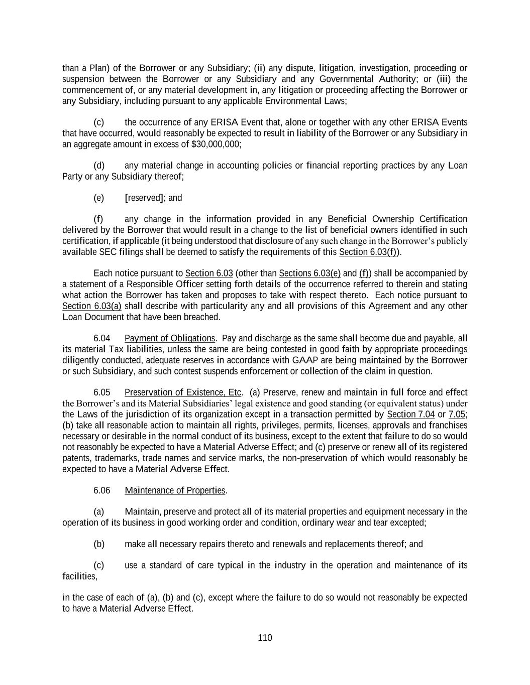 110 than a plan)的借款人或任何附属公司;(ii)借款人或任何附属公司与任何政府当局之间的任何争议、诉讼、调查、程序或中止;或(iii)影响借款人或任何附属公司的任何诉讼或程序的开始或任何重大发展,包括根据任何适用的环境法;(c)单独或连同已发生的任何其他ERISA事件一起发生的任何ERISA事件,合理预期将导致借款人或任何子公司的负债总额超过30,000,000美元;(d)任何贷款方或其任何子公司对会计政策或财务报告做法的任何重大变更;(e)[保留];(f)借款人交付的任何受益所有权证明中提供的信息的任何变更,将导致此类证明中确定的受益所有人名单发生变更,如适用(据了解,披露借款人公开的SEC文件中的任何此类变更应被视为满足本第6.03(f)节的要求)。依据第6.03条发出的每份通知(第6.03(e)及(f)条除外),须附有一份负责人员的陈述,述明其中所提述的事件的详情,并述明借款人已就此采取及拟就此采取的行动。根据第6.03(a)节发出的每份通知应具体说明本协议的任何和所有条款以及任何其他已被违反的贷款文件。6.04债务的支付。支付和解除作为相同的应成为到期和应付,其所有重大税务责任,除非相同的正通过勤勉进行的适当程序善意地提出争议,借款人或该子公司正在按照公认会计原则保持足够的准备金,并且该争议暂停执行或收取有关索赔。6.05存续保全等(a)除第7.04条或第7.05条允许的交易外,保留、续期和维持借款人及其重要子公司在其组织所管辖的法律下的合法存续和良好信誉(或同等地位)的完全效力和效力;(b)采取一切合理行动,维护其正常开展业务所必需或可取的所有权利、特权、许可、许可、批准和特许,除非不这样做不会被合理地预期会产生重大不利影响;以及(c)保留或更新其所有注册专利、商标、商号和服务标记,而不保留这些专利、商标、商号和服务标记将被合理地预期会产生重大不利影响。6.06物业维修。(a)在良好的工作秩序和状态下维护、保存和保护其业务运营所需的所有材料属性和设备,普通磨损除外;(b)对其进行所有必要的维修以及更新和更换;(c)在其设施的运营和维护中使用行业中典型的谨慎标准,在(a)、(b)和(c)中的每一种情况下,除非未能这样做会合理地预期会产生重大不利影响。