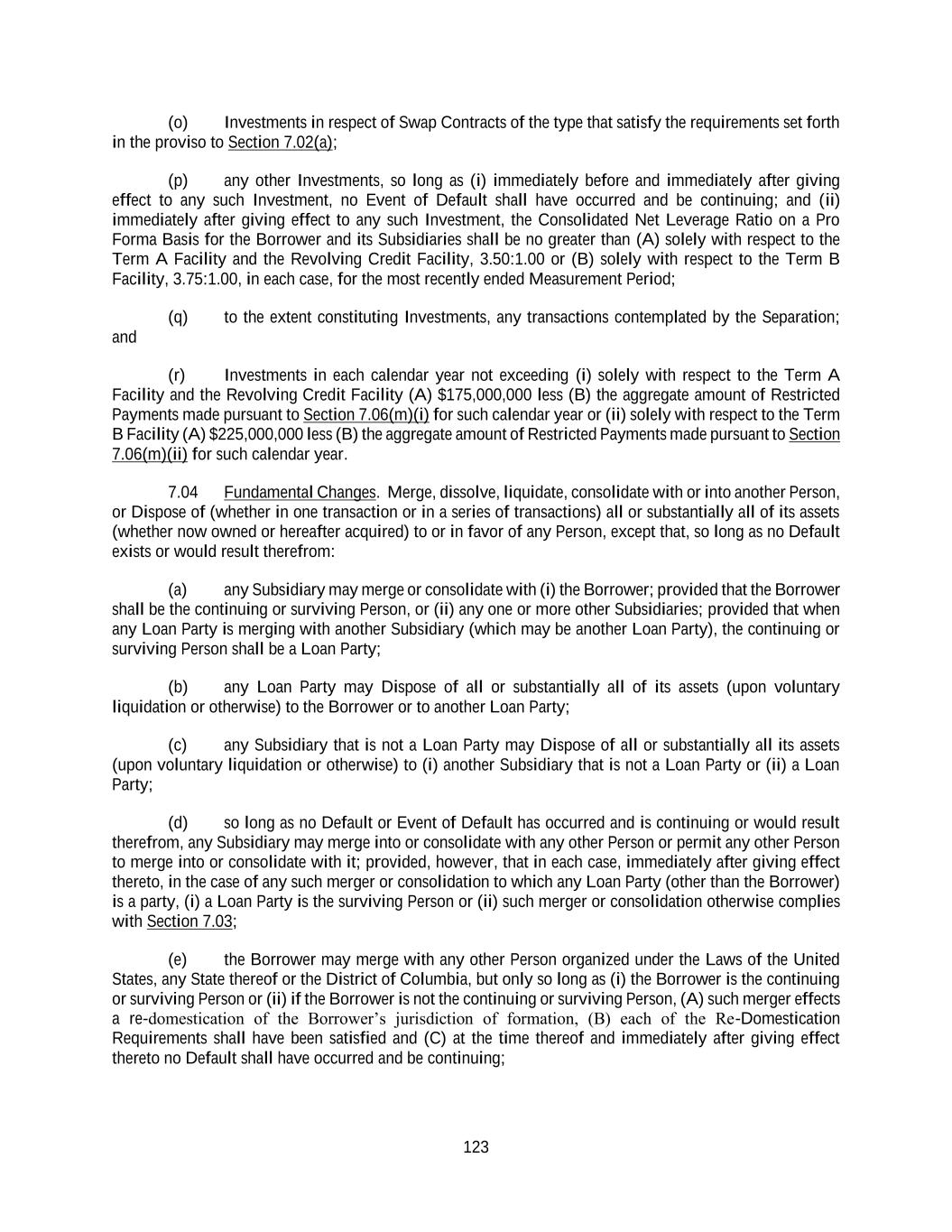 123(o)就满足第7.02(a)条但书所述要求的类型的互换合同进行的投资;(p)任何其他投资,只要(i)在紧接任何此类投资生效之前和之后,不得发生违约事件,并且仍在继续;(ii)在紧接任何此类投资生效之后,借款人及其子公司的备考综合净杠杆率仅就期限A融资和循环信贷融资而言不得高于(a),3.50:1.00或(b)仅就B期融资而言,3.75:1.00,在每种情况下,针对最近结束的计量期;(q)在构成投资的范围内,(r)每个日历年的投资不超过(i)仅就期限A融资和循环信贷融资(a)175,000,000美元减(b)根据第7.06(m)(i)节就该日历年作出的限制性付款总额或(ii)仅就期限B融资(a)225,000,000美元减(b)根据第7.06(m)(ii)节就该日历年作出的限制性付款总额。7.04基本面变化。合并、解散、清算、与另一人合并或并入另一人,或(不论是在一项交易或一系列交易中)将其全部或基本全部资产(不论是现在拥有或以后获得的)处置给任何人或以任何人为受益人,但只要不存在违约或由此将导致违约:(a)任何附属公司可与(i)借款人合并或合并;但借款人应为持续或存续的人,或(ii)任何一个或多个其他附属公司;但当任何贷款方与另一附属公司(可能是另一贷款方)合并时,持续或存续人应为贷款方;(b)任何贷款方可将其全部或基本全部资产(在自愿清算或其他情况下)处置给借款人或另一贷款方;(c)任何非贷款方的附属公司可将其全部或基本全部资产(在自愿清算或其他情况下)处置给(i)不是贷款方的另一附属公司或(ii)贷款方;(d)只要没有发生违约或违约事件,并且仍在继续或将由此产生,任何附属公司可与任何其他人合并或合并,或允许任何其他人与其合并或合并;但条件是,在每种情况下,在其生效后,在任何贷款方(借款人除外)为一方的任何此类合并或合并的情况下,(i)贷款方为存续人或(ii)此类合并或合并在其他方面符合第7.03条;(e)借款人可与根据美国、其任何州或哥伦比亚特区的法律组织的任何其他人合并,但只有在(i)借款人是持续的或尚存的人或(ii)如果借款人不是持续的或尚存的人,(a)此类合并影响到借款人的成立管辖权的重新归化,(b)每一项重新归化要求均应已得到满足,以及(c)在其发生时和在其生效后立即没有发生违约且仍在继续;