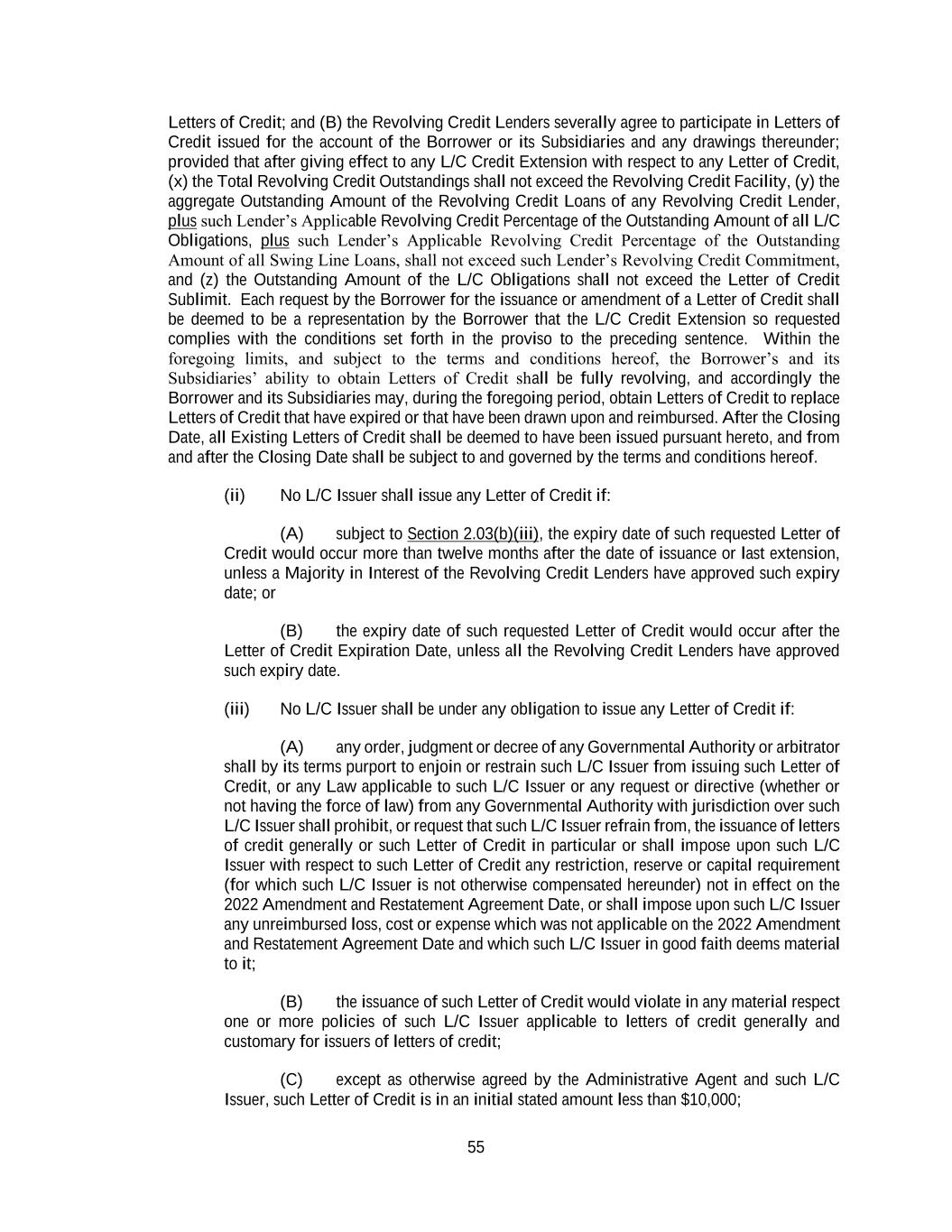 55份信用证;及(b)循环信贷放款人分别同意参与为借款人或其附属公司的账户签发的信用证及其项下的任何提款;但在就任何信用证实施任何信用证授信延期后,(x)循环信贷未偿还总额不得超过循环信贷融资,(y)任何循环信贷放款人的循环信贷贷款未偿还总额,加上该放款人适用的循环信贷占所有信用证债务未偿还金额的百分比,加上该贷款人适用的循环信贷占所有周转额度贷款未偿金额的百分比,不得超过该贷款人的循环信贷承诺,且(z)信用证债务的未偿金额不得超过信用证分限额。借款人提出的每一项开具或修改信用证的请求,均应视为借款人表示,如此请求的信用证授信延期符合前句但书中规定的条件。在上述限额内,并在符合本协议条款和条件的情况下,借款人及其子公司取得信用证的能力应当是完全循环的,据此,借款人及其子公司可以在前述期间内取得信用证,以取代已到期或已提款并偿付的信用证。截止日期后,所有现有信用证均应视为已依据本协议签发,自截止日期起及之后均应受本协议条款和条件的约束和管辖。(ii)在以下情况下,任何信用证发行人不得签发任何信用证:(a)在符合第2.03(b)(iii)条的规定下,该等所要求的信用证的到期日将发生在签发日期或最后一次延期日期之后的十二个月以上,除非循环信贷放款人的多数利益已批准该到期日;或(b)该等所要求的信用证的到期日将发生在信用证到期日之后,除非所有循环信贷放款人已批准该到期日。(iii)在以下情况下,任何信用证发行人均无义务签发任何信用证:(a)任何政府当局或仲裁员的任何命令、判决或判令,其条款看来应禁止或限制该信用证发行人签发该信用证,或适用于该信用证发行人的任何法律或对该信用证发行人具有管辖权的任何政府当局的任何请求或指示(无论是否具有法律效力)均应禁止或要求该信用证发行人不这样做,签发一般信用证或特别是该信用证,或应就该信用证向该信用证发行人施加任何在2022年修订和重述协议日期不生效的限制、准备金或资本要求(该信用证发行人未根据本协议获得其他补偿),或应向该信用证发行人施加任何未偿付的损失,在2022年修订和重述协议日期不适用且该信用证发行人善意认为对其重要的成本或费用;(b)签发该信用证将在任何重大方面违反该信用证发行人的一项或多项政策,这些政策一般适用于信用证,并适用于信用证发行人的惯例;(c)除行政代理人和该信用证发行人另有约定外,该信用证的初始声明金额低于10,000美元;