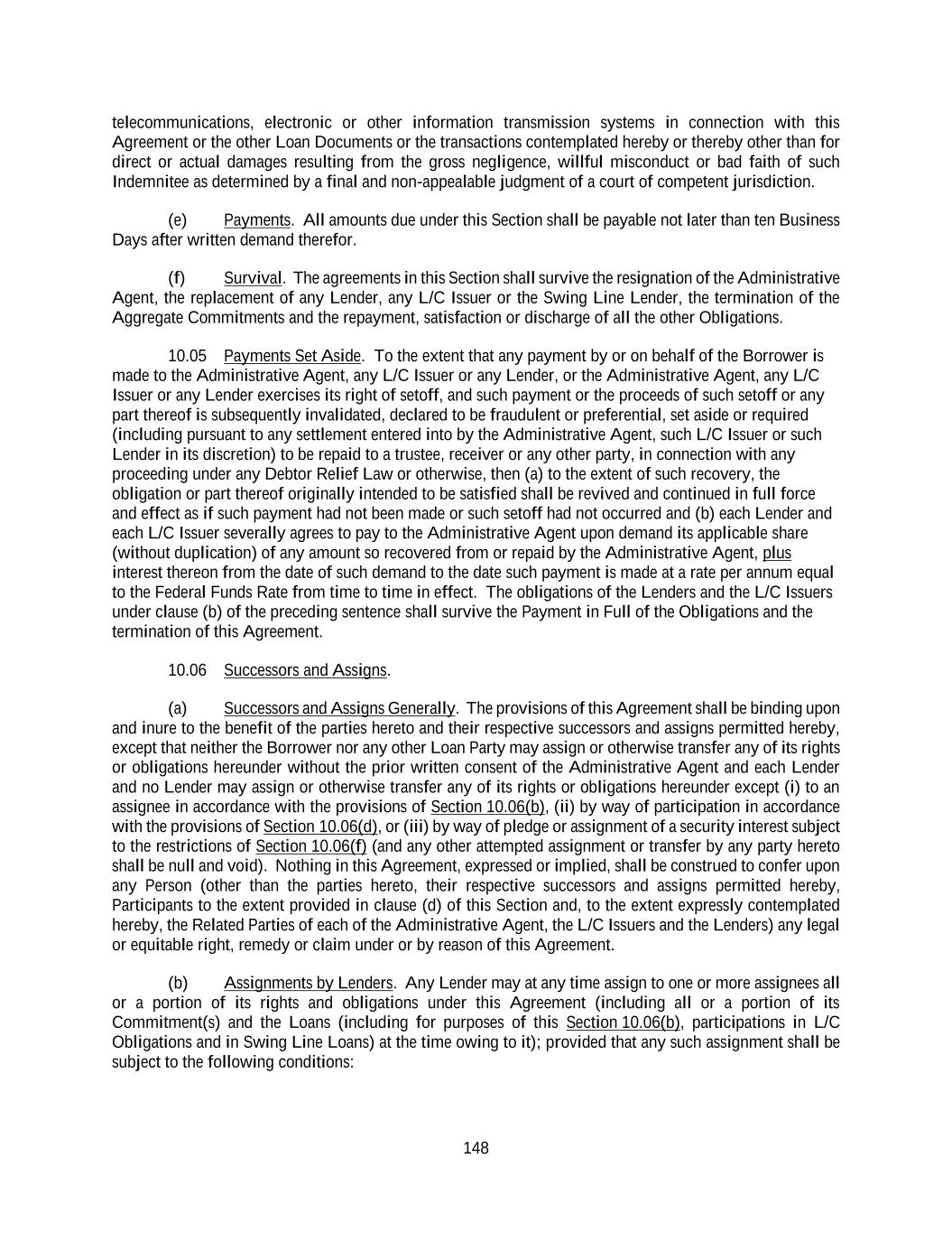 148个电信、电子或其他信息传输系统与本协议或其他贷款单证或本协议或由此设想的交易有关,但由有管辖权法院的最终和不可上诉的判决确定的此类受偿人的重大过失、故意不当行为或恶意导致的直接或实际损害除外。(e)付款。根据本条到期的所有款项,应在书面要求后十个营业日内支付。(f)生存。本节中的约定在行政代理人离职、更换任何贷款人、任何信用证发行人或周转线贷款人、终止合计承诺以及偿还、清偿或解除所有其他义务后仍然有效。10.05搁置付款。凡借款人或其代表向行政代理人、任何信用证发行人或任何贷款人或行政代理人、任何信用证发行人或任何贷款人支付的任何款项行使其抵销权,而该等付款或该等抵销的收益或其任何部分随后被作废、被宣布为欺诈或优惠、被撤销或被要求(包括根据行政代理人、该信用证发行人或该贷款人自行决定订立的任何和解)向受托人、接管人或任何其他方偿还,就根据任何债务人救济法或其他方式进行的任何程序而言,则(a)在该等追偿的范围内,原拟履行的义务或其部分应恢复并继续具有充分的效力和效力,犹如该等付款尚未支付或该等抵销尚未发生一样;及(b)每名贷款人及每名信用证发行人各自同意应要求向行政代理人支付其从该行政代理人如此追回或由该行政代理人偿还的任何款项的适用份额(不重复),加上从此类要求之日起至此类付款之日的利息,年利率等于不时生效的联邦基金利率。前一句(b)款规定的出借人和信用证开出人的义务,在全额支付该义务和本协议终止后仍然有效。10.06继任者和受让人。(a)继任人和一般指派人。本协议的规定对本协议各方及其各自的继承人和受让人具有约束力,并符合本协议允许的利益,但未经行政代理人和每个贷款人事先书面同意,借款人或任何其他贷款方均不得转让或以其他方式转让其在本协议项下的任何权利或义务,除(i)根据第10.06(b)节的规定转让给受让人外,任何贷款人不得转让或以其他方式转让其在本协议项下的任何权利或义务,(ii)根据第10.06(d)条的规定以参与的方式,或(iii)以受第10.06(f)条限制的担保权益的质押或转让的方式(以及任何其他任何一方试图转让或转让的任何其他转让或转让均无效)。本协议中任何明示或暗示的内容,均不得解释为授予任何人(除本协议各方、其各自的继承人和特此允许的受让人、在本节(d)条规定的范围内的参与者,以及在特此明确设想的范围内,各行政代理人、信用证发行人和贷款人的关联方)根据本协议或因本协议而享有的任何法律或衡平法权利、补救或索赔。(b)贷款人的转让。任何贷款人可随时向一个或多个受让人转让其在本协议下的全部或部分权利和义务(包括其承诺的全部或部分)以及当时欠其的贷款(包括就本条第10.06(b)款而言,参与信用证债务和周转额度贷款);但任何此类转让应受以下条件的约束: