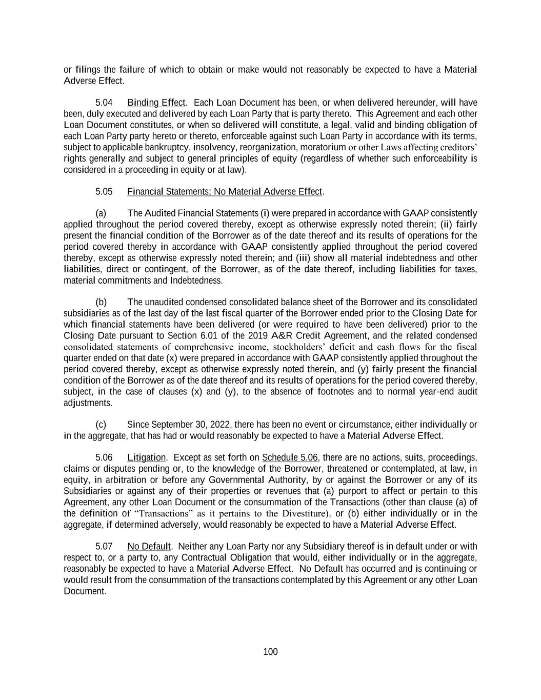 100或未能获得或提交的文件将无法合理地预期会产生重大不利影响。5.04绑定效果。每份贷款文件已经或在根据本协议交付时,将已由作为其当事方的每一贷款方正式签署和交付。本协议和彼此的贷款文件构成或在如此交付时将构成本协议或其每一贷款方的一项法律、有效和具有约束力的义务,可根据其条款对该贷款方强制执行,但须遵守适用的破产、无力偿债、重组、暂停执行或其他一般影响债权人权利的法律,并须遵守一般的衡平法原则(无论在衡平法程序中还是在法律上考虑这种可执行性)。5.05财务报表;无重大不利影响。(a)经审计的财务报表(i)是根据在所涵盖期间始终适用的公认会计原则编制的,除非其中另有明确说明;(ii)公允列报借款人截至财务报表之日的财务状况及其在所涵盖期间按照在所涵盖期间始终适用的公认会计原则的经营业绩,除非其中另有明确说明;(iii)显示借款人截至财务报表之日的所有重大债务和其他直接或或有负债,包括税款、重大承诺和债务负债。(b)借款人及其合并子公司截至借款人最后一个财政季度最后一天的未经审计的简明合并资产负债表在根据2019年A & R信贷协议第6.01节在截止日期之前交付(或被要求交付)财务报表的截止日期之前结束,而在该日期(x)结束的财政季度的相关简明综合全面收益、股东赤字和现金流量表是根据在整个涵盖期间一致适用的公认会计原则编制的,除其中另有明确说明外,以及(y)公允列报借款人截至财务状况之日的财务状况及其所涵盖期间的经营业绩,但在(x)和(y)条的情况下,以没有脚注和正常的年终审计调整为前提。(c)自2022年9月30日以来,没有任何事件或情况,无论是个别的还是总体的,已经或将合理地预期会产生重大不利影响。5.06诉讼。除附表5.06所列情况外,没有任何诉讼、诉讼、程序、索赔或争议待决,或据借款人所知,在法律上、股权上、仲裁中或在任何政府当局面前,由借款人或其任何附属公司或针对其任何财产或收入,或针对其任何财产或收入(a)看来影响或与本协议、任何其他贷款文件或交易的完成有关(与资产剥离有关的“交易”定义的(a)款除外),或(b)单独或合计,如果被不利地确定,将合理地预期会产生重大不利影响。5.07无违约。任何贷款方或其任何附属公司均不存在任何单独或合计合理预期会产生重大不利影响的合同义务项下或与之相关的违约情况,也不是任何合同义务的一方。本协议或任何其他贷款文件所设想的交易的完成未发生且仍在继续或将导致违约。