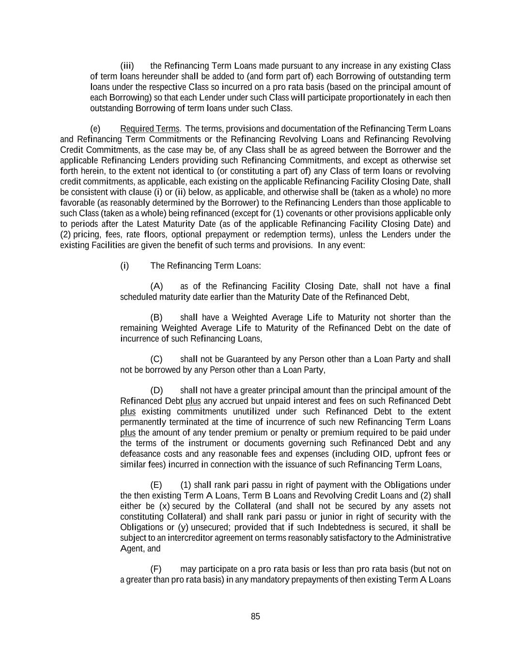 85(iii)根据本协议项下任何现有类别定期贷款的任何增加而作出的再融资定期贷款,应按比例(基于每笔借款的本金金额)添加到相应类别下的每笔未偿还定期贷款的借款中(并构成其一部分),以便该类别下的每个贷款人将按比例参与该类别下的每笔当时未偿还的定期贷款的借款。(e)所需条款。任何类别的再融资定期贷款及再融资定期承诺或再融资循环贷款及再融资循环信贷承诺(视属何情况而定)的条款、条文及文件,须由借款人与提供该等再融资承诺的适用再融资贷款人之间协定,除本协议另有规定外,在与适用的再融资融资融资截止日期各自存在的任何类别的定期贷款或循环信贷承诺(如适用)不相同(或构成其一部分)的范围内,应与适用的再融资融资截止日期各自存在的下文第(i)或(ii)款(如适用)一致,及以其他方式(整体而言)对再融资放款人的优惠(由借款人合理厘定)不得高于适用于该类别(整体而言)正在进行再融资的放款人(但(1)契诺或其他条文仅适用于最后到期日(截至适用的再融资融资融资截止日期)后的期间及(2)定价、费用、利率下限、可选择的提前还款或赎回条款除外),除非现有融资项下的放款人获得该等条款及条文的利益。无论如何:(i)再融资定期贷款:(a)截至再融资便利结束日,不得有早于再融资债务到期日的最终预定到期日,(b)应有不短于该等再融资贷款发生之日再融资债务的剩余加权平均到期日的加权平均到期日,(c)不得由贷款方以外的任何人提供担保,且不得由贷款方以外的任何人借入,(d)的本金额不得高于再融资债务的本金额加上该再融资债务的任何应计但未支付的利息和费用加上该再融资债务下未使用的现有承诺,但以在发生该等新的再融资定期贷款时永久终止为限,加上根据管辖该再融资债务的文书或文件的条款以及任何撤销费用和任何合理的费用和开支(包括OID,预付费用或类似费用)与发行该等再融资定期贷款有关,(e)(1)应与当时现有的A期贷款、B期贷款和循环信用贷款项下的债务享有同等受偿权,且(2)应由(x)以抵押品作担保(且不应由任何不构成抵押品的资产作担保),并应与该等债务享有同等受偿权或次级担保权,或(y)无担保;但如该等债务有担保,它应受制于以行政代理人合理满意的条款达成的债权人间协议,并且(F)可以按比例或低于比例(但不得高于比例)参与当时现有A期贷款的任何强制性提前还款