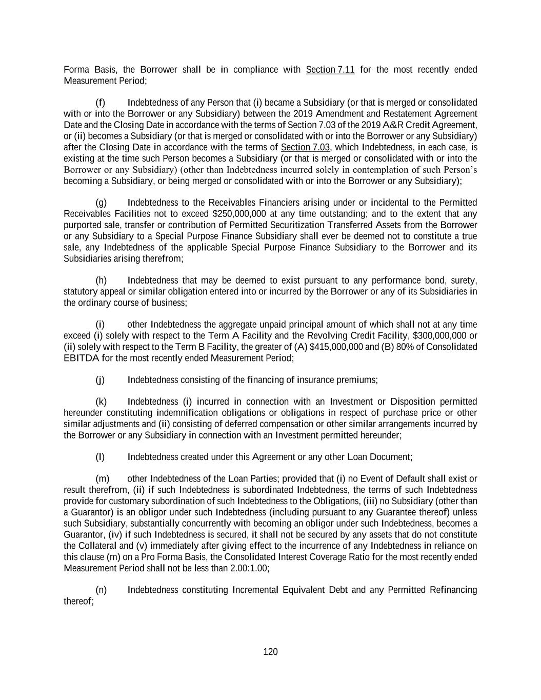 120 Forma Basis,借款人应在最近结束的计量期遵守第7.11节;(f)在2019年修订和重述协议日期与根据2019年A & R信贷协议第7.03节条款的结束日期之间(i)成为子公司(或与借款人或任何子公司合并或合并)的任何人的债务,或(ii)在根据第7.03条的条款的截止日期后成为附属公司(或与借款人或任何附属公司合并或合并),在每种情况下,在该人成为附属公司(或与借款人或任何附属公司合并或合并)时存在债务(但仅因考虑该人成为附属公司而招致的债务除外,或与借款人或任何附属公司合并或合并);(g)在任何时候根据许可的应收账款融资产生或附带产生的对应收账款融资人的未偿债务不超过250,000,000美元;且在借款人或任何附属公司向特殊目的融资子公司出售、转让或贡献许可的证券化转让资产的任何声称的范围内,应始终被视为不构成真正的出售,借款人及其附属公司的适用特殊目的融资附属公司由此产生的任何债务;(h)根据借款人或其任何附属公司在正常业务过程中订立或招致的任何履约保证金、担保、法定上诉或类似义务可能被视为存在的债务;(i)其他债务,其未付本金总额在任何时候均不得超过(i)仅就A期融资和循环信贷融资而言,300,000,000美元或(ii)仅就B期融资而言,(a)415,000,000美元和(b)最近结束的计量期合并EBITDA的80%两者中的较高者;(j)由保险费融资构成的债务;(k)(i)与本协议允许的投资或处置相关的债务,构成与购买价格或其他类似调整有关的赔偿义务或义务,以及(ii)包括借款人或任何子公司就本协议允许的投资产生的递延补偿或其他类似安排;(l)根据本协议或任何其他贷款文件产生的债务;(m)贷款方的其他债务;提供(i)不存在任何违约事件或由此导致任何违约事件,(ii)如果此类债务为次级债务,则此类债务的条款规定此类债务在习惯上从属于债务,(iii)没有任何子公司(担保人除外)是此类债务下的债务人(包括根据其任何担保),除非该子公司在实质上同时成为此类债务下的债务人,成为担保人,(iv)如果此类债务有担保,不得以不构成担保物的任何资产作担保,且(v)在依据本条款(m)项在备考基础上发生任何债务后立即,最近结束的计量期的合并利息覆盖率不得低于2.00:1.00;(n)构成增量等值债务的债务及其任何许可的再融资;