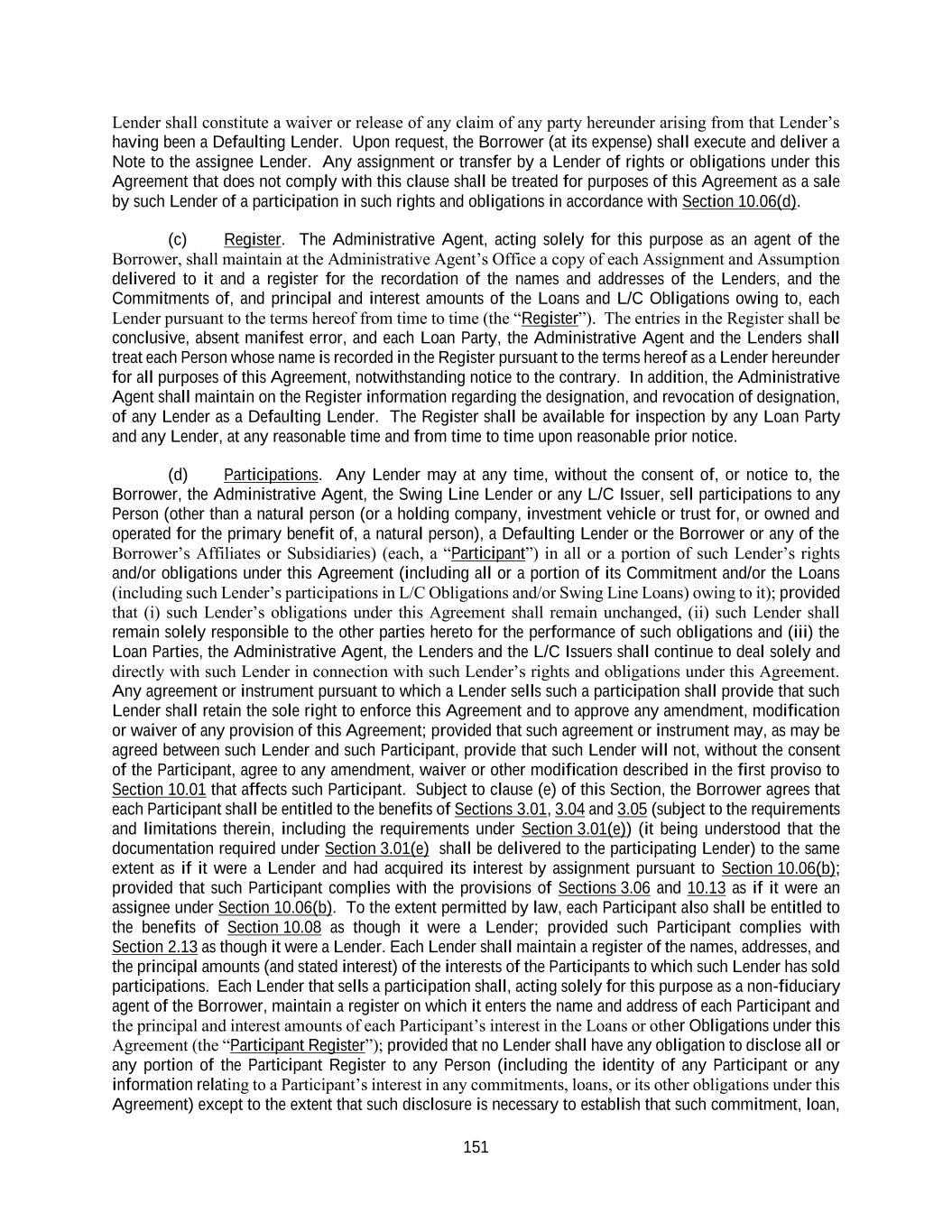 151贷款人应构成对任何一方在本协议项下因该贷款人一直是违约贷款人而产生的任何索赔的放弃或解除。经请求,借款人应(自费)签立并向受让出借人交付票据。出借人对本协议项下权利或义务的任何不符合本条款的转让或转让,就本协议而言,应视为该出借人根据第10.06(d)节出售参与此类权利和义务。(c)登记。行政代理人作为借款人的代理人仅为此目的行事,应在行政代理人办公室保存一份交付给它的每项转让和承担的副本,以及一份登记册,用于记录贷款人的姓名和地址,以及根据本协议条款不时向每个贷款人作出的承诺,以及所欠的贷款和信用证义务的本金和利息金额(“登记册”)。登记册内的记项应是结论性的,无明显错误,且每一贷款方、行政代理人和贷款人应将根据本协议条款记录在登记册内的每一人视为本协议项下的贷款人,尽管有相反的通知。此外,行政代理人还应在登记册上保存有关指定或撤销指定任何贷款人为违约贷款人的信息。登记册可供任何贷款方及任何贷款人在任何合理时间及经合理事先通知后不时查阅。(d)参与。任何贷款人可随时在未经借款人、行政代理人、周转线贷款人或任何信用证发行人同意或通知的情况下,向任何人(自然人(或自然人的控股公司、投资工具或信托,或为自然人的主要利益而拥有和经营的)、违约贷款人或借款人或借款人的任何关联公司或子公司)(每一,a“参与者”)在本协议项下的全部或部分此类贷款人的权利和/或义务(包括其全部或部分承诺和/或欠其的贷款(包括此类贷款人参与信用证义务和/或周转额度贷款);但前提是(i)此类贷款人在本协议项下的义务保持不变,(ii)此类贷款人仍应对履行此类义务的其他各方承担全部责任,以及(iii)贷款方、行政代理人,贷款人和信用证发行人应继续就该贷款人在本协议项下的权利和义务单独直接与该贷款人进行交易。贷款人出售此类参与所依据的任何协议或文书应规定,该贷款人应保留强制执行本协议以及批准对本协议任何条款的任何修改、修改或放弃的唯一权利;但该协议或文书可根据该贷款人与该参与者之间可能达成的协议,规定该贷款人未经参与者同意,不会同意第10.01条第一个但书中所述的影响该参与者的任何修改、放弃或其他修改。除本条(e)款另有规定外,借款人同意每名参与者有权享有第3.01、3.04及3.05条的利益(但须遵守其中的规定和限制,包括第3.01(e)条的规定)(但有一项理解,即根据第3.01(e)条所要求的文件应交付给参与的贷款人),其程度与其是贷款人并根据第10.06(b)条通过转让获得其权益的程度相同;但该参与者须遵守第3.06及10.13条的规定,犹如其是第10.06(b)条下的受让人一样。在法律允许的范围内,每个参与者也应有权享有第10.08条的利益,如同其是贷款人一样;但前提是该参与者遵守第2.13条,如同其是贷款人一样。每个出借人应保存一份登记册,记录该出借人向其出售参与权的参与者的名称、地址和权益本金金额(以及规定的权益)。出售参与的每一贷款人应作为借款人的非受托代理人,仅为此目的而保持一份登记册,在该登记册上输入每一参与者的名称和地址以及每一参与者在本协议项下的贷款或其他义务中的权益的本金和利息金额(“参与者登记册”);但任何贷款人均无义务向任何人披露参与者登记册的全部或任何部分(包括任何参与者的身份或与参与者在任何承诺中的权益有关的任何信息, 贷款,或其在本协议下的其他义务),但为确定此类承诺、贷款、