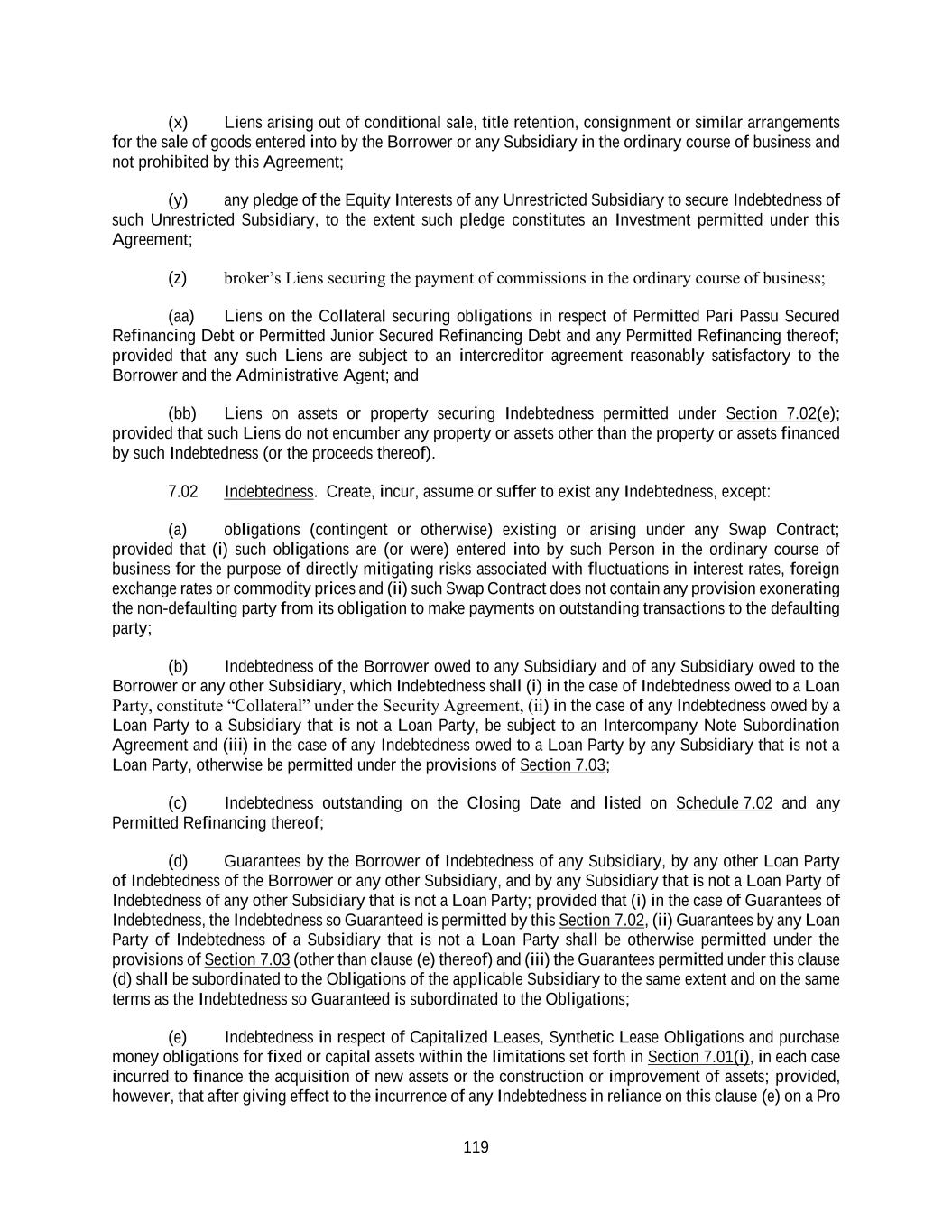 119(x)借款人或任何附属公司在正常业务过程中订立且不受本协议禁止的有条件出售、所有权保留、托运或类似货物销售安排所产生的留置权;(y)任何非受限制附属公司的股权的任何质押,以担保该非受限制附属公司的债务,在此种质押构成本协议允许的投资的范围内;(z)经纪人在正常业务过程中为支付佣金提供担保的留置权;(aa)就许可的Pari Passu有担保再融资债务或许可的初级有担保再融资债务及其任何许可的再融资对抵押品担保义务的留置权;但任何此类留置权须遵守借款人和行政代理人合理满意的债权人间协议;以及(bb)根据第7.02(e)节允许的资产或财产担保债务的留置权;前提是该等留置权并不设押任何财产或资产,但由该等债务所融资的财产或资产(或其收益)除外。7.02负债。产生、招致、承担或承受存在任何债务,但以下情况除外:(a)根据任何掉期合同存在或产生的债务(或有或其他);但(i)该等债务是(或曾经)由该人在日常业务过程中订立,目的是直接减轻与利率波动相关的风险,外汇汇率或商品价格,且(ii)该掉期合约不包含免除非违约方就未偿交易向违约方付款的义务的任何条款;(b)借款人欠任何子公司的债务以及任何子公司欠借款人或任何其他子公司的债务,该债务应(i)在欠贷款方的债务的情况下,构成担保协议项下的“抵押品”,(ii)在贷款方欠非贷款方的子公司的任何债务的情况下,须受公司间票据从属协议规限,及(iii)如属非贷款方的任何附属公司欠贷款方的任何债务,则根据第7.03条的规定另有许可;(c)在截止日期未偿还并列于附表7.02的债务及其任何许可的再融资;(d)任何附属公司的债务的借款人、借款人或任何其他附属公司的债务的任何其他贷款方的担保,以及由非贷款方的任何附属公司的任何其他非贷款方的负债的贷款方;但(i)在债务担保的情况下,如此担保的债务是本条第7.02款所允许的,(ii)任何贷款方对非贷款方的附属公司的债务提供的担保,应根据第7.03条的规定(其中(e)条除外)另有许可;(iii)根据本(d)条允许的担保应在与如此担保的债务从属于债务相同的程度和相同的条件下从属于适用的附属公司的债务;(e)在第7.01(i)条规定的限制范围内与资本化租赁、合成租赁债务和固定资产或资本资产的购置款义务有关的债务,在每种情况下,为购置新资产或建造或改善资产而发生的融资;但条件是,在发生依赖本条款(e)项的任何债务后,对Pro