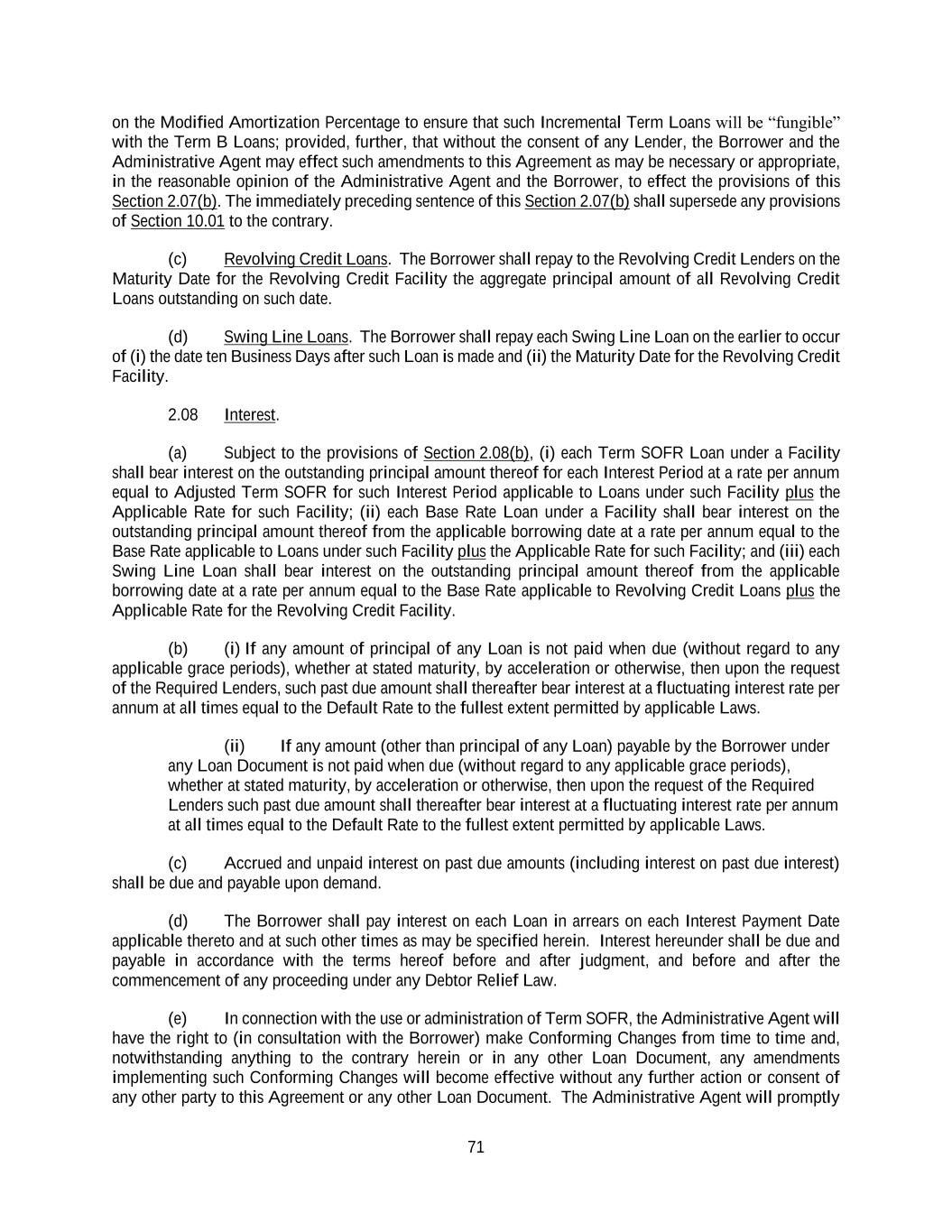 71关于修改后的摊销百分比,以确保此类增量定期贷款将与B期贷款“可替代”;此外,前提是未经任何贷款人同意,借款人和行政代理人可以对本协议进行行政代理人和借款人合理认为必要或适当的修订,以实施本节2.07(b)的规定。本条第2.07(b)条的前一句应取代第10.01条的任何相反规定。(c)循环信用贷款。借款人应于循环信贷融资到期日向循环信贷贷款人偿还在该日期未偿还的所有循环信贷贷款的本金总额。(d)周转线路贷款。借款人须于(i)作出该等贷款后十个营业日的日期及(ii)循环信贷融资的到期日的较早者偿还每笔周转额度贷款。2.08利息。(a)除第2.08(b)条的条文另有规定外,(i)融资项下的每笔定期SOFR贷款须按相当于适用于该融资项下贷款的该等利息期的调整后定期SOFR加上该融资项下适用利率的年利率,对每个利息期的未偿本金金额承担利息;(ii)融资项下的每笔基本利率贷款须按相当于适用于该融资项下贷款的基本利率加上该融资项下适用利率的年利率,对自适用借款日起的未偿本金金额承担利息;(iii)每笔周转额度贷款须按相当于适用于循环信贷贷款的基准利率加上适用于循环信贷融资的利率的年利率,对其自适用借款日期起的未偿还本金金额承担利息。(b)(i)如任何贷款的任何本金未在到期时支付(不考虑任何适用的宽限期),不论是在规定的到期日、通过加速或其他方式,则根据所需贷款人的请求,该逾期金额此后应在适用法律允许的最大范围内按等于违约率的任何时间的浮动年利率计息。(ii)如借款人根据任何贷款文件应付的任何款额(任何贷款的本金除外)未在到期时(不考虑任何适用的宽限期)支付,不论是在规定的到期日、通过加速或其他方式,则应所需贷款人的请求,该逾期款额其后须按在适用法律允许的最大限度内按等于违约率的任何时间的浮动年利率计息。(c)逾期款项的应计未付利息(包括逾期未付利息)应按要求到期应付。(d)借款人须在适用于每笔贷款的付息日及在本条所指明的其他时间,就每笔拖欠贷款支付利息。本协议项下的利息应在判决前后以及任何债务人救济法下的任何程序启动前后按照本协议的条款到期支付。(e)就使用或管理定期SOFR而言,行政代理人将有权(在与借款人协商后)不时作出符合规定的变更,尽管本协议或任何其他贷款文件中有任何相反的规定,但实施此类符合规定的变更的任何修订将生效,而无需本协议或任何其他贷款文件的任何其他方采取任何进一步行动或同意。行政代理人将及时