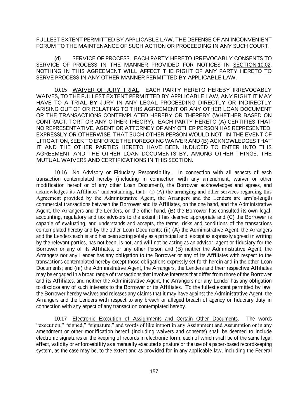 157在适用法律允许的最充分范围内,为在任何此类法院维持此类行动或程序的不方便的论坛的辩护。(d)流程服务。此处的每一方均不可撤销地同意以第10.02条通知规定的方式送达流程。本协议中的任何内容均不影响本协议任何一方以适用法律允许的任何其他方式服务过程的权利。10.15放弃陪审团审判。此处的每一方在此不可撤销地放弃,在适用法律允许的最充分范围内,其在直接或间接产生于或与本协议或任何其他贷款文件或此处或此处设想的交易(无论是基于合同、侵权或任何其他理论)有关的任何法律程序中可能拥有的由陪审团审判的任何权利。此处的每一方(a)证明没有任何其他人的代表、代理人或代理人明示或以其他方式代表该其他人在发生诉讼时不会寻求强制执行上述豁免,并且(b)承认其和此处的其他方已被诱导订立本协议和其他贷款文件,其中包括10.16不承担咨询或信托责任。就本协议所设想的每项交易的所有方面(包括与本协议的任何修改、放弃或其他修改或任何其他贷款文件有关的),借款人承认并同意,并承认其关联机构的理解:(i)(a)行政代理人、安排人和贷款人提供的有关本协议的安排和其他服务,一方面是借款人与其关联机构、行政代理人、安排人和贷款人之间的公平商业交易,另一方面,(b)借款人已咨询其自身的法律、会计、监管和税务顾问在其认为适当的范围内,以及(c)借款人能够评估、理解和接受特此和其他贷款文件所设想的交易的条款、风险和条件;(ii)(a)行政代理人、安排人和贷款人各自现在和一直仅作为委托人行事,除非有关各方以书面明确约定,否则过去、现在和将来都不会作为借款人或其任何关联公司的顾问、代理人或受托人,或任何其他人,以及(b)行政代理人、安排人或任何贷款人均不对借款人或其任何关联人就本协议所设想的交易承担任何义务,但本协议和其他贷款文件中明确规定的义务除外;及(iii)行政代理人、安排人、贷款人及其各自关联人可能参与涉及与借款人及其关联人的利益不同的范围广泛的交易,而行政代理人,安排人或任何贷款人均有义务向借款人或其关联机构披露任何此类权益。在法律允许的最大范围内,借款人特此放弃和解除其可能就与特此设想的任何交易的任何方面有关的任何违反或涉嫌违反代理或信托义务而对行政代理人、安排人和贷款人提出的任何索赔。10.17转让和某些其他文件的电子执行。在任何转让和假设中,或在本协议的任何修改或其他修改(包括放弃和同意)中,“执行”、“签署”、“签署”和类似含义的词语应被视为包括电子签字或以电子形式保存记录,每一项均应在任何适用法律(包括联邦法律)规定的范围内并视情况与手工签署的签字或使用纸质记录保存系统具有相同的法律效力、有效性或可执行性
