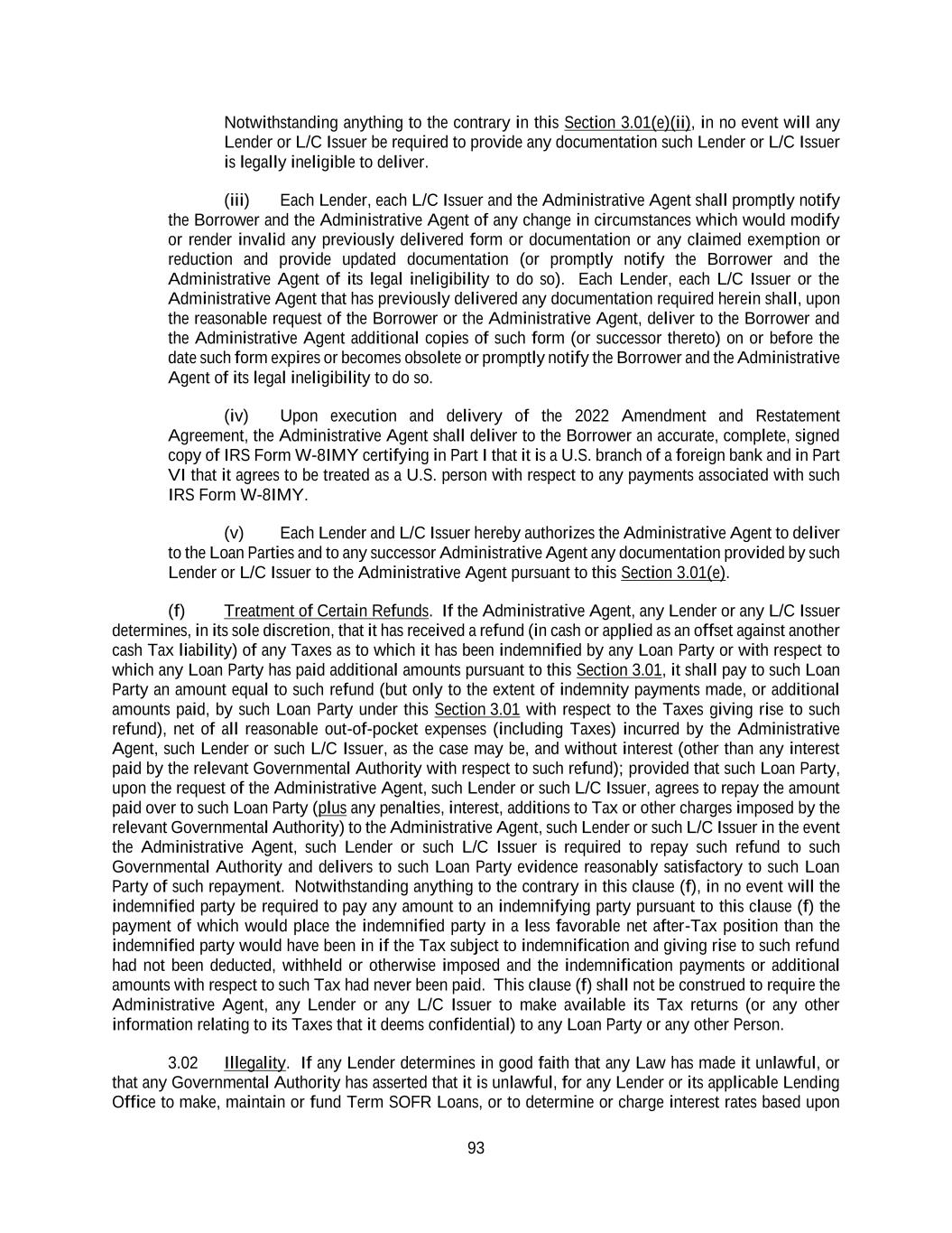 93尽管本条第3.01(e)(ii)款有任何相反规定,在任何情况下,都不会要求任何贷款人或信用证发行人提供任何该贷款人或信用证发行人在法律上没有资格交付的文件。(三)每一贷款人、每一信用证发行人和行政代理人应迅速将任何情况的变化通知借款人和行政代理人,这些变化将修改或使先前交付的任何表格或文件或任何声称的豁免或减少无效,并提供更新的文件(或迅速通知借款人和行政代理人其法律上没有资格这样做)。每名贷款人、每名信用证发行人或先前已交付本文所要求的任何文件的行政代理人,应经借款人或行政代理人的合理要求,在该表格到期或过时之日或之前向借款人及行政代理人交付该表格的额外副本(或其后继本)或及时通知借款人及行政代理人其合法无资格这样做。(iv)在执行和交付2022年修订和重述协议时,行政代理人应向借款人交付一份准确、完整、经签署的IRS表格W-8IMY副本,在第I部中证明其为外国银行的美国分行,并在第VI部中同意就与该IRS表格W-8IMY相关的任何付款被视为美国人。(v)每一贷款人和信用证发行人特此授权行政代理人向贷款方和任何继任行政代理人交付该贷款人或信用证发行人根据本条3.01(e)向行政代理人提供的任何文件。(f)某些退款的处理。如行政代理人、任何贷款人或任何信用证发行人全权酌情决定,其已收到由任何贷款方赔偿的任何税款的退款(以现金或作为与另一现金税务责任的抵销),或任何贷款方已根据本条3.01支付额外款项,则其须向该贷款方支付与该退款相等的金额(但仅限于已支付的弥偿款项或已支付的额外款项,由该贷款方根据本条第3.01条就产生该等退款的税款),扣除行政代理人、该贷款人或该信用证发行人(视属何情况而定)所招致的所有合理自付费用(包括税款),且不计利息(有关政府当局就该等退款所支付的任何利息除外);但该贷款方应行政代理人、该贷款人或该信用证发行人的要求,同意偿还已支付予该贷款方的款项(加上任何罚款、利息,对相关政府当局征收的税款或其他费用的附加)向行政代理人、该贷款人或该信用证发行人支付,如果该行政代理人、该贷款人或该信用证发行人被要求向该政府当局偿还该退款,并向该贷款方交付该贷款方合理满意的此类偿还的证据。尽管本(f)条有任何相反的规定,但在任何情况下,均不会要求受赔方根据本(f)条向受赔方支付任何金额,如果未扣除、扣缴或以其他方式征收须予赔偿并导致此类退款的税款,且从未支付与此类税款相关的赔偿款项或额外金额,则支付该款项将使受赔方处于比受赔方更不利的税后净额状况。本(f)条不得解释为要求行政代理人、任何贷款人或任何信用证发行人向任何贷款方或任何其他人提供其纳税申报表(或其认为保密的与其税款有关的任何其他信息)。3.02违法。如果任何贷款人善意地确定任何法律规定任何贷款人或其适用的贷款办公室发放、维持或资助定期SOFR贷款,或确定或收取基于
