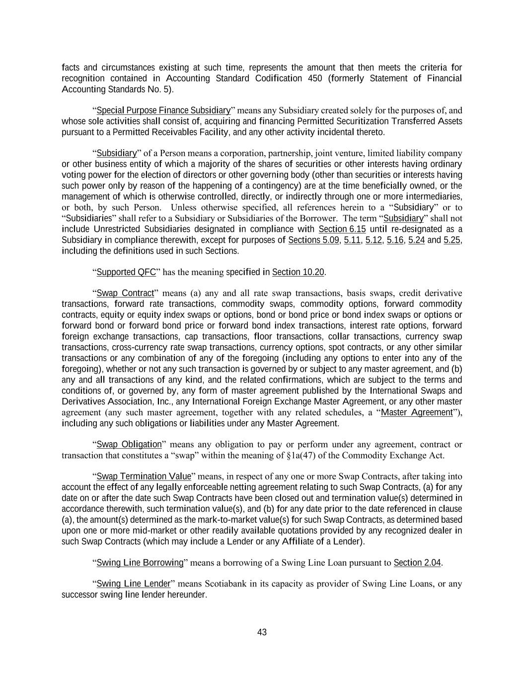 当时存在的43个事实和情节,代表当时符合《会计准则编纂450》(原《财务会计准则第5号声明》)所载确认标准的金额。“特殊目的融资子公司”是指仅为根据许可的应收账款融资收购和融资许可的证券化转让资产的目的而设立的任何子公司,其唯一活动应包括,以及与此相关的任何其他附带活动。一人的“附属公司”是指公司、合伙企业、合营企业、有限责任公司或其他商业实体,其在选举董事或其他理事机构时拥有普通投票权的证券或其他权益的多数股份(仅因意外事件的发生而具有该权力的证券或权益除外)在当时实益拥有,或其管理层由该人以其他方式直接或通过一个或多个中介间接控制,或两者兼而有之。除非另有说明,本文中所有提及的“子公司”或“子公司”均指借款人的一个或多个子公司。除第5.09、5.11、5.12、5.16、5.24和5.25节(包括此类章节中使用的定义)的目的外,“子公司”一词不应包括根据第6.15节指定的非限制性子公司,直至根据该节重新指定为子公司。“支持的QFC”具有第10.20节规定的含义。“掉期合约”是指(a)任何及所有利率掉期交易、基差掉期、信用衍生品交易、远期利率交易、商品掉期、商品期权、远期商品合约、权益或权益指数掉期或期权、债券或债券价格或债券指数掉期或期权或远期债券或远期债券价格或远期债券指数交易、利率期权、远期外汇交易、上限交易、下限交易、领子交易、货币掉期交易、交叉货币汇率掉期交易、货币期权、即期合约,或任何其他类似交易或上述任何一项的任何组合(包括订立上述任何一项的任何选择权),不论任何该等交易是否受任何主协议管辖或受其约束,以及(b)任何及所有任何种类的交易,以及相关确认,其受国际掉期和衍生品协会(International Swaps and Derivatives Association,Inc.)、任何国际外汇主协议或任何其他主协议(任何该等主协议,连同任何相关附表,“主协议”),包括任何主协议项下的任何此类义务或责任。“掉期义务”是指根据《商品交易法》第1a(47)条含义内构成“掉期”的任何协议、合同或交易支付或履行的任何义务。“掉期终止价值”是指,就任何一份或多份掉期合约而言,在考虑到与该等掉期合约有关的任何具有法律强制执行力的净额结算协议的效力后,(a)在该等掉期合约平仓和据此确定的终止价值之日或之后的任何日期,该等终止价值,以及(b)在(a)条所指日期之前的任何日期,被确定为该等掉期合约的按市值计价的金额,根据此类掉期合约中任何认可交易商(可能包括贷款人或贷款人的任何关联公司)提供的一个或多个中间市场或其他现成的报价确定。“周转线借款”是指根据第2.04节借款周转线贷款。“Swing Line Lender”是指作为Swing Line Loans提供商的丰业银行,或本协议下的任何后续Swing Line Lender。