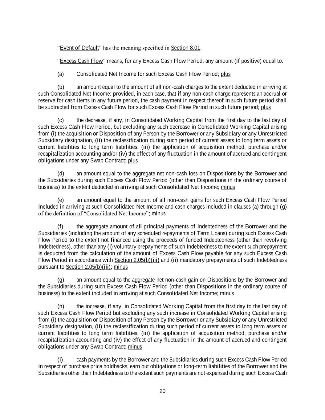 20“违约事件”具有第8.01节规定的含义。“超额现金流”是指,对于任何超额现金流期,任何金额(如果为正数)等于:(a)该超额现金流期的合并净收益;加上(b)等于在得出该合并净收益时扣除的所有非现金费用的金额;前提是,在每种情况下,如果任何非现金费用代表任何未来期间现金项目的应计或准备金,该等未来期间有关的现金付款应从该等未来期间该超额现金流期的超额现金流量中减去;加上(c)该超额现金流期第一天至最后一天的合并营运资金减少(如有),但不包括因(i)借款人或任何附属公司或任何非限制性附属公司指定收购或处置任何人而导致的合并营运资金减少,(二)在该期间将流动资产重新分类为长期资产或将流动负债重新分类为长期负债,(三)采用收购法,购买和/或资本重组会计和/或(iv)任何掉期合同项下的应计债务和或有债务金额的任何波动的影响;加上(d)在得出该合并净收益时扣除的范围内,等于借款人和子公司在该超额现金流期内处置的非现金净损失总额(正常业务过程中的处置除外)的金额;减去(e)等于在得出该合并净收益时包含的该超额现金流期的所有非现金收益金额的金额以及“合并净收益”定义(a)至(g)条中包含的现金费用;减去(f)在该超额现金流期内借款人和子公司的所有债务本金支付总额(包括定期贷款的任何预定偿还额),但以未使用已融资债务的收益(循环债务除外)融资为限,除任何(i)自愿提前偿还此类债务外,前提是根据第2.05(b)(iii)节从任何此类超额现金流期的超额应付现金流量金额的计算中扣除此类提前还款,以及(ii)根据第2.05(b)(iii)节强制提前偿还此类债务;减去(g)等于借款人和子公司在该超额现金流期内处置的非现金净收益总额(正常业务过程中的处置除外)的金额,以达到该合并净收益的范围为限;减去(h)增加额,如有,则在该超额现金流期的第一天至最后一天的综合营运资金中,但不包括因(i)借款人或任何附属公司收购或处置任何人或任何非限制性附属公司指定而导致的任何该等综合营运资金增加,(ii)在该期间将流动资产重新分类为长期资产或将流动负债重新分类为长期负债,(iii)采用收购方法,购买和/或资本重组会计和(iv)任何掉期合同项下的应计债务和或有债务金额的任何波动的影响;减去(i)借款人和子公司在该超额现金流期内就购买价款扣留、赚取借款人和子公司的债务或债务以外的长期负债支付的现金,前提是该等付款在该超额现金期间不计入费用