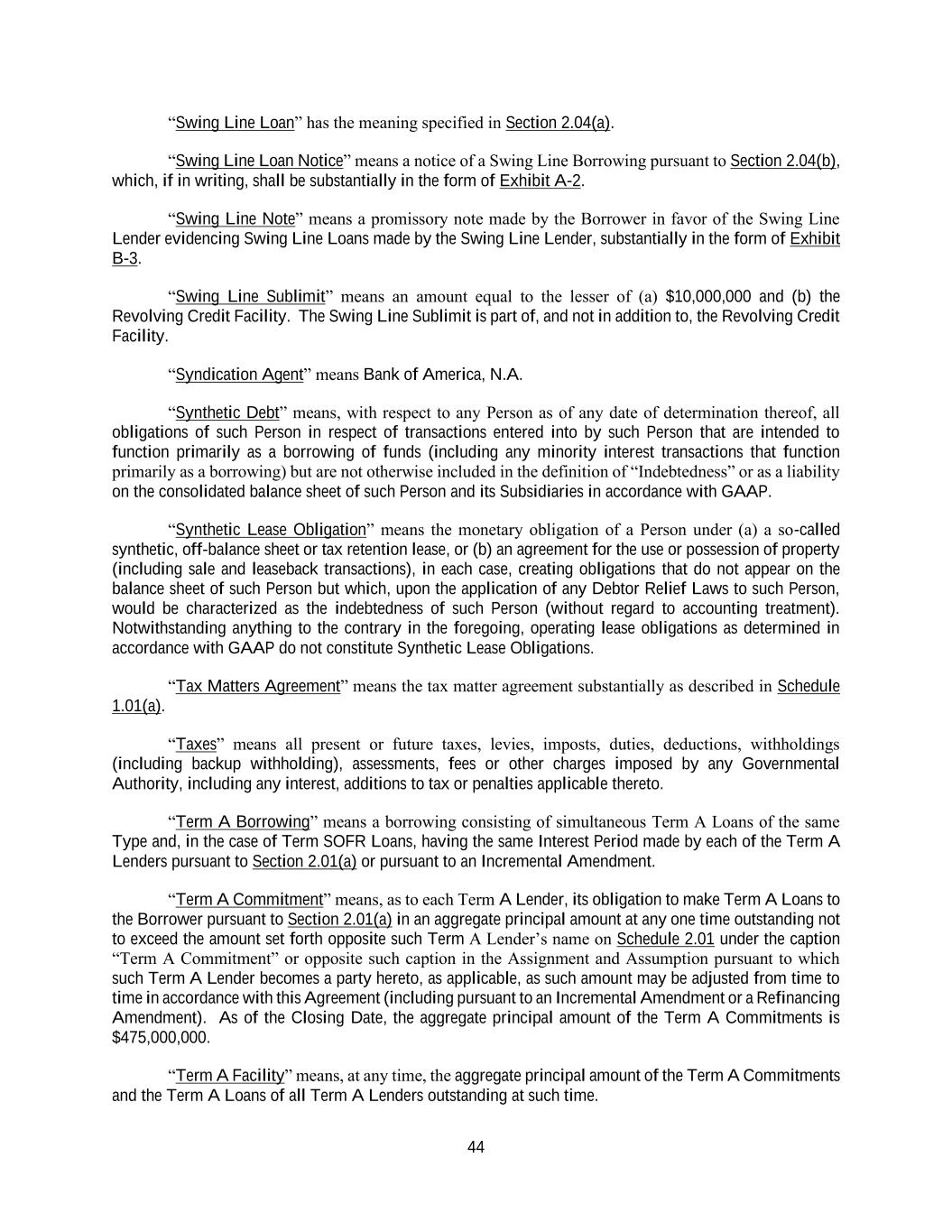 44“周转额度贷款”具有第2.04(a)节规定的含义。“Swing Line Loan Notice”是指根据第2.04(b)节进行的Swing Line借款通知,如果是书面形式,则该通知应基本上采用附件 A-2的形式。“摆动线票据”是指借款人以摆动线贷款人为受益人、证明摆动线贷款人所作摆动线贷款的本票,其主要形式为附件 B-3。“周转额度上限”是指金额等于(a)10,000,000美元和(b)循环信贷安排中的较小者。周转额度上限是循环信贷工具的一部分,而不是补充。“银团代理”是指美国银行,N.A.“合成债务”是指,就截至任何确定日期的任何人而言,该人就该人订立的交易承担的所有义务,这些交易旨在主要作为资金借款(包括主要作为借款运作的任何少数股东权益交易),但不包括在“债务”的定义中,或根据公认会计原则在该人及其子公司的综合资产负债表上作为负债。“合成租赁义务”是指(a)所谓的合成、表外或税收保留租赁,或(b)使用或占有财产的协议(包括售后回租交易)项下的人的货币义务,在每种情况下,产生的义务不出现在该人的资产负债表上,但在对该人适用任何债务人救济法时,将被定性为该人的债务(不考虑会计处理)。尽管上述情况有任何相反之处,但根据公认会计原则确定的经营租赁义务不构成合成租赁义务。「税务事项协议」指实质上如附表1.01(a)所述的税务事项协议。“税”是指任何政府当局目前或未来征收的所有税款、征税、关税、扣除、预扣(包括备用预扣)、评估、费用或其他收费,包括任何利息、增加的税款或适用的罚款。“定期A借款”是指由同一类型的同时A期贷款组成的借款,在定期SOFR贷款的情况下,每个定期A贷款人根据第2.01(a)节或根据增量修订作出的利息期限相同。“期限A承诺”是指,就贷款人的每一期限而言,其根据第2.01(a)节向借款人提供期限A贷款的义务,在任何一次未偿还的本金总额不超过附表2.01上“期限A承诺”标题下与该期限相对的贷款人名称所列的金额,或在贷款人据此成为协议一方的转让和假设(如适用)中与该期限相对的该标题所列的金额,金额可能会根据本协议(包括根据增量修订或再融资修订)不时调整。截至截止日期,A期承诺的本金总额为475,000,000美元。“A期贷款”是指在任何时候,所有未偿还的A期贷款人的A期承诺和A期贷款的本金总额。