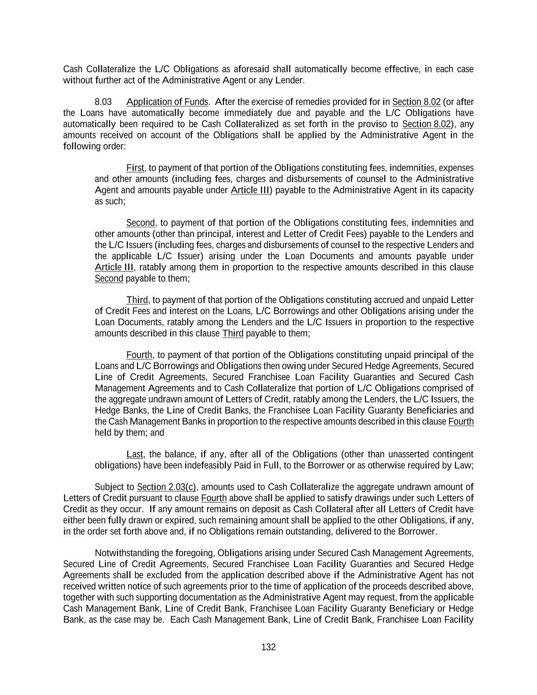 132现金抵押上述信用证义务自动生效,在每种情况下无需行政代理人或任何贷款人的进一步行为。8.03资金运用。在行使第8.02条规定的补救措施后(或在贷款自动成为立即到期应付且信用证债务已自动被要求按照第8.02条但书的规定以现金作抵押后),因债务而收到的任何款项应由行政代理人按以下顺序申请:首先,用于支付构成费用、赔偿、开支和其他金额的那部分债务(包括费用、律师向行政代理人收取的费用和付款以及根据第三条应付的款项)应以行政代理人的身份支付给行政代理人;第二,支付根据贷款文件产生的构成费用、赔偿和应付给贷款人和信用证发行人的其他款项(本金、利息和信用证费用除外)的那部分债务(包括律师向各自的贷款人和适用的信用证发行人收取的费用、收费和付款)以及根据第三条应付的款项,其中按本条款所述各自金额的比例按比例第二次应支付给他们;第三次,就支付构成应计未付信用证费用和贷款利息的那部分债务、信用证借款和贷款单证项下产生的其他债务而言,在贷款人和信用证发行人之间按本条款所述各自金额的比例按比例第三次应支付给他们;第四次,就支付构成未付贷款本金和信用证借款的那部分债务以及当时根据有担保对冲协议所欠的债务而言,有担保的信贷额度协议、有担保的特许经营商贷款融资担保和有担保的现金管理协议,并以现金抵押由信用证未提取总额组成的那部分信用证债务,在贷款人、信用证发行人、对冲银行、信贷额度银行、特许经营商贷款融资担保受益人和现金管理银行之间按其持有的本条款第四款所述各自金额的比例进行比例分配;最后,在所有债务(未主张的或有债务除外)均已不可抗辩全额偿付后的余额(如有),对借款人或法律另有规定的;除第2.03(c)节另有规定外,根据上述第4款用于以现金抵押信用证未提取总额的金额,应适用于在发生时满足该等信用证项下的提款。如在所有信用证全部提款或到期后仍有任何金额作为现金抵押品存入,则该剩余金额应按上述顺序适用于其他债务(如有),如无未偿债务,则交付给借款人。尽管有上述规定,如果行政代理人在上述收益的适用时间之前未收到有关此类协议的书面通知,以及行政代理人可能要求的相关证明文件,则在有担保现金管理协议、有担保信贷额度协议、有担保特许经营人贷款融资担保担保和有担保对冲协议项下产生的义务应被排除在上述申请之外。适用的现金管理银行、信用额度银行、特许经营人贷款融资担保受益人或对冲银行(视情况而定)。各现金管理银行、信用额度银行、加盟商贷款便利