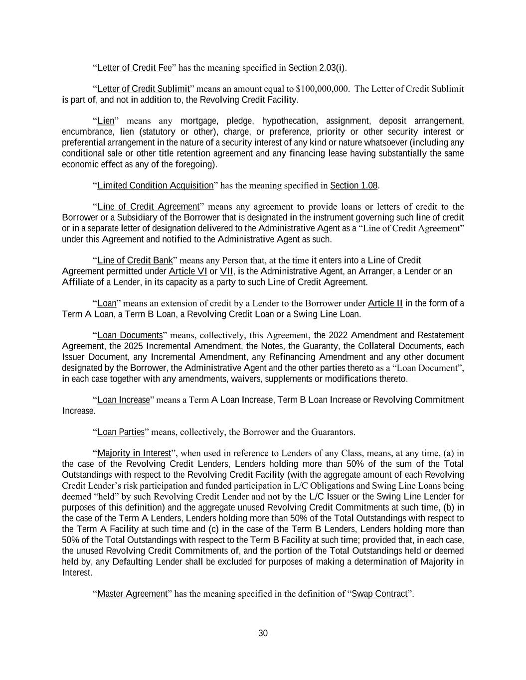 30“信用证费用”具有第2.03(i)节规定的含义。“信用证分限额”是指金额等于100,000,000美元。信用证分限额是循环信贷便利的一部分,而不是补充。“留置权”是指任何种类或性质的担保权益性质的任何抵押、质押、质押、转让、存款安排、产权负担、留置权(法定或其他)、押记或优先权、优先权或其他担保权益或优惠安排(包括任何有条件出售或其他所有权保留协议以及与上述任何一项具有基本相同经济效果的任何融资租赁)。“有限条件收购”具有第1.08条规定的含义。“信用额度协议”是指在管辖该信用额度的文书中指定的、或在根据本协议作为“信用额度协议”交付给行政代理人并作为该行政代理人通知的单独指定函中指定的向借款人或借款人的子公司提供贷款或信用证的任何协议。“信用额度银行”是指在其订立第六条或第七条允许的信用额度协议时,作为该信用额度协议一方的行政代理人、安排人、贷款人或贷款人的关联机构的任何人。“贷款”是指贷款人根据第二条以A期贷款、B期贷款、循环信用贷款或周转额度贷款的形式向借款人提供的信贷。“贷款文件”是指本协议、2022年修订和重述协议、2025年增量修订、票据、担保、抵押文件、每个发行人文件、任何增量修订、任何再融资修订以及借款人、行政代理人及其其他各方指定为“贷款文件”的任何其他文件的统称,在每种情况下连同对其的任何修订、豁免、补充或修改。“增贷”是指A期贷款增加、B期贷款增加或循环承诺增加。“贷款方”是指借款人和担保人的统称。“多数利益”,当用于指任何类别的贷款人时,是指,在任何时候,(a)在循环信贷贷款人的情况下,就循环信贷融资而言,持有超过未偿总额总和50%的贷款人(每个循环信贷贷款人的风险参与和资金参与信用证债务和周转额度贷款的总额被视为由该循环信贷贷款人“持有”,而不是为本定义的目的由信用证发行人或周转额度贷款人“持有”)和当时未使用的循环信贷承诺总额,(b)在期限A贷款人的情况下,在该时间持有超过A期融资未偿还总额50%的贷款人及(c)就B期贷款人而言,在该时间持有超过B期融资未偿还总额50%的贷款人;但在每种情况下,任何违约贷款人的未使用循环信贷承诺,以及持有或被视为持有的未偿还总额的部分,均应被排除在外,以便确定利息的多数。“主协议”具有“互换合同”定义中规定的含义。