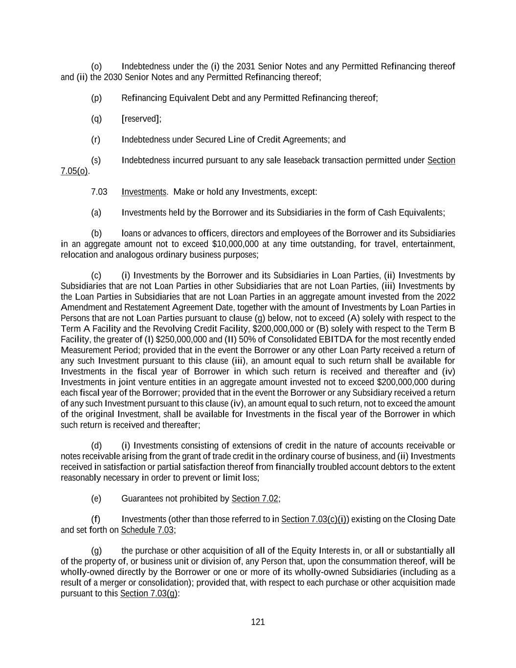 121(o)(i)2031年优先票据及其任何许可再融资和(ii)2030年优先票据及其任何许可再融资项下的债务;(p)等值债务再融资及其任何许可再融资;(q)[保留];(r)有担保信贷额度协议项下的债务;以及(s)根据第7.05(o)条允许的任何售后回租交易产生的债务。7.03投资。进行或持有任何投资,但以下情况除外:(a)借款人及其子公司以现金等价物形式持有的投资;(b)在任何时候向借款人及其子公司的高级职员、董事和雇员提供总额不超过10,000,000美元的贷款或垫款,用于旅行、娱乐、搬迁和类似的普通商业目的;(c)(i)借款人及其子公司对贷款方的投资,(ii)非贷款方的子公司对非贷款方的其他子公司的投资,(三)贷款方对非贷款方的子公司的投资总额自2022年修订和重述协议之日起投资,连同贷款方根据下文(g)条对非贷款方的人的投资金额,仅就A期贷款和循环信贷融资而言不超过(a)美元,仅就B期贷款而言不超过200,000,000美元或(b)美元,(i)250,000,000美元和(II)最近结束的计量期合并EBITDA的50%两者中的较高者;条件是,如果借款人或任何其他贷款方根据本条款(iii)收到任何此类投资的回报,应为收到此种回报的借款人的财政年度及其后的投资提供与此种回报相等的数额,以及(iv)在借款人的每个财政年度内投资总额不超过200,000,000美元的对合资实体的投资;条件是,如果借款人或任何子公司根据本条款(iv)收到任何此类投资的回报,则与此种回报相等的数额不超过原始投资的数额,应可用于在收到此种回报的借款人的财政年度及其后进行的投资;(d)(i)包括在正常经营过程中因授予贸易信贷而产生的应收账款或应收票据性质的信贷展期的投资,(ii)为防止或限制损失而在合理必要范围内从财务问题账户债务人收到的抵偿或部分抵偿的投资;(e)第7.02条不加禁止的担保;(f)在截止日期存在并列于附表7.03的投资(第7.03(c)(i)条所指的投资除外;(g)购买或以其他方式取得任何人的全部股权、或其全部或实质上全部财产、或业务单位或分部的权益,而在该等权益完成后,将由借款人或其一个或多个全资子公司直接全资拥有(包括合并或合并的结果);但就根据本条第7.03(g)款进行的每项购买或其他收购而言: