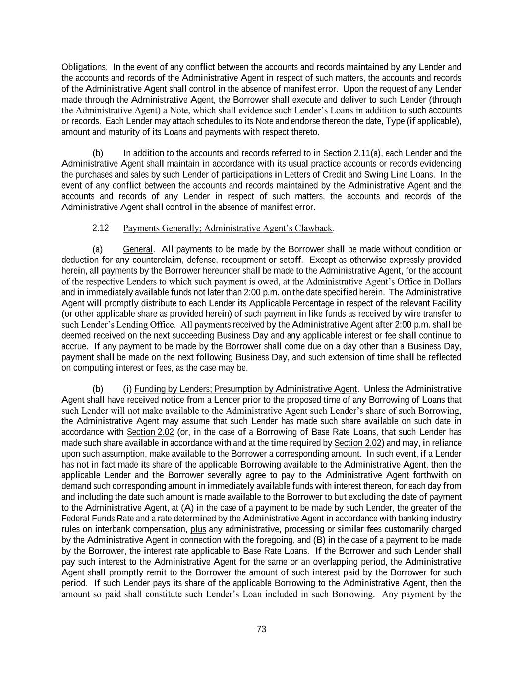 73项义务。任何贷款人所保持的帐目和记录与行政代理人就该事项所作的帐目和记录发生冲突时,行政代理人的帐目和记录应当在没有明显错误的情况下加以控制。应任何贷款人通过行政代理人提出的要求,借款人应签署并(通过行政代理人)向该贷款人交付一份票据,该票据除应证明该等账户或记录外,还应证明该贷款人的贷款。各贷款人可在其票据上附上附表,并在附表上注明其贷款的日期、类型(如适用)、金额和期限以及与之相关的付款。(b)除第2.11(a)节所指的帐目和记录外,每一贷款人和行政代理人还应按照其通常做法保存证明该贷款人参与信用证和周转额度贷款的购买和销售的帐目或记录。行政代理人保存的账户和记录与任何贷款人的账户和记录就该事项发生冲突时,行政代理人的账户和记录应在没有明显错误的情况下加以控制。2.12一般付款;行政代理的回拨。(a)一般。借款人应支付的所有款项,应无条件或扣除任何反诉、抗辩、补偿或抵销。除本协议另有明文规定外,借款人根据本协议支付的所有款项应在本协议规定的日期下午2:00之前在行政代理人办公室以美元和立即可用的资金支付给行政代理人,由欠该款项的相应贷款人承担。行政代理人将及时向每个贷款人分发其在相关融资(或此处规定的其他适用份额)方面的适用百分比,以电汇方式收到的类似资金支付给该贷款人的贷款办公室。行政代理人在下午2:00后收到的所有款项应视为在下一个营业日收到,任何适用的利息或费用应继续累积。如借款人须于营业日以外的某一日到期缴付款项,则须于翌日营业日缴付款项,而延长的时间须在计算利息或费用(视属何情况而定)上反映。(b)(i)贷款人提供资金;行政代理人推定。除非行政代理人在任何借款的拟议时间之前已收到贷款人的通知,表示该贷款人将不会向该行政代理人提供该贷款人在该借款中的份额,否则该行政代理人可假定该贷款人已根据第2.02条在该日期提供该份额(或在借入基本利率贷款的情况下,该贷款人已根据第2.02条并在第2.02条要求的时间提供该份额),并可依据该假设,向借款人提供相应的金额。在这种情况下,如果贷款人实际上没有向行政代理人提供其在适用借款中所占份额,则适用的贷款人和借款人分别同意应要求立即向行政代理人支付相应数额的即时可用资金及其利息,自借款人获得该数额之日起至但不包括向行政代理人付款之日止的每一天,如该贷款人将支付款项,则在(a),联邦基金利率和行政代理人根据银行业同业代偿规则确定的利率中的较大者,加上行政代理人就上述事项惯常收取的任何行政、处理或类似费用,以及(b)在借款人将支付款项的情况下,适用于基准利率贷款的利率。借款人与该贷款人应向行政代理人支付同一期间或重迭期间利息的,行政代理人应及时将借款人已支付该期间利息的金额汇给借款人。如果该贷款人将其在适用借款中的份额支付给行政代理人,则如此支付的金额应构成该借款中包含的该贷款人的贷款。任何付款由