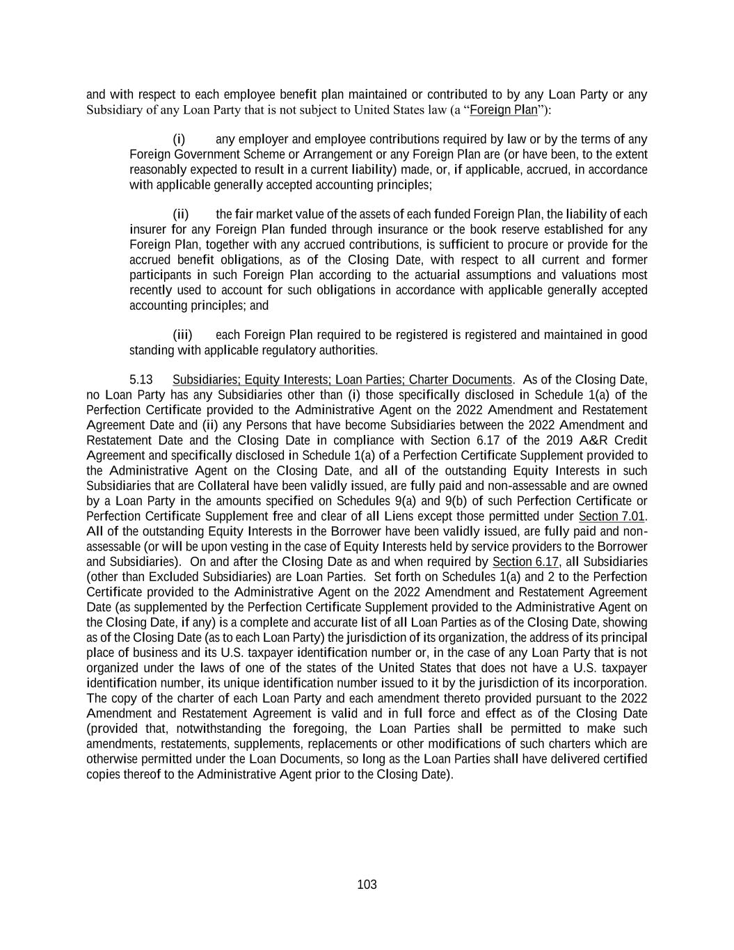103就不受美国法律约束的任何贷款方或任何贷款方的任何子公司维持或供款的每个雇员福利计划(“外国计划”)而言:(i)法律或任何外国政府计划或安排或任何外国计划的条款要求的任何雇主和雇员供款正在(或已经在合理预期会导致流动负债的范围内)作出,或在适用的情况下应计,根据适用的公认会计原则;(ii)每个出资的外国计划的资产的公允市场价值、每个保险人对通过保险出资的任何外国计划的负债或为任何外国计划建立的账面准备金,连同任何应计缴款,足以在截止日期获得或提供应计福利义务,关于此类外国计划的所有现任和前任参与者,根据最近用于根据适用的公认会计原则核算此类债务的精算假设和估值;(iii)要求注册的每个外国计划都在适用的监管机构注册并保持良好的信誉。5.13子公司;股权;贷款方;章程文件。截至截止日,除(i)于2022年修订及重述协议日期向行政代理人提供的完善证书附表1(a)具体披露的附属公司及(ii)于2022年修订及重述日期至截止日期间根据2019年A & R信贷协议第6.17条成为附属公司并于截止日向行政代理人提供的完善证书补充文件附表1(a)具体披露的任何人士外,任何贷款方均无任何附属公司,及该等附属公司的所有未偿还股权,如属抵押品,均已有效发行、已全数支付且不可评估,并由贷款方按该等完美证书或完美证书补充的附表9(a)及9(b)所指明的金额拥有,除第7.01条所容许的情况外,并无任何留置权。借款人的所有未偿股权均已有效发行、已全额支付且不可评估(或将在服务提供商持有的股权归属借款人和子公司时)。在第6.17条要求的截止日期当日及之后,所有子公司(不包括被排除在外的子公司)均为贷款方。载于附表1(a)及2的2022年修订及重述协议日期提供予行政代理人的完善证书(如有的话,由截止日提供予行政代理人的完善证书补充)是截至截止日的所有贷款方的完整及准确名单,显示截至截止日(就每一贷款方而言)其组织的管辖权、其主要营业地点的地址及其美国纳税人识别号码,或,对于任何不是根据美国其中一个州的法律组织的贷款方没有美国纳税人识别号的情况,其唯一识别号由其注册成立的司法管辖区颁发给它。根据2022年修订和重述协议提供的每一贷款方的章程副本及其每一项修订自截止日期起有效并具有完全的效力和效力(但尽管有上述规定,应允许贷款方对该等章程作出贷款文件另有许可的此类修订、重述、补充、替换或其他修改,只要贷款方在截止日期之前已将经核证的章程副本交付给行政代理人)。