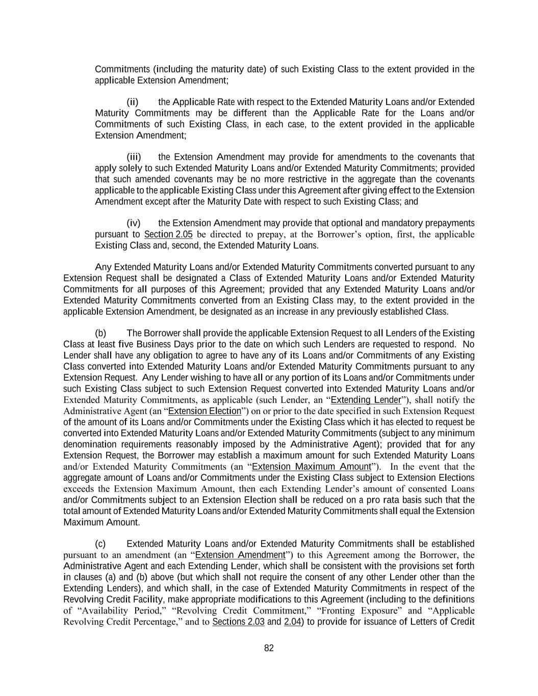 82此类现有类别的承诺(包括到期日)在适用的延期修订规定的范围内;(ii)有关延期到期贷款和/或延期到期承诺的适用利率可能不同于此类现有类别的贷款和/或承诺的适用利率,在每种情况下,在适用的延期修订规定的范围内;(iii)延期修订可规定对仅适用于此类延期到期贷款和/或延期到期承诺的契诺进行修订;但此类经修订的契诺在总量上可能不会比在实施延期修订后适用于本协议项下适用的现有类别的契诺更具限制性,但在与此类现有类别相关的到期日之后除外;(iv)延期修订可规定,根据第2.05节的选择性和强制性预付款可直接用于提前还款,由借款人选择,第一,适用的现有类别,第二,延长期限贷款。根据任何延期请求转换的任何延长到期贷款和/或延长到期承诺应被指定为本协议所有目的的一类延长到期贷款和/或延长到期承诺;但从现有类别转换的任何延长到期贷款和/或延长到期承诺可在适用的延期修正案规定的范围内被指定为任何先前建立的类别的增加。(b)借款人应在要求现有类别的所有贷款人作出答复的日期前至少五个工作日向其提供适用的延期请求。任何贷款人都没有义务同意根据任何延期请求将其任何贷款和/或任何现有类别的承诺转换为延长到期贷款和/或延长到期承诺。任何贷款人希望根据此类延期请求将其在此类现有类别下的全部或任何部分贷款和/或承诺转换为延期到期贷款和/或延期到期承诺(如适用)(此类贷款人,“延期贷款人”),应在该延期请求中指定的日期或之前通知行政代理人(“延期选择”)其选择请求将其在现有类别下的贷款和/或承诺转换为延期到期贷款和/或延期到期承诺的金额(以行政代理人合理施加的任何最低面额要求为准);但对于任何延期请求,借款人可以为此类延期到期贷款和/或延期到期承诺确定最高金额(“延期最高金额”)。如果现有类别下须经延期选择的贷款和/或承诺总额超过延期最高金额,则每个延期贷款人的同意贷款和/或须经延期选择的承诺的金额应按比例减少,以便延期到期贷款和/或延期到期承诺的总额应等于延期最高金额。(c)延长到期贷款和/或延长到期承诺应根据借款人、行政代理人和每个延长贷款人之间对本协议的修订(“延长修订”)成立,该修订应与上述(a)和(b)条规定一致(但不应要求除延长贷款人之外的任何其他贷款人的同意),并且在就循环信贷融资作出延长到期承诺的情况下,应对本协议作出适当修改(包括对“可用期”、“循环信贷承诺”的定义,“Fronting Exposure”和“Applicable Revolving Credit Percentage”,以及第2.03和2.04条)规定签发信用证