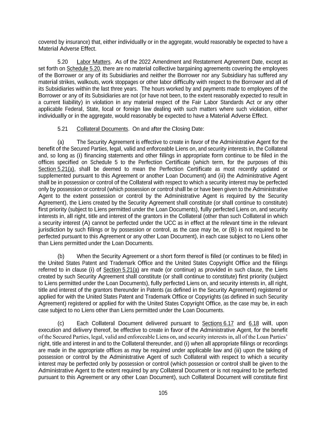 保险覆盖的105个),无论是单独或合计,都可以合理地预期会产生重大不利影响。5.20劳工事项。截至2022年修订及重述协议日期,除附表5.20所列情况外,并无涉及借款人或其任何附属公司的雇员的重大集体谈判协议,且借款人或任何附属公司均未在最近三年内就借款人及其所有附属公司遭受任何实质性罢工、罢工、停工或其他劳动困难。在《公平劳动标准法》或处理此类事项的任何其他适用的联邦、州、地方或外国法律的任何重大方面,借款人或其任何子公司的雇员的工作时间和向其支付的款项没有(或在合理预期会导致当前负债的范围内没有)违反,而在合理预期这种违反行为单独或总体上会产生重大不利影响的情况下。5.21附担保单证。在截止日期当日及之后:(a)担保协议有效地为有担保当事人的利益为行政代理人设定担保物上的合法、有效和可执行的留置权和担保权益,只要(i)融资报表和其他适当形式的备案继续在完美证书附表5规定的办事处提交(就本条第5.21(a)款而言,该期限,应视为指根据本协议或其他贷款文件最近更新或补充的完善证书)和(ii)行政代理人应占有或控制只能通过占有或控制才能完善担保权益的担保物(该占有或控制在担保协议要求的行政代理人占有或控制的范围内应是或已经给予行政代理人),担保协议设定的留置权应构成(或应继续构成)第一优先权(受贷款文件允许的留置权限制)、设保人在担保物上的所有权利、所有权和权益(根据相关司法管辖区相关时间有效的《UCC》规定的担保权益(A)无法通过此类备案或通过占有或控制(视情况而定)予以完善的担保物除外,或(b)无需根据本协议或任何其他贷款文件完善),在每种情况下,除贷款文件允许的留置权外,没有任何留置权。(b)当担保协议或其简式在美国专利商标局和美国版权局提交(或继续提交)且第5.21(a)节第(i)款提及的提交按该条款的规定作出(或继续)时,该担保协议设定的留置权应构成(或应继续构成)第一优先权(受贷款文件允许的留置权的限制)、完全完善的留置权和担保权益,所有权利,设保人在其项下对在美国专利商标局注册或申请的专利(如担保协议中所定义)的所有权和权益或在美国版权局(视情况而定)注册或申请的版权(如该担保协议中所定义)的所有权和权益,在每种情况下,除贷款文件允许的留置权外,不受任何留置权的约束。(c)根据第6.17和6.18节交付的每份担保品单证,在执行和交付时,将有效地为有担保当事人的利益为行政代理人设定贷款当事人在该担保品项下的所有权利、所有权和权益上的合法、有效和可强制执行的留置权和担保权益,(i)当所有适当的备案或记录均在适用法律可能要求的适当办事处作出时及(ii)在行政代理人取得该担保物的占有或控制时(该占有或控制应在任何担保文件要求的范围内给予该行政代理人,或根据本协议或任何其他贷款文件无需完善),该担保物文件将构成第一