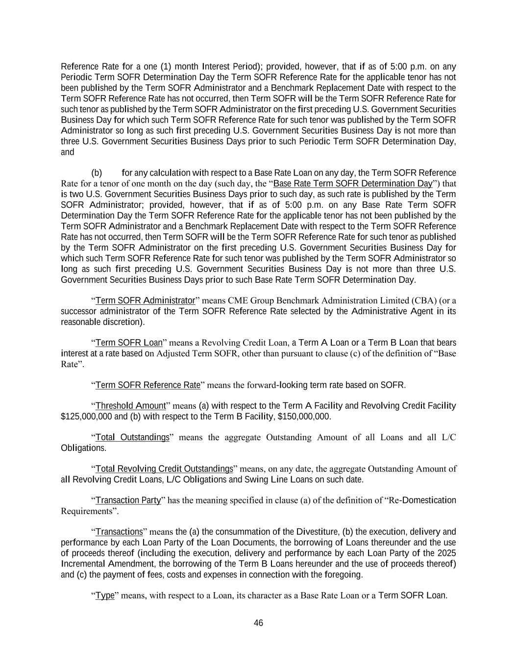 46一(1)个月计息期的参考利率);但条件是,如果截至任何定期期限SOFR确定日下午5:00,适用期限的期限SOFR参考利率尚未由期限SOFR管理人公布,且期限SOFR参考利率的基准替换日期尚未发生,则任期SOFR将是任期SOFR管理人在前一个美国政府证券营业日公布的期限SOFR参考利率,而该期限SOFR管理人已公布该期限的任期SOFR参考利率,只要前一个美国政府证券营业日不超过该定期期限SOFR确定日前三个美国政府证券营业日,以及(b)就任何一天的基准利率贷款进行的任何计算,一个月期限的期限SOFR参考利率在该日(该日,“基准利率期限SOFR确定日”)为该日前两个美国政府证券营业日,因为该利率由期限SOFR管理人公布;但前提是,如果截至任何基准利率期限SOFR确定日下午5:00,期限SOFR管理人尚未公布适用期限SOFR参考利率,且期限SOFR参考利率的基准更换日期尚未发生,则期限SOFR将是期限SOFR管理人在前一个美国政府证券营业日公布的期限SOFR参考利率,该期限SOFR参考利率由期限SOFR管理人公布,只要前一个美国政府证券营业日的第一个期限SOFR参考利率不超过该基准利率期限SOFR确定日前三个美国政府证券营业日。“任期SOFR管理人”是指芝加哥商品交易所 BenchMark Administration Limited(CBA)(或由行政代理人合理酌情选择的任期SOFR参考利率的继任管理人)。“定期SOFR贷款”是指循环信用贷款、A期贷款或B期贷款,其利率基于调整后的定期SOFR,但根据“基准利率”定义的(c)条除外。“期限SOFR参考利率”是指基于SOFR的前瞻性期限利率。“门槛金额”是指(a)A期融资和循环信贷融资125,000,000美元和(b)B期融资150,000,000美元。“未偿总额”是指所有贷款和所有信用证债务的未偿总额。“循环信贷未偿总额”是指,在任何日期,所有循环信贷贷款、信用证债务和周转额度贷款在该日期的未偿总额。“交易方”具有“重新归化要求”定义(a)条规定的含义。“交易”是指(a)剥离的完成,(b)每一贷款方执行、交付和履行贷款文件,借入其项下的贷款及其收益的使用(包括每一贷款方执行、交付和履行2025年增量修正案,借入本协议项下的B期贷款及其收益的使用)和(c)支付与上述有关的费用、成本和开支。“类”是指,就贷款而言,其作为基准利率贷款或定期SOFR贷款的性质。