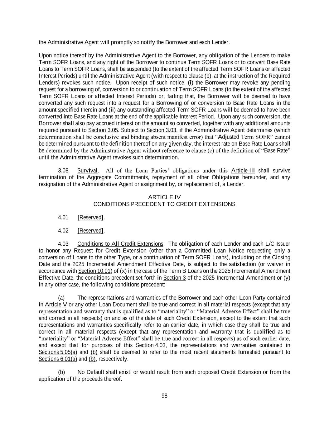 98行政代理人将及时如此通知借款人和各出借人。经行政代理人向借款人发出通知,贷款人作出定期SOFR贷款的任何义务,以及借款人继续进行定期SOFR贷款或将基准利率贷款转换为定期SOFR贷款的任何权利,应予中止(以受影响的定期SOFR贷款或受影响的利息期为限),直至行政代理人(就(b)款而言,应要求贷款人的指示)撤销该通知。收到该通知后,(i)借款人可撤销任何未决的定期SOFR贷款借款、转换为或延续的请求(以受影响的定期SOFR贷款或受影响的利息期为限),否则,借款人将被视为已将任何此类请求转换为借款请求或转换为其中规定金额的基本利率贷款,以及(ii)任何未偿还的受影响定期SOFR贷款将被视为在适用的利息期结束时已转换为基本利率贷款。一旦进行任何此类转换,借款人还应支付如此转换的金额的应计利息,以及根据第3.05节要求的任何额外金额。在不违反第3.03节的情况下,如果行政代理人确定(该确定应是决定性的且具有约束力且无明显错误)在任何一天无法根据其定义确定“调整后期限SOFR”,则基准利率贷款的利率应由行政代理人在不参考“基准利率”定义(c)款的情况下确定,直至行政代理人撤销该确定。3.08存活率。贷款方在本条第三款下的所有义务,在合计承诺终止、偿还本协议项下的所有其他义务以及行政代理人的任何辞职或由贷款人转让或更换后,均继续有效。第四条信贷展期的先决条件4.01 [保留]。4.02 [保留]。4.03所有信贷展期的条件。每个贷款人和每个信用证发行人履行任何信贷延期请求(承诺贷款通知仅要求将贷款转换为其他类型,或继续定期SOFR贷款除外)的义务,包括在截止日期和2025年增量修正生效日期,取决于(x)的(x)项在2025年增量修正生效日期的B期贷款的满足(或根据第10.01条放弃),2025年增量修正第3节规定的先决条件或(y)在任何其他情况下,以下先决条件:(a)第五条或任何其他贷款文件中所载的借款人和相互贷款方的陈述和保证在所有重大方面均应真实和正确(但任何符合“重要性”或“重大不利影响”的陈述和保证在所有方面均应真实和正确),自该信贷延期之日起,除非该等申述及保证特指较早的日期,否则在该情况下,截至该较早日期,该等申述及保证在所有重要方面均属真实及正确(但任何限定为“重要性”或“重大不利影响”的申述及保证在所有方面均属真实及正确除外),而就本条而言,第5.05(a)及(b)条所载的申述及保证,须当作分别指根据第6.01(a)及(b)条提供的最近的申述。(b)不得存在违约,或将因此类提议的信贷延期或其收益的应用而导致违约。