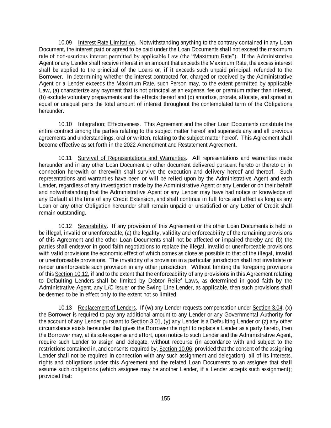 15510.09利率限制。尽管任何贷款文件中有任何相反的规定,根据贷款文件已支付或同意支付的利息不得超过适用法律允许的非高利贷利息的最高利率(“最高利率”)。行政代理人或者任何贷款人收取的利息超过最高利率的,超过的利息应当计入贷款本金,或者超过未付本金的,退还给借款人。在确定行政代理人或贷款人所约定、收取或收取的利息是否超过最高利率时,该人可在适用法律允许的范围内,(a)将任何非本金的付款定性为费用、费用或溢价而不是利息,(b)排除自愿预付款及其影响,以及(c)在本协议项下义务的整个预期期限内摊销、按比例分配、分配和分摊利息总额。10.10整合;有效性。本协议及其他借款文件构成双方就本协议标的事项订立的全部合同,并取代此前就本协议标的事项订立的任何和所有口头或书面协议和谅解。本协议按《2022年修正和重述协议》的规定生效。10.11申述和保证的存续。根据本协议和在任何其他贷款文件或依据本协议或其交付的其他文件或与本协议或其相关的其他文件中作出的所有陈述和保证,均应在本协议及其签署和交付后继续有效。行政代理人和每个贷款人已经或将依赖此类陈述和保证,而不论行政代理人或任何贷款人或代表他们进行的任何调查,尽管行政代理人或任何贷款人在任何信贷延期时可能已有任何违约的通知或知情,只要本协议项下的任何贷款或任何其他义务仍未支付或未得到履行或任何信用证仍未清偿,则该等陈述和保证应继续完全有效。10.12可分割性。如本协议或其他借款单证的任何条款被认定为非法、无效或不可执行,(a)本协议其余条款和其他借款单证的合法性、有效性和可执行性不因此而受到影响或损害;(b)各方应努力进行善意协商,以其经济效果尽可能接近于非法、无效或不可执行条款的有效条款取代非法、无效或不可执行条款。某一规定在某一特定法域无效,不得使该规定在任何其他法域无效或使其无法执行。在不限制本条第10.12款前述规定的情况下,如果本协议中有关违约贷款人的任何条款的可执行性受到行政代理人、任何信用证发行人或周转额度贷款人(如适用)善意确定的债务人救济法律的限制,则该等条款应被视为仅在不受此限制的范围内有效。10.13更换贷款人。如(w)任何贷款人根据第3.04条要求赔偿,(x)借款人须根据第3.01条为任何贷款人的帐户向任何贷款人或任何政府当局支付任何额外款项,(y)任何贷款人是违约贷款人,或(z)根据本协议存在任何其他情况,使借款人有权取代贷款人成为本协议的一方,则借款人可在向该贷款人和行政代理人发出通知后,自费并尽力要求该贷款人转让和转授,无追索权(根据并受制于第10.06节所载的限制和所要求的同意;条件是任何此类转让和转授不需要转让贷款人的同意),其在本协议和相关贷款文件下对应承担此类义务的受让人(如果贷款人接受此类转让,则该受让人可能是另一贷款人)的所有利益、权利和义务;但前提是:
