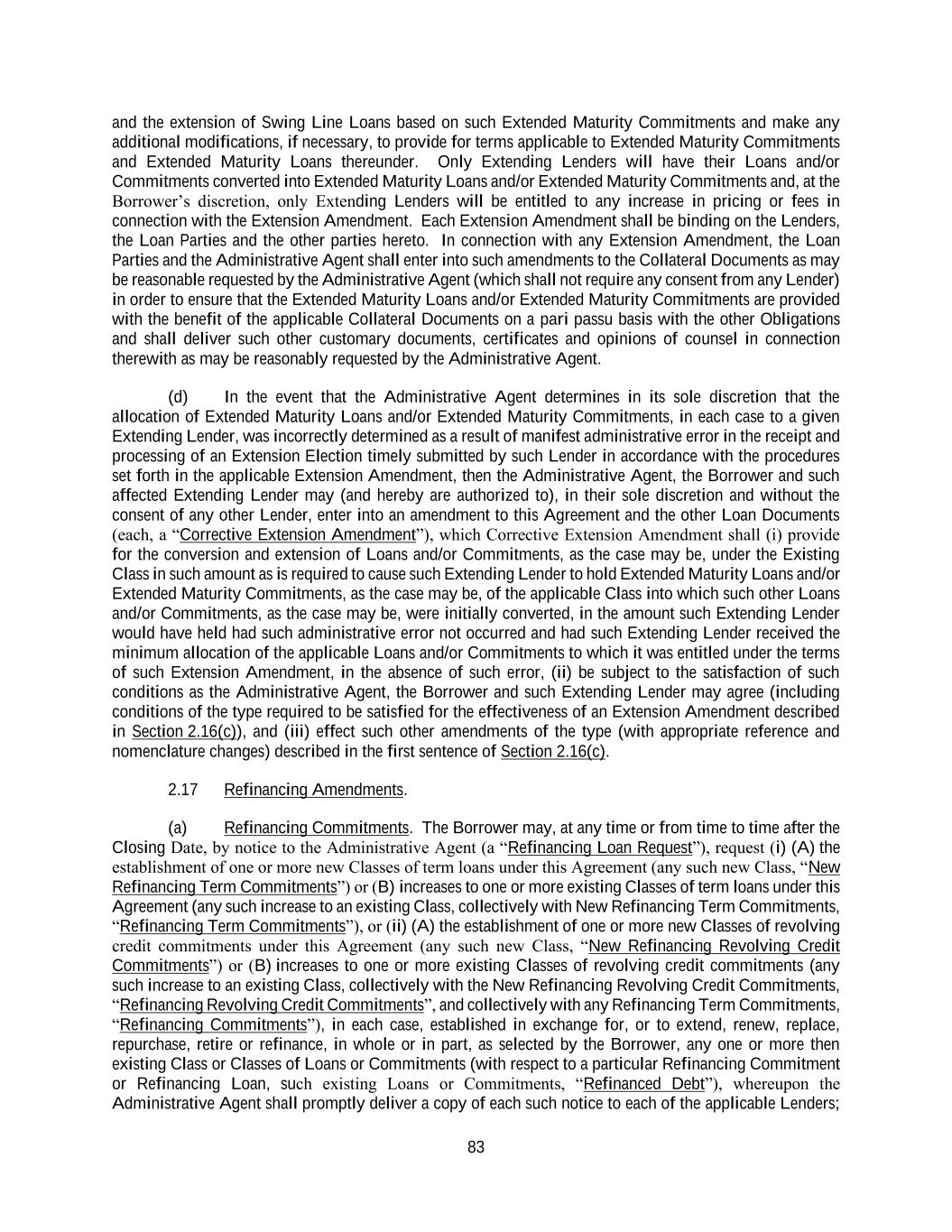 83和根据此类延长到期承诺延长周转额度贷款,并在必要时作出任何额外修改,以规定适用于延长到期承诺和根据其延长到期贷款的条款。只有展期贷款人才会将其贷款和/或承诺转换为展期到期贷款和/或展期到期承诺,并且根据借款人的酌情权,只有展期贷款人才有权获得与展期修订有关的任何定价或费用增加。每项延期修正案对贷款人、贷款方和其他各方均具有约束力。就任何延期修订而言,贷款方和行政代理人应订立行政代理人可能合理要求的对抵押文件的修订(该修订不应要求任何贷款人的任何同意),以确保延长到期贷款和/或延长到期承诺是在与其他义务同等基础上受益于适用的抵押文件的情况下提供的,并应交付行政代理人可能合理要求的与此有关的其他习惯文件、证书和大律师意见。(d)如果行政代理人全权酌情确定,由于在接收和处理由该贷款人按照适用的延期修正案规定的程序及时提交的延期选择时出现明显的行政错误,导致向某一特定延期贷款人分配的延期到期贷款和/或延期到期承诺被错误地确定,则行政代理人、借款人和该受影响的延期贷款人可(并特此获授权)全权酌情且未经任何其他贷款人同意,订立对本协议和其他贷款文件的修订(每份,“纠正性延期修订”),纠正性延期修订应(i)就现有类别下的贷款和/或承诺(视情况而定)的转换和延期作出规定,其所需金额应使该延长贷款人持有该等其他贷款和/或承诺(视情况而定)最初转换为的适用类别的延长到期贷款和/或延长到期承诺(视情况而定),如果没有发生此类行政错误,并且如果此类延长贷款人收到了其根据此类延长修订条款有权获得的适用贷款和/或承诺的最低分配,则在没有此类错误的情况下,(ii)须满足行政代理人、借款人和此类延长贷款人可能同意的条件(包括为第2.16(c)节所述的延长修订的有效性而需要满足的类型的条件),(iii)实施第2.16(c)节第一句所述类型的其他修订(适当的引用和命名更改)。2.17再融资修正案。(a)再融资承诺。借款人可在截止日期后的任何时间或不时藉向行政代理人发出的通知(“再融资贷款请求”),要求(i)(a)根据本协议设立一个或多个新类别的定期贷款(任何该等新类别,“新的再融资期限承诺”)或(b)根据本协议增加至一个或多个现有类别的定期贷款(任何该等增加至现有类别,与新的再融资期限承诺合称“再融资期限承诺”),或(ii)(a)根据本协议建立一个或多个新类别的循环信贷承诺(任何此类新类别,“新的再融资循环信贷承诺”)或(b)增加到一个或多个现有类别的循环信贷承诺(任何此类增加到现有类别,与新的再融资循环信贷承诺统称为“再融资循环信贷承诺”,与任何再融资期限承诺统称为“再融资承诺”),在每种情况下,为交换或延长、更新、替换、回购、退休或再融资而设立,全部或部分由借款人选择,任何一项或多项当时已存在的一类或多类贷款或承诺(就特定的再融资承诺或再融资贷款而言,该等现有贷款或承诺,“再融资债务”),据此,行政代理人应迅速将每份此类通知的副本交付给每个适用的贷款人;