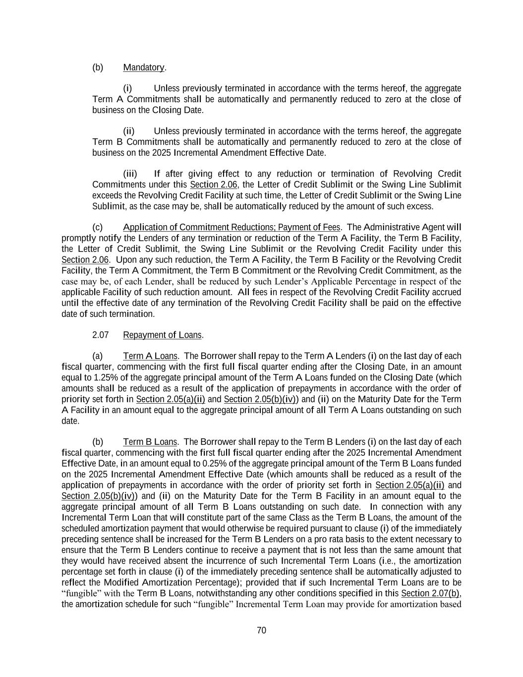 70(b)强制性。(i)除非先前根据本协议的条款终止,否则A期承诺总额应在截止日期营业结束时自动永久减少为零。(ii)除非先前根据本协议的条款终止,否则在2025年增量修订生效日期营业结束时,B期承诺总额将自动永久减少为零。(iii)如在根据本条第2.06条作出的任何减少或终止循环信贷承诺生效后,信用证分限额或周转额度分限额超过该时间的循环信贷融资,则信用证分限额或周转额度分限额(视属何情况而定)须自动减少该超额的金额。(c)适用承诺减免;支付费用。行政代理人将根据本条第2.06款对A期融资、B期融资、信用证分限额、周转额度分限额或循环信贷融资的任何终止或减少及时通知贷款人。在任何该等减少后,各贷款人的A期融资、B期融资或循环信贷融资、A期承诺、B期承诺或循环信贷承诺(视属何情况而定)须按该贷款人就该等减少金额的适用融资的适用百分比减少。截至循环信贷融资的任何终止生效日期应计提的与循环信贷融资有关的所有费用应在该终止生效日期支付。2.07偿还贷款。(a)A期贷款。借款人应在每个财政季度的最后一天,从截止日期后结束的第一个完整财政季度开始,向A期贷款人(i)还款,金额相当于截止日(根据第2.05(a)(ii)节和第2.05(b)(iv)节规定的优先顺序应用预付款)提供资金的A期贷款本金总额的1.25%)和(ii)在到期日为A期融资提供资金的金额相当于在该日期未偿还的所有A期贷款本金总额。(b)B期贷款。借款人应在每个财政季度的最后一天,从2025年增量修正生效日期后结束的第一个完整财政季度开始,向B期贷款人(i)还款,金额相当于在2025年增量修正生效日期(根据第2.05(a)(ii)节和第2.05(b)(iv)节规定的优先顺序应用预付款)提供资金的B期贷款本金总额的0.25%,金额相当于在该日期未偿还的所有B期贷款的本金总额。就将构成与B期贷款相同类别的任何增量定期贷款而言,根据紧接前一句第(i)款原本需要的预定摊销付款的金额,应在必要的范围内按比例为B期贷款人增加,以确保B期贷款人继续收到的付款不低于他们在没有发生此种增量定期贷款的情况下本应收到的相同金额(即,前句第(i)款规定的摊销百分比应自动调整以反映修改后的摊销百分比);但如果此类增量定期贷款要与B期贷款“可替代”,尽管有本条第2.07(b)款规定的任何其他条件,此类“可替代”增量定期贷款的摊销时间表可规定基于