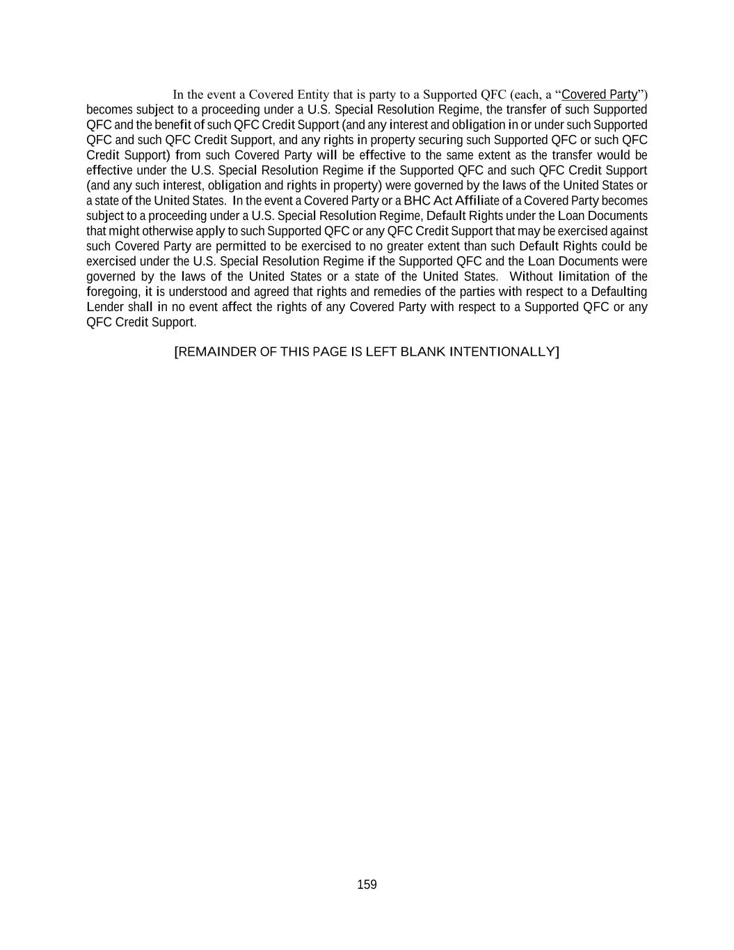 159如果作为受支持的QFC的一方的涵盖实体(各自称为“被覆盖方”)成为美国特别决议制度下的程序的主体,则此类受支持的QFC的转让和此类QFC信用支持的利益(以及此类受支持的QFC和此类QFC信用支持中或其下的任何利益和义务,以及从此类被覆盖方获得此类受支持的QFC或此类QFC信用支持)的财产上的任何权利将具有同等程度的效力,如果受支持的QFC和此类QFC信用支持(以及任何此类财产上的利益、义务和权利)受美国或美国某州的法律管辖,则根据美国特别决议制度,转让将具有同等程度的效力。如果覆盖方或覆盖方的BHC法案关联公司受到美国特别决议制度下的程序的约束,则允许行使贷款文件下可能适用于该等受支持的QFC或可能对该覆盖方行使的任何QFC信用支持的违约权,其程度不超过如果受支持的QFC和贷款文件受美国法律或美国某州法律管辖,则该等违约权在美国特别决议制度下可以行使的程度。在不受前述限制的情况下,理解并同意,当事人对违约贷款人的权利和补救措施在任何情况下均不影响任何覆盖方对所支持的QFC或任何QFC信用支持的权利。【本页剩余部分故意留空】