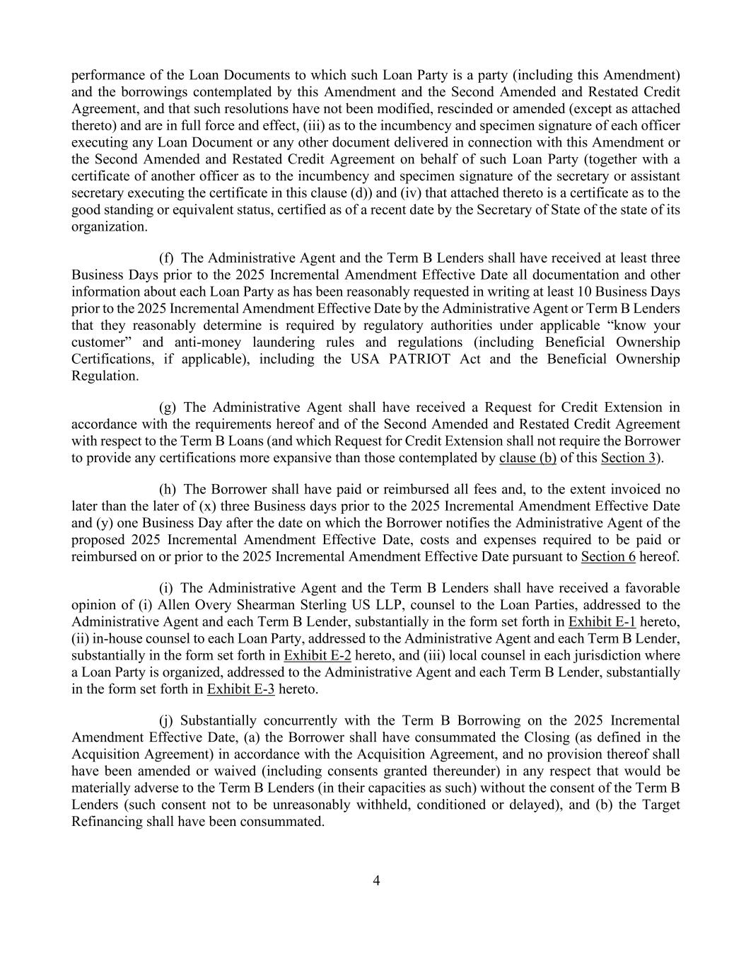 4履行该等贷款方为一方的贷款文件(包括本修订)及本修订及第二份经修订及重述的信贷协议所拟进行的借款,且该等决议并无被修改、撤销或修订(其所附的情况除外),并具有充分的效力及效力,(iii)关于代表该贷款方执行任何贷款文件或就本修订或第二份经修订及重述的信贷协议而交付的任何其他文件的每名高级人员的在职情况及样本签署(连同另一名高级人员关于执行本条(d)项中的证书的秘书或助理秘书的在职情况及样本签署)及(iv)所附的有关良好信誉或同等地位的证明,由其组织所在州的州务卿于最近日期核证。(f)行政代理人和B期贷款人应在2025年增量修正生效日期前至少三个工作日收到行政代理人或B期贷款人在2025年增量修正生效日期前至少10个工作日合理书面要求的关于每一贷款方的所有文件和其他信息,这些文件和信息是他们根据适用的“了解您的客户”和反洗钱规则和条例(包括受益所有权证明,如适用)(包括《美国爱国者法案》和《受益所有权条例》)合理确定的监管机构要求的。(g)行政代理人应已收到根据本协议和第二份经修订和重述的信贷协议的要求就B期贷款提出的信贷延期请求(而该信贷延期请求不得要求借款人提供任何比本条第3条(b)款所设想的更具扩展性的证明)。(h)借款人应已支付或偿还所有费用,并在不迟于2025年增量修正生效日期前(x)三个营业日和(y)借款人根据本条例第6条将拟议的2025年增量修正生效日期通知行政代理人之日后的一个营业日开出发票的范围内,已支付或偿还根据本条例第6条在2025年增量修正生效日期或之前需要支付或偿还的费用和开支。(i)行政代理人和B期贷款人应已收到(i)Allen Overy Shearman Sterling US LLP,即贷款方的法律顾问,对行政代理人和每个B期贷款人的有利意见,基本上采用本协议所载的格式,(ii)对每个贷款方的内部法律顾问,对行政代理人和每个B期贷款人,基本上采用本协议所载的格式,以及(iii)在组织贷款方的每个司法管辖区,对行政代理人和每个B期贷款人的当地法律顾问,基本上采用本协议中附件 E-3中所述的形式。(j)与2025年增量修订生效日期的B期借款基本同时,(a)借款人应已根据收购协议完成交割(定义见收购协议),且未经B期贷款人同意(该等同意不得被无理拒绝、附加条件或延迟),不得在任何方面对B期贷款人(以其身份)构成重大不利的任何条款进行修订或放弃(包括根据该协议授予的同意),以及(b)目标再融资应已完成。
