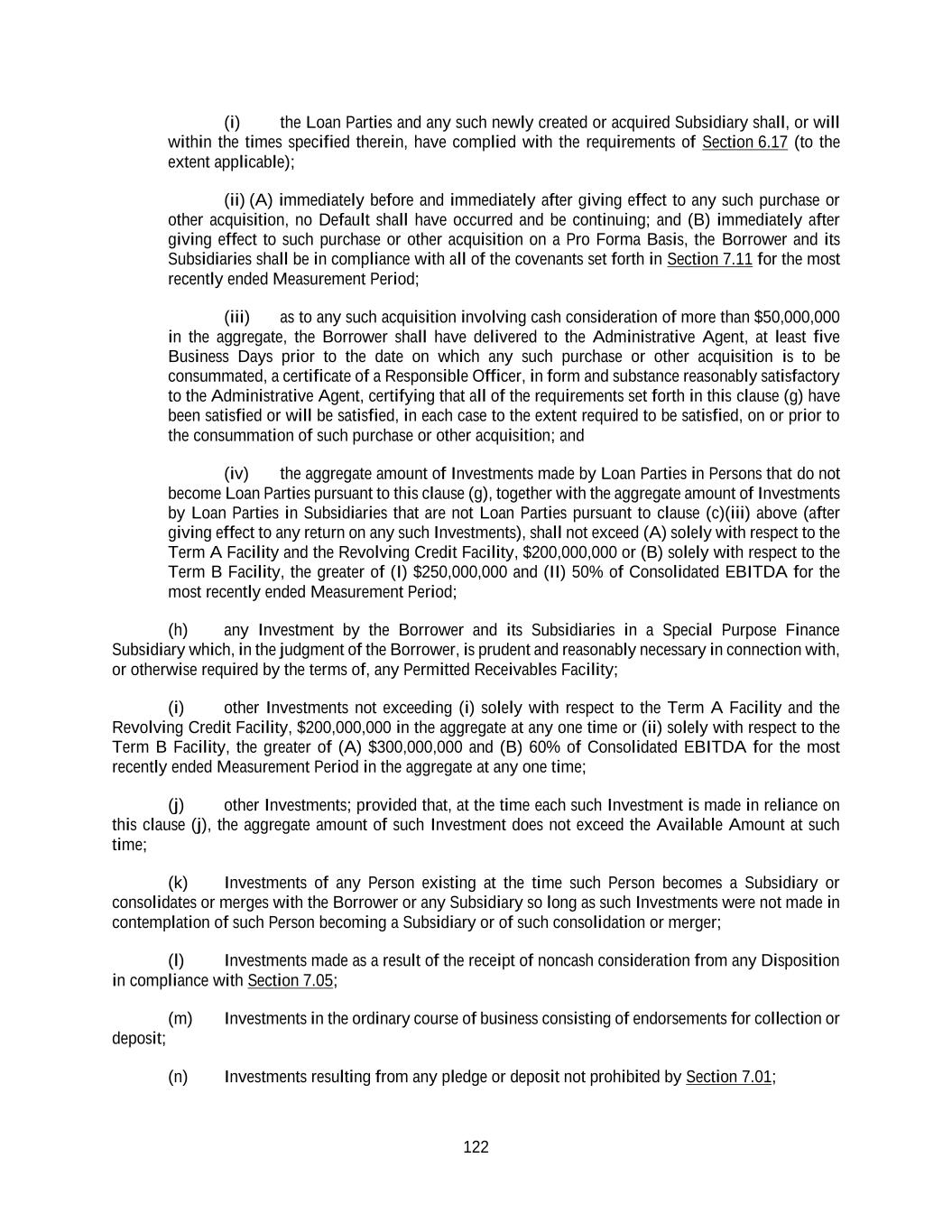 122(i)贷款方和任何此类新设立或收购的子公司应或将在其中规定的时间内(在适用的范围内)遵守第6.17条的要求;(ii)(a)在紧接任何此类购买或其他收购生效之前和之后,不得发生违约,且仍在继续;(b)在紧接此类购买或其他形式上的收购生效后,借款人及其附属公司在最近结束的计量期内,须遵守第7.11条所列的所有契诺;(iii)就涉及现金代价总额超过50,000,000美元的任何该等收购而言,借款人须在完成任何该等收购或其他收购之日前至少五个营业日,向行政代理人交付一份形式和实质上均令行政代理人合理满意的负责人员证明书,证明在完成此类购买或其他收购时或之前,本条款(g)中规定的所有要求已得到满足或将得到满足(在每种情况下均需满足的范围内);(iv)贷款方对根据本条款(g)未成为贷款方的人的投资总额,以及贷款方对根据上述(c)(iii)条不属于贷款方的子公司的投资总额(在任何此类投资的任何回报生效后),不得仅就A期融资和循环信贷融资超过(a),不得仅就B期融资超过200,000,000美元或(b),(i)250,000,000美元和(II)最近结束的计量期合并EBITDA的50%中的较高者;(h)借款人及其子公司对特殊目的融资子公司的任何投资,而借款人认为,该投资是审慎和合理必要的,或根据条款的其他要求,任何许可的应收账款融资;(i)不超过(i)仅就A期融资和循环信贷融资进行的其他投资,任何一次的总额为200,000,000美元,或(ii)仅就B期融资进行的其他投资,(a)300,000,000美元和(b)任何一次的总额为最近结束的计量期合并EBITDA的60%的较高者;(j)其他投资;但在每项此类投资依据本条款(j)进行时,此类投资的总额不超过当时的可用金额;(k)在该人成为子公司或与借款人或任何子公司合并或合并时存在的任何人的投资,只要此类投资不是在考虑该人成为子公司或此类合并或合并时进行的;(l)因收到符合第7.05条的任何处置的非现金对价而进行的投资;(m)在包括背书的正常业务过程中进行的投资供托收或存放;(n)因第7.01条不加禁止的任何质押或存放而产生的投资;