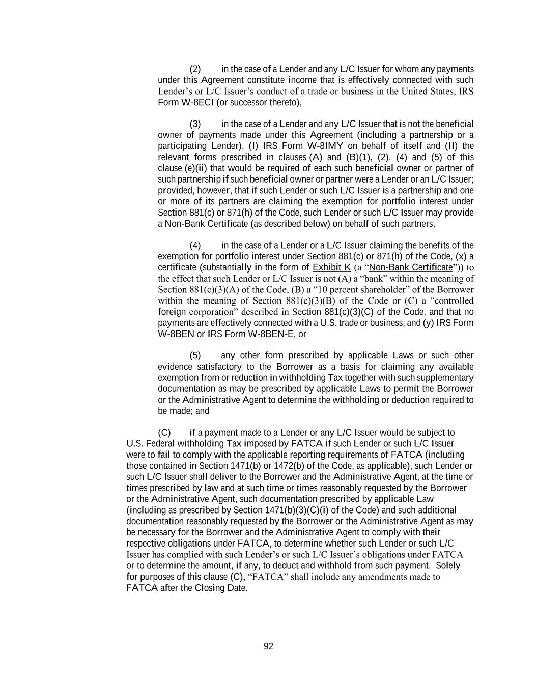 92(2)就贷款人及任何根据本协议支付的任何款项构成与该贷款人或信用证发行人在美国进行贸易或业务有效相关的收入的任何信用证发行人而言,IRS表格W-8ECI(或其继承者),(3)就贷款人及任何并非根据本协议支付款项的实益拥有人(包括合伙企业或参与贷款人)的信用证发行人而言,(i)代表其本身的IRS表格W-8IMY及(ii)条款(a)及(b)(1)、(2)所订明的有关表格,(4)及本(e)(ii)条第(5)款的规定,如该等合伙的每名该等实益拥有人或合伙人为贷款人或信用证发行人,则该等实益拥有人或合伙人须作出规定;但如该等贷款人或该等信用证发行人为合伙,而其一名或多于一名合伙人根据《守则》第881(c)或871(h)条申索投资组合权益的豁免,则该贷款人或该信用证发行人可代表该等合伙人提供非银行证明(如下所述),(4)如贷款人或信用证发行人根据《守则》第881(c)或871(h)条申索投资组合权益豁免的利益,(x)一份证明(基本上以附件TERM0 K(“非银行证明”)的形式),大意是该贷款人或信用证发行人不是(a)《守则》第881(c)(3)(a)条所指的“银行”,(b)《守则》第881(c)(3)(b)条所指的借款人的“10%股东”或(c)《守则》第881(c)(3)(c)条所述的“受控外国公司”,并且没有任何付款与美国贸易或业务有效关联,以及(y)IRS表格W-8BEN或IRS表格W-8BEN-E,(5)适用法律订明的任何其他表格或借款人满意的其他证据,作为申索任何可用的预扣税豁免或减免的依据,连同适用法律订明的补充文件,以允许借款人或行政代理人确定所需的预扣或扣除;及(c)如向贷款人或任何信用证发行人支付的款项将须缴纳FATCA征收的美国联邦预扣税如该贷款人或该信用证发行人未能遵守FATCA的适用报告要求(包括《守则》第1471(b)或1472(b)节(如适用)所载的要求),该贷款人或该信用证发行人应在法律规定的时间以及借款人或行政代理人合理要求的时间或时间向借款人和行政代理人交付,适用法律规定的此类文件(包括《守则》第1471(b)(3)(c)(i)节规定的)以及借款人或行政代理人为借款人和行政代理人遵守各自在FATCA下的义务而可能需要的合理要求的额外文件,以确定该贷款人或该信用证发行人是否遵守了该贷款人或该信用证发行人在FATCA下的义务,或确定从该付款中扣除和扣留的金额(如有)。仅就本条款(c)而言,“FATCA”应包括在截止日期之后对FATCA所做的任何修订。